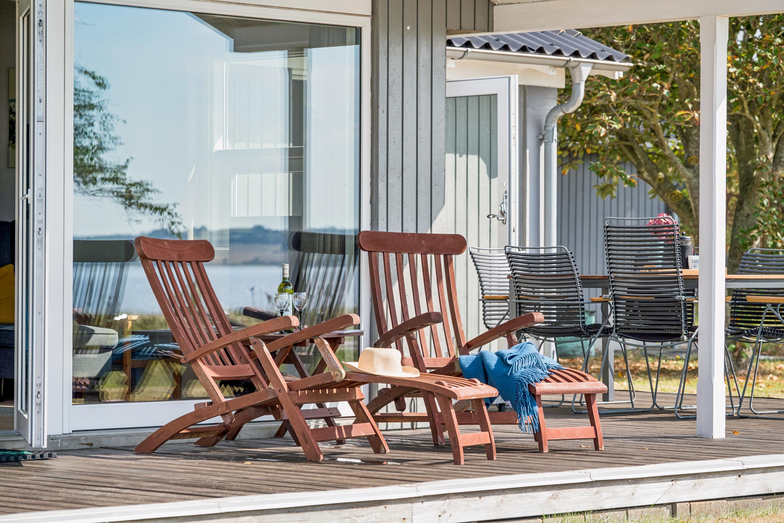 Schönes, geräumiges und helles Ferienhaus in herrlicher Lage am Rande der Halbinsel Helgenæs mit Panoramablick auf die Bucht Begtrup Vig und nur 75 m vom Strand entfernt. Nach Westen gewandte und teilweise überdachte Holzterrasse mit Zugang vom Wohnzimmer sowie große, nach Osten gewandte Fliesenterrasse mit Carport, der in einen geschlossenen Terrassenbereich mit Panoramafenstern zum Wasser umgebaut wurde. Gartenmöbel, Liegestühle, Sonnenschirm und Grill sind vorhanden.