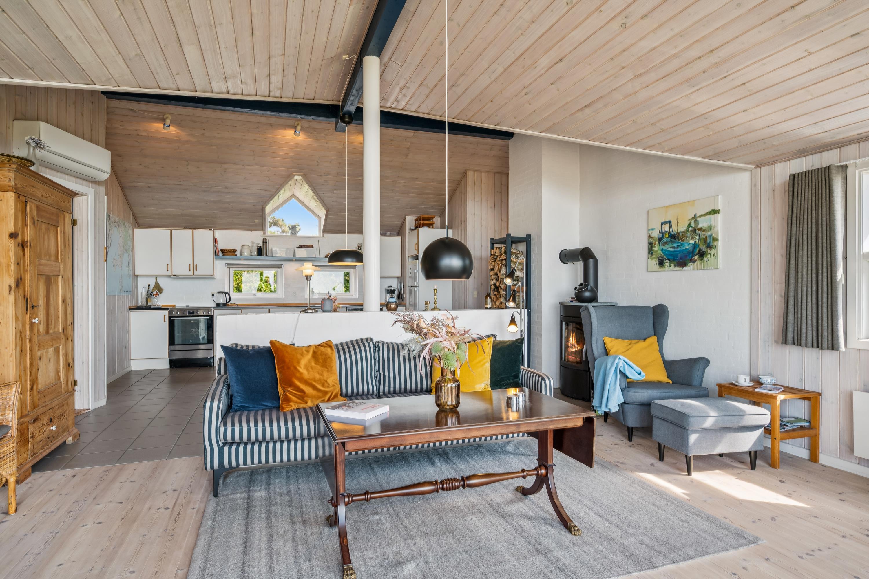 Die bis zum Dachfirst offene Bauweise des Hauses sorgt für ein helles und großzügiges Raumgefühl. Überaus gemütliches Wohnzimmer mit Panoramafenstern zum Wasser, Kaminofen, TV mit dänischen (inkl. TV2) und deutschen Programmen sowie Essbereich für sechs Personen. In offener Verbindung dazu liegt die gut ausgestattete Küche mit viel Arbeitsfläche, Glaskeramikherd, Kühl-/Gefrierkombination, Geschirrspüler und Mikrowelle. Die insgesamt sechs Schlafplätze verteilen sich auf drei schöne Schlafzimmer mit Doppelbett, davon zwei mit Meeresblick und Zugang zur Terrasse. Großes Badezimmer mit Dusche und Fußbodenheizung. Waschküche mit Waschmaschine, Bügelbrett und Bügeleisen. Internetzugang.