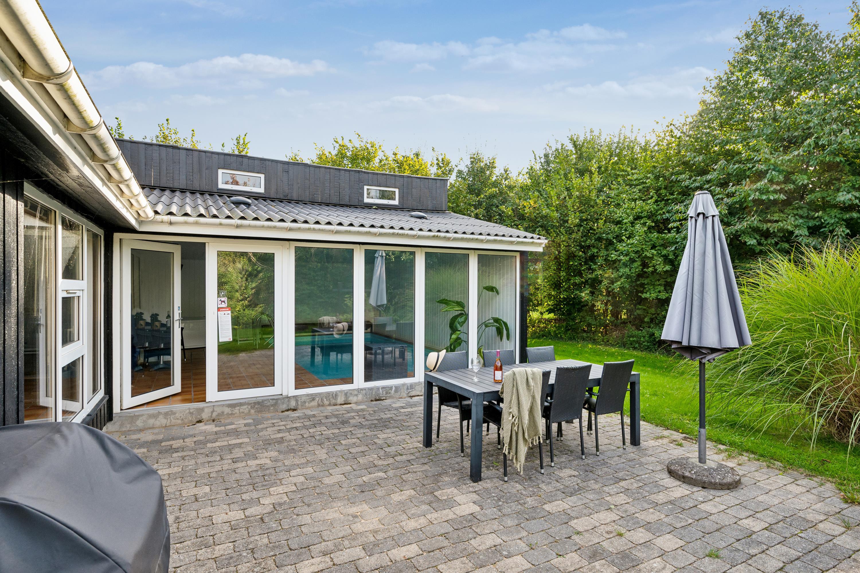 Modernes Poolsommerhaus mit Whirlpool und Sauna auf großem Naturgrundstück in Knebel, Dänemark.