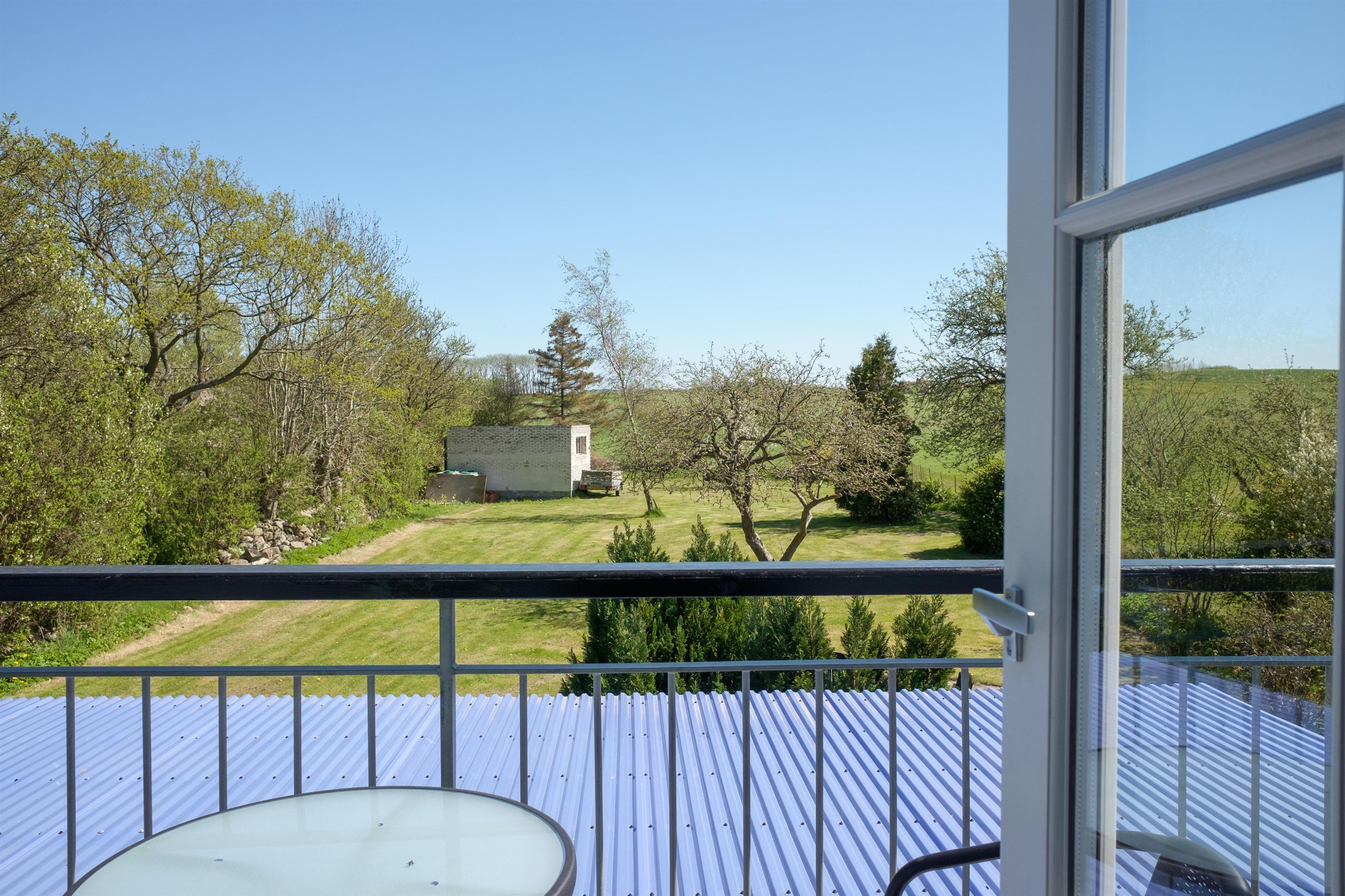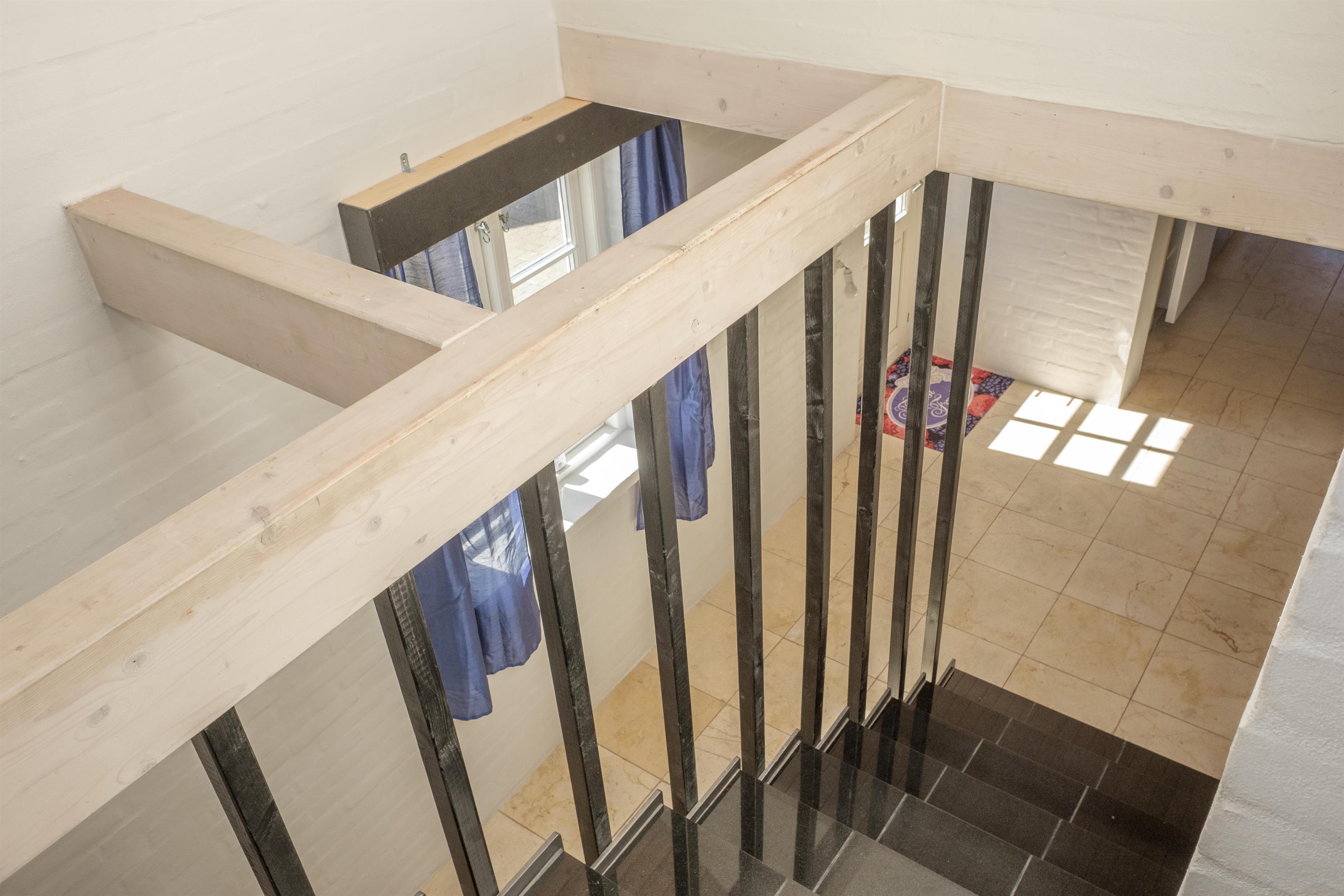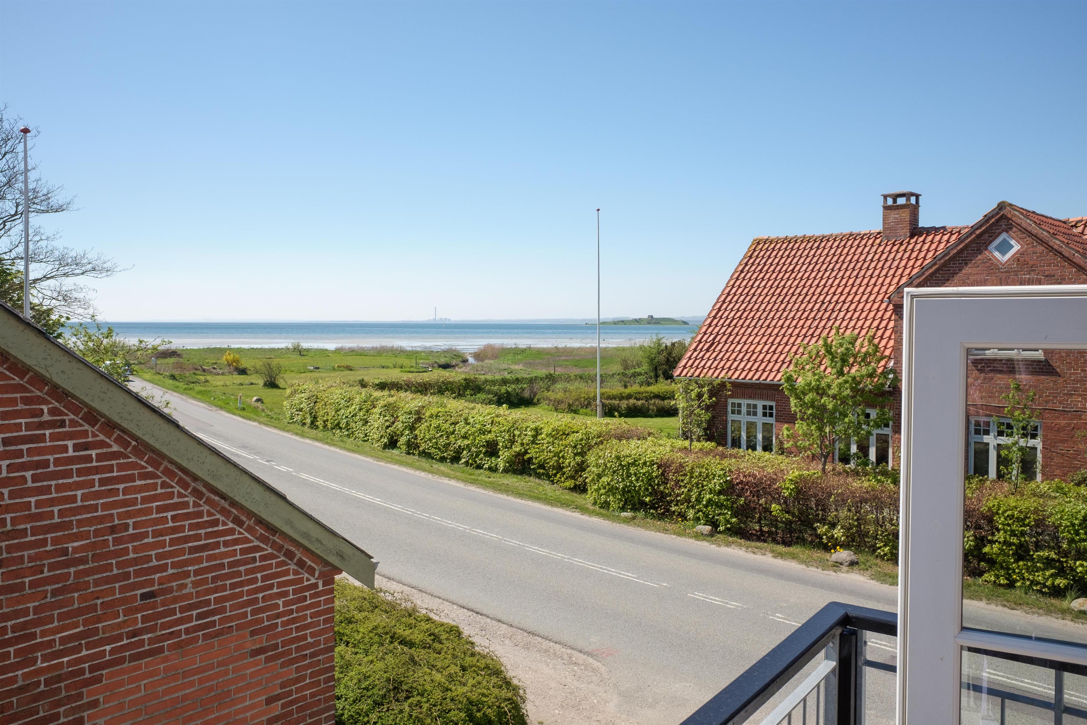 Im 1. Stock befinden sich vier Zimmer: drei mit Einzelbetten sowie eines mit Doppelbett und Ausgang zum Balkon mit Aussicht auf die Kalø Vig. Außerdem gibt es einen Gemeinschaftsraum, ein großes Badezimmer und ein Walk In Closet.