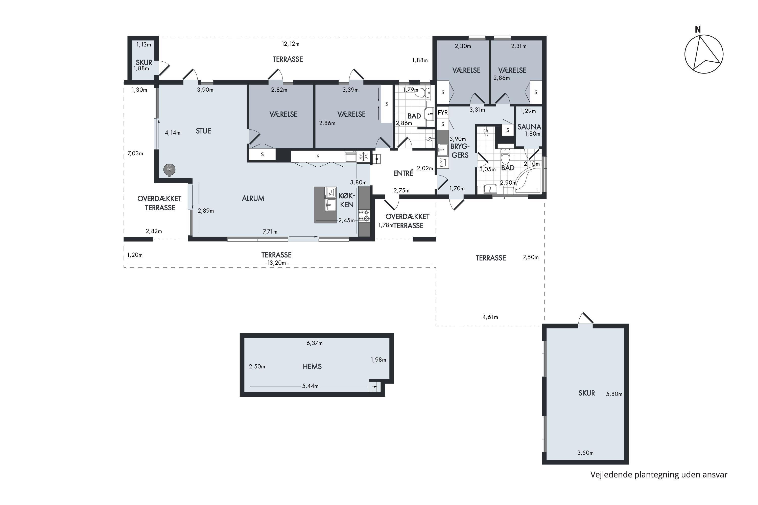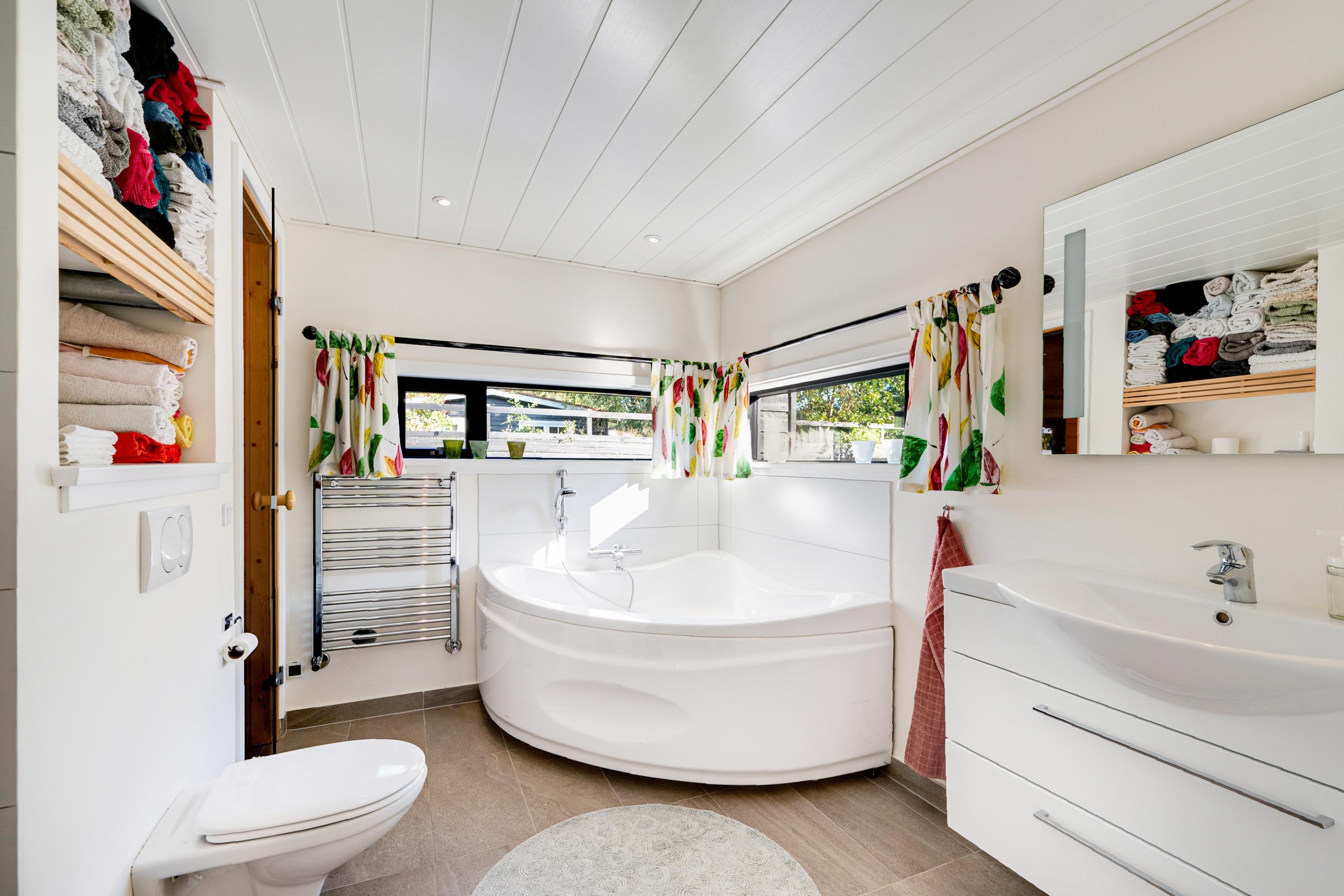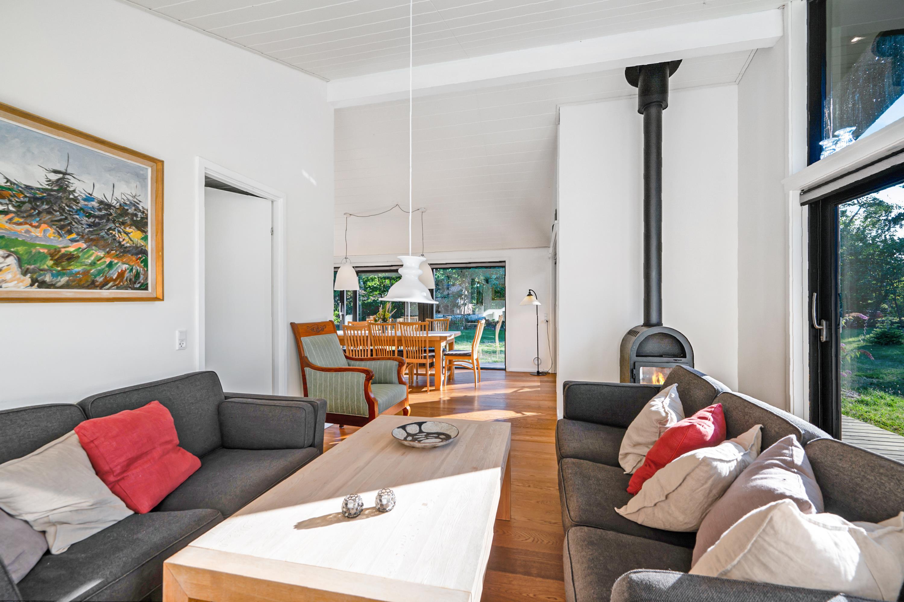 Vom Eingangsbereich kommt man in das große, helle Wohn-/Esszimmer in offener Verbindung zur Küche. Der Wohnbereich ist mit bequemer Sitzecke, Kaminofen, TV mit dänischen (inkl. TV2) und deutschen Programmen, CD-Player sowie Radio ausgestattet. Schöner Essbereich mit Platz für zehn Personen und schicke Küche mit viel Arbeitsfläche, die mit großem Glaskeramik-Kochfeld, Backofen, Kühl-/Gefrierkombination, Geschirrspüler und Mikrowelle ausgestattet ist. Die acht Schlafplätze verteilen sich auf vier gute und helle Schlafzimmer – zwei mit Doppelbett und zwei mit französischem Bett und Hochbett. Außerdem gibt es zwei Schlafplätze auf einem Hängeboden mit Zugang vom Wohnzimmer. Zwei große Badezimmer mit Zugang von der Waschküche bzw. vom Eingangsbereich, beide mit Dusche und Fußbodenheizung. Das eine Badezimmer ist zudem mit Badewanne ausgestattet und hat Zugang zur Sauna. Geräumige und praktische Waschküche mit Waschmaschine und viel Stauraum. Für die Kleinsten ist ein Hochstuhl vorhanden. Internetzugang.