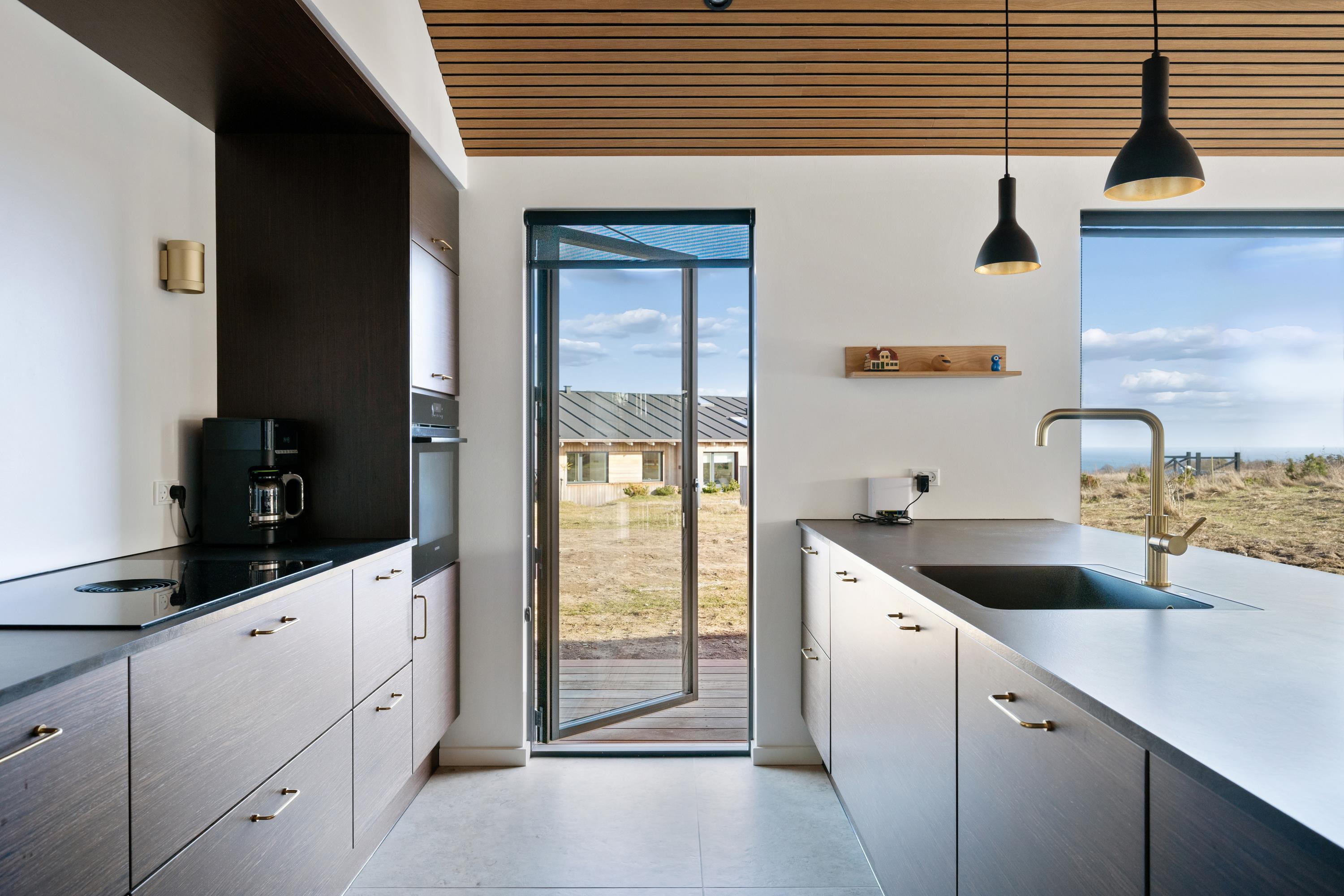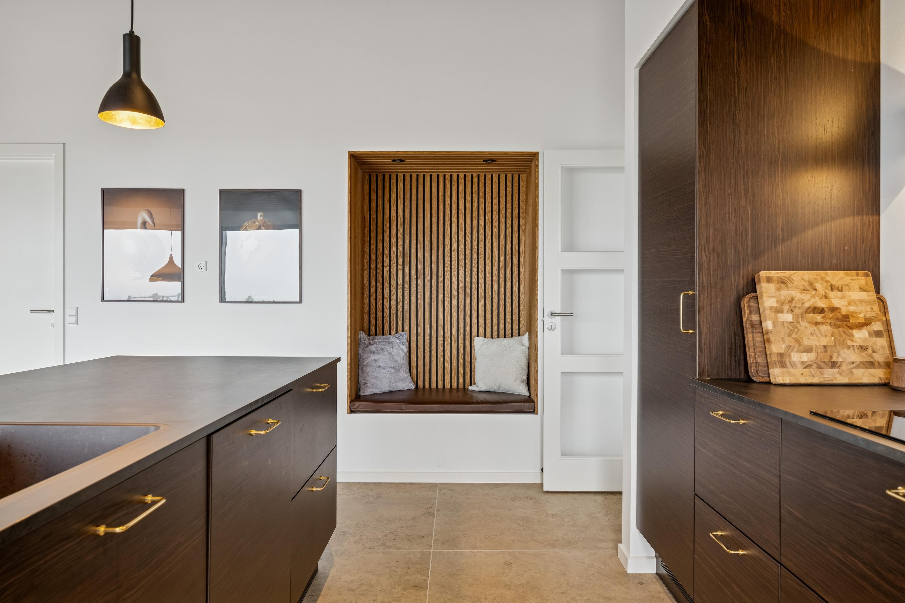 Das Herz des Hauses ist der helle und offene Küchen- und Essbereich, in dem sich alle zum Kochen, Essen und Beisammensein treffen können. Währenddessen lädt eine gemütliche Alkove zum Entspannen ein. Von der Küche aus haben Sie direkten Zugang zur Terrasse mit wunderschönem Blick auf das Wasser.