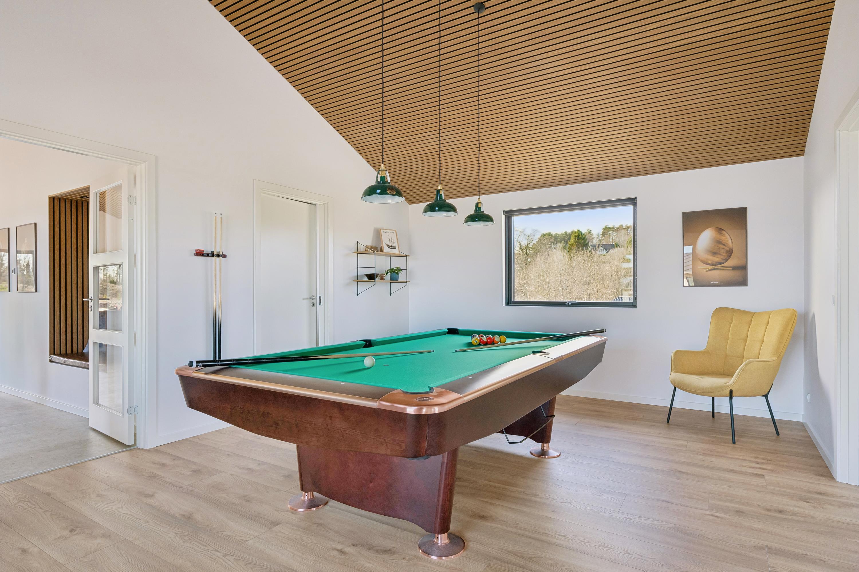 Schon beim Betreten des Hauses werden Sie in einer großzügigen Eingangshalle mit Platz für Schuhe und Jacken empfangen. Von hier gelangen Sie in den großen Aktivitätsraum mit gemütlicher Sitzecke, großem Fernseher und Billardtisch – ideal für gesellige Stunden mit Familie oder Freunden.