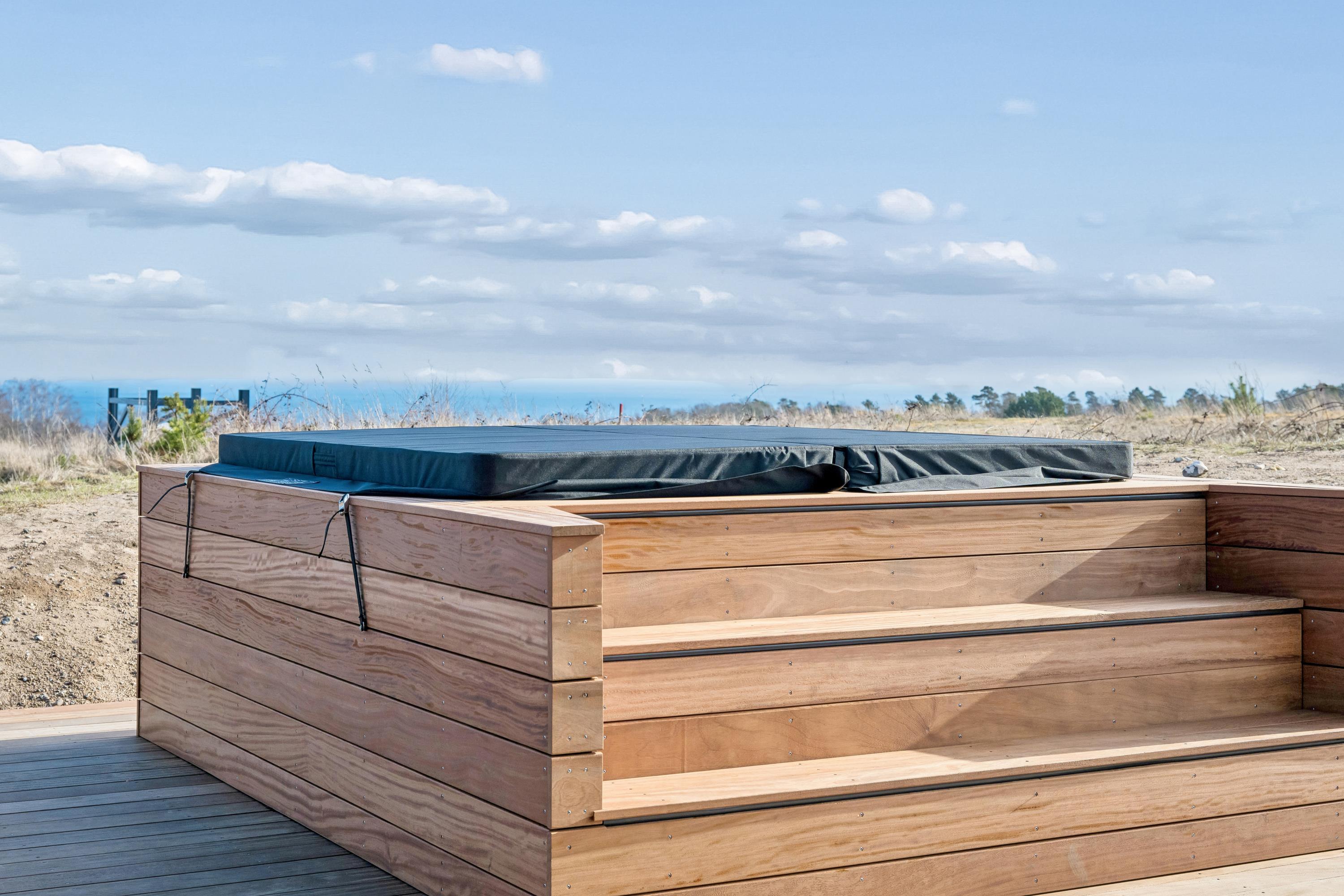 Angrenzend befindet sich das geschmackvoll eingerichtete Wohnzimmer mit komfortablen Möbeln. Von hier aus gelangen Sie auf eine überdachte Terrasse mit Loungemöbeln, wo Sie den Urlaub im Außen-Spa und unter der Außendusche genießen können.