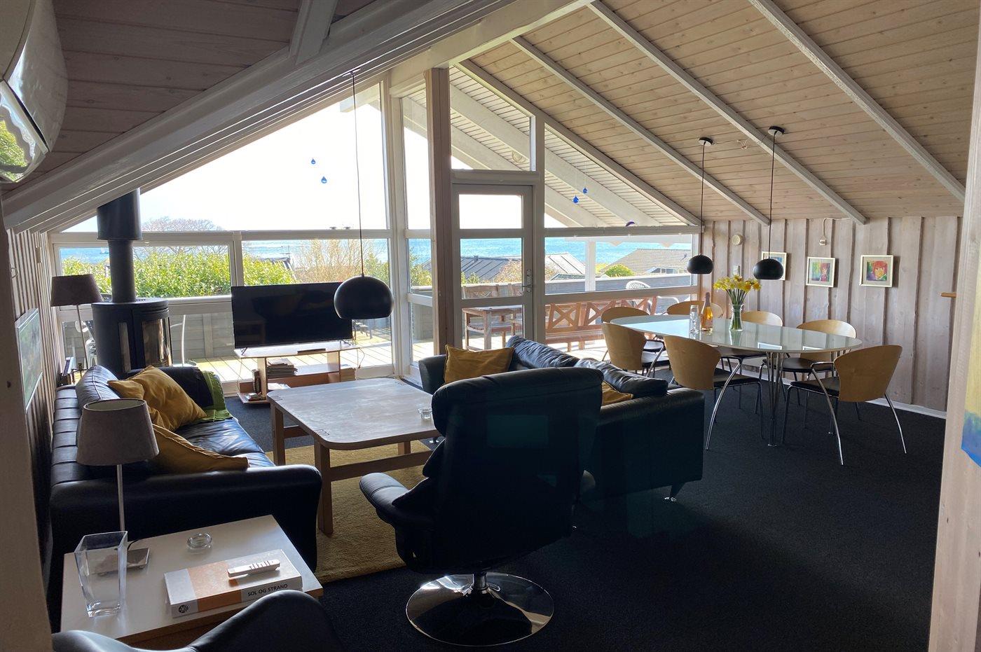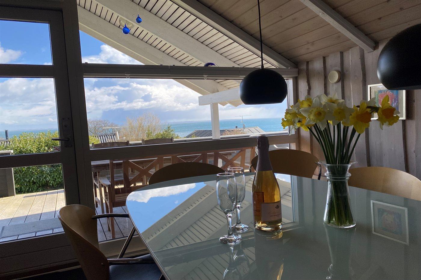 Ein hoch gelegenes Ferienhaus mit herrlichem Meeresblick sowohl vom Haus als auch vom Grundstück. Das Haus liegt auf einem leicht schrägenden Grundstück, in einem ruhigen Ferienhausgebiet, dicht an einem Badestrand.