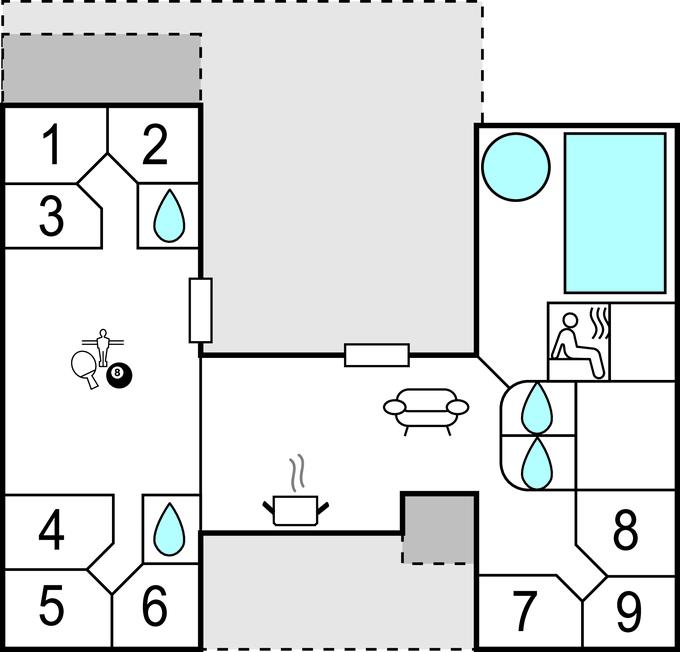 Vergnügen Sie sich im Aktivïtätsraum bei einer Runde Dart, Billard oder Tischtennis oder erholen Sie sich im Wellnessbereich mit Sauna, Swimmingpool und einem haut- und atemwegsfreundlichen Salzwasserpool. Hier finden Groß und Klein einen Ort für sich, ob Sie auf Unterhaltung oder Entspannung aus sind.