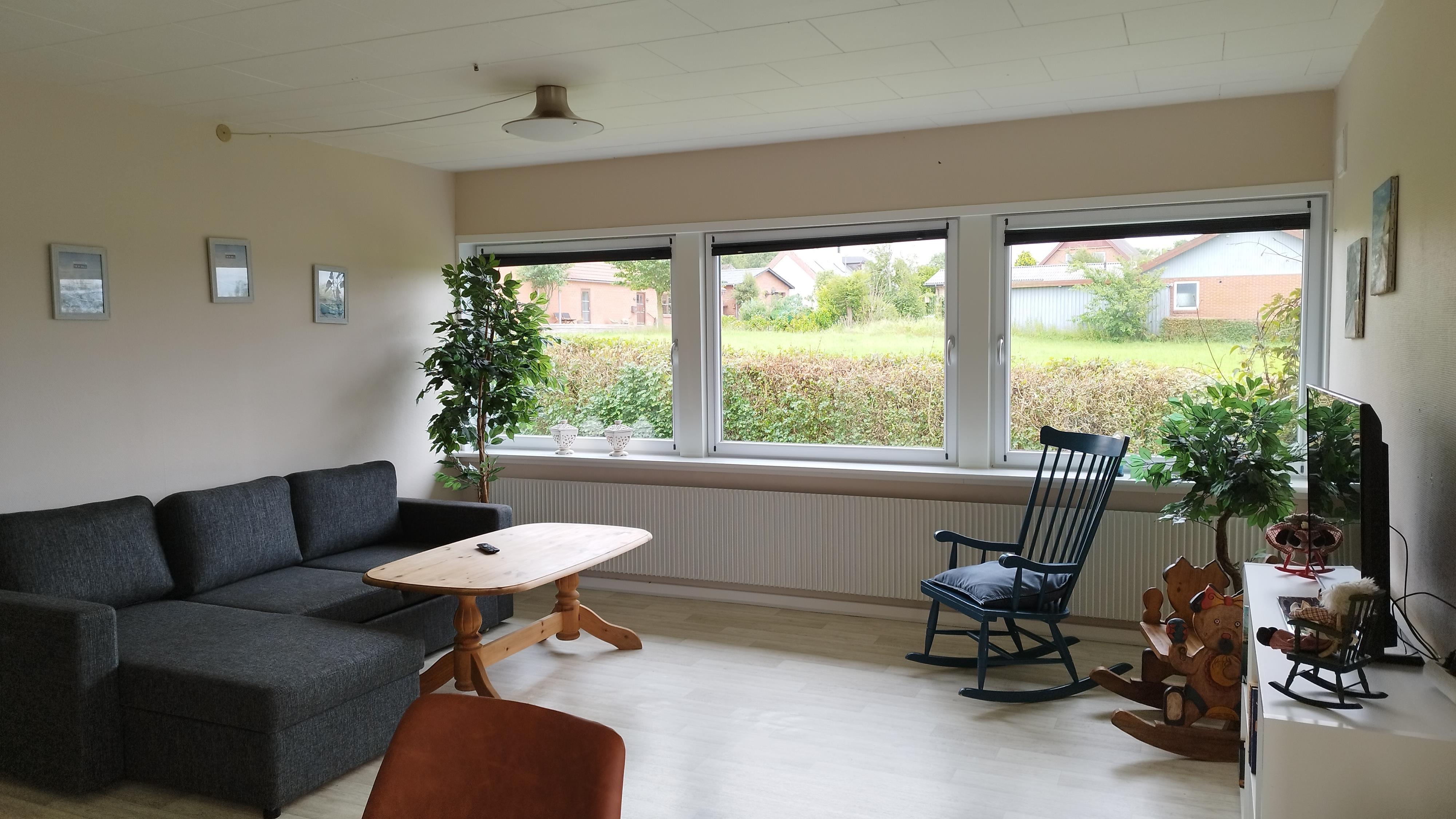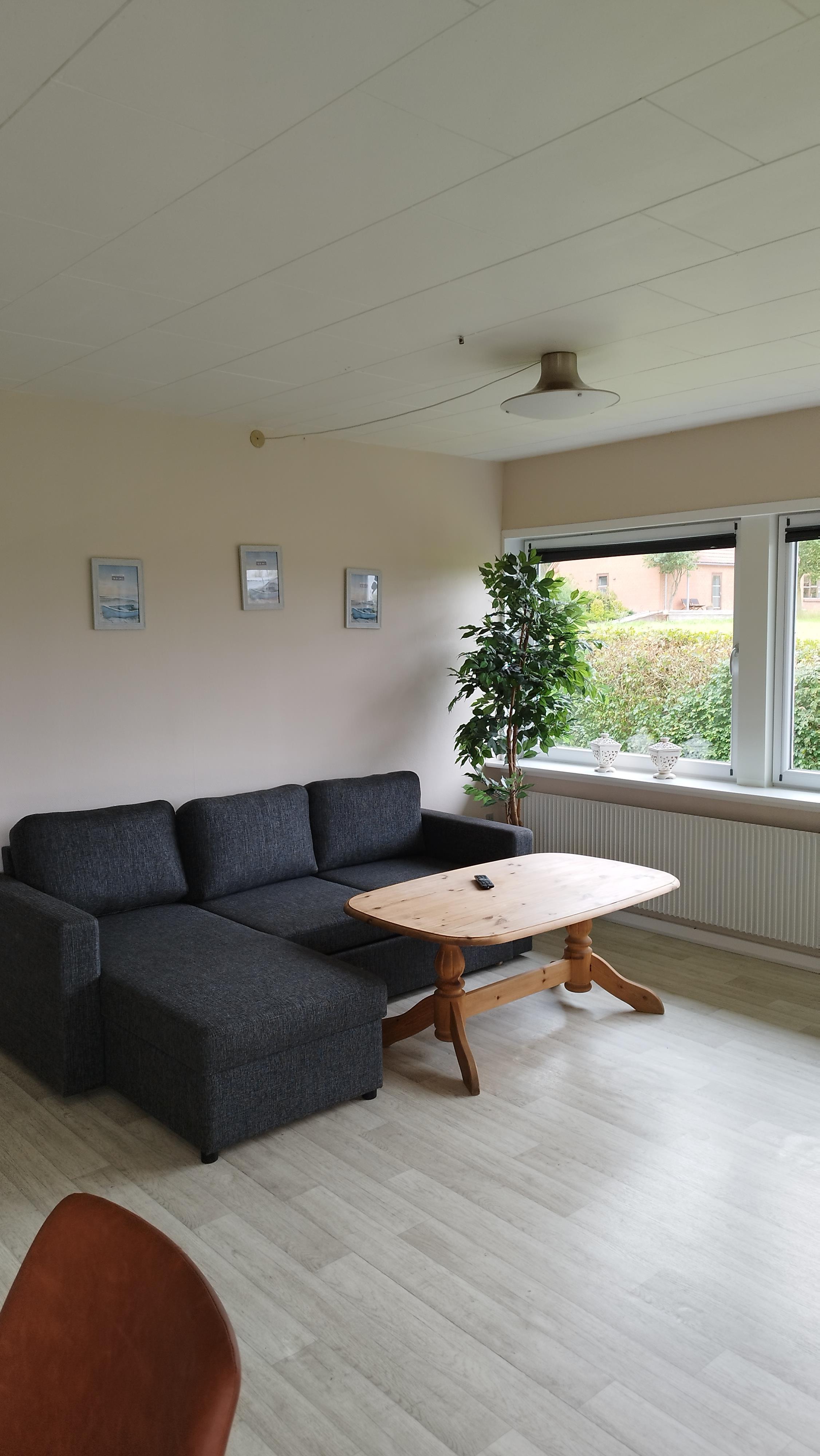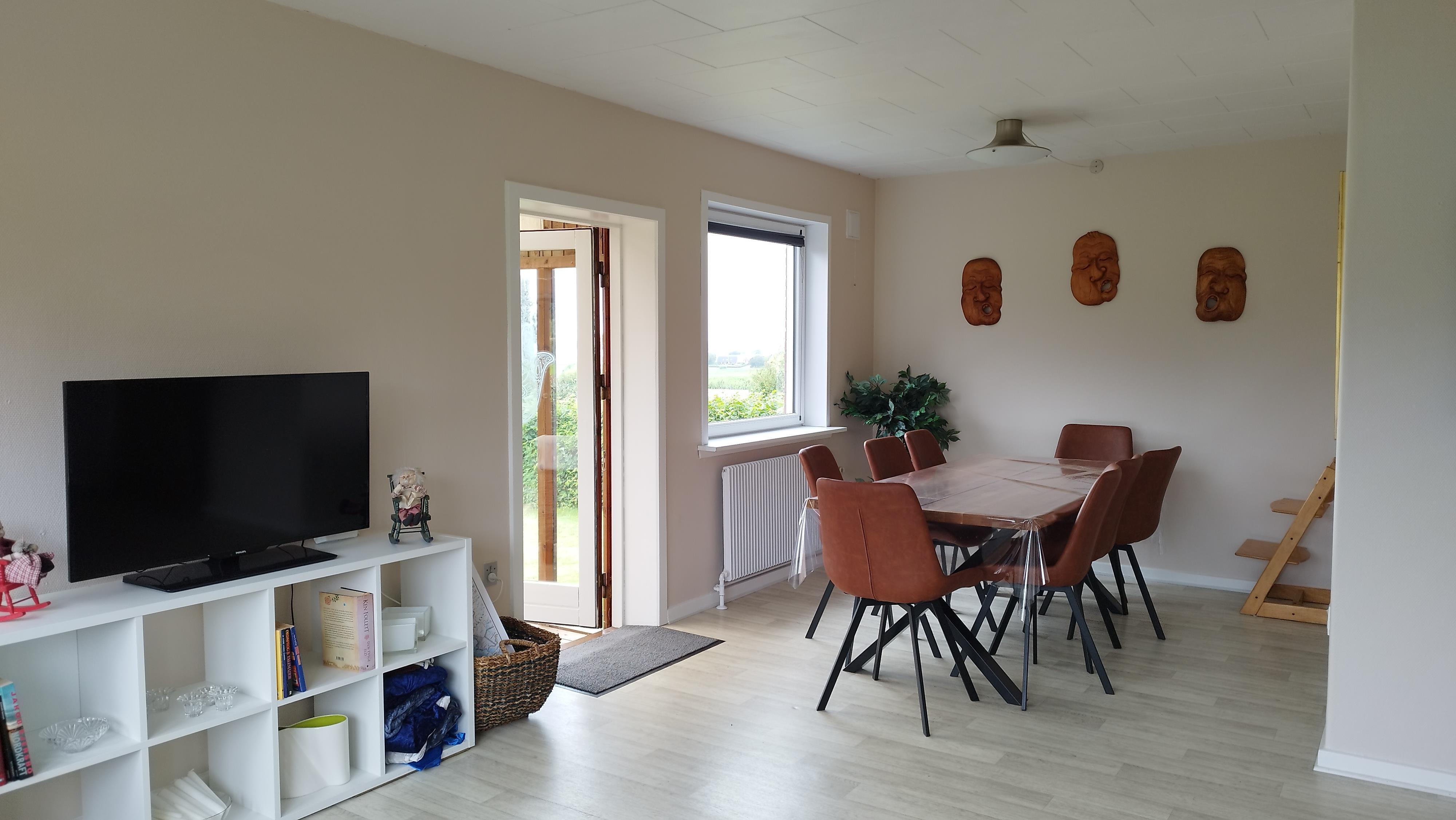 Im Inneren erwartet Sie eine helle und einladende Atmosphäre. Es gibt drei Schlafzimmer – eines mit Doppelbett, eines mit Einzelbett und eines mit Etagenbett – sowie ein Schlafsofa im Wohnzimmer, das zusätzliche Übernachtungsmöglichkeiten bietet. Der Wohnbereich ist mit einer gemütlichen Fernsehecke und einem Essbereich ausgestattet, und die voll ausgestattete Küche ermöglicht es, Mahlzeiten in vertrauter Umgebung zuzubereiten. Ein Hauswirtschaftsraum mit Waschmaschine und Trockner sorgt für zusätzlichen Komfort, und ein kleiner Fitnessraum mit Blick auf Felder und Fjord lädt zum Trainieren mit Aussicht ein.