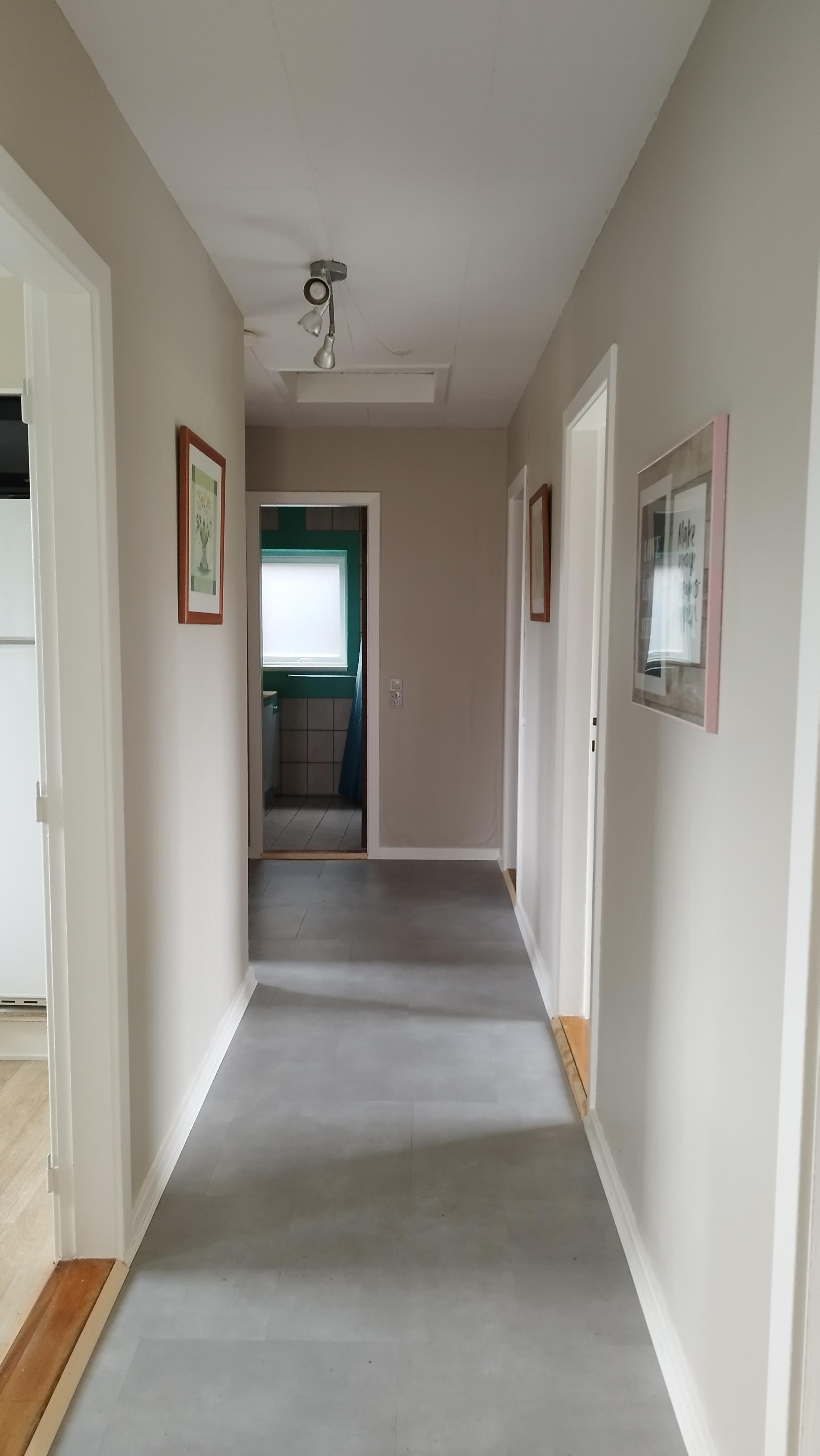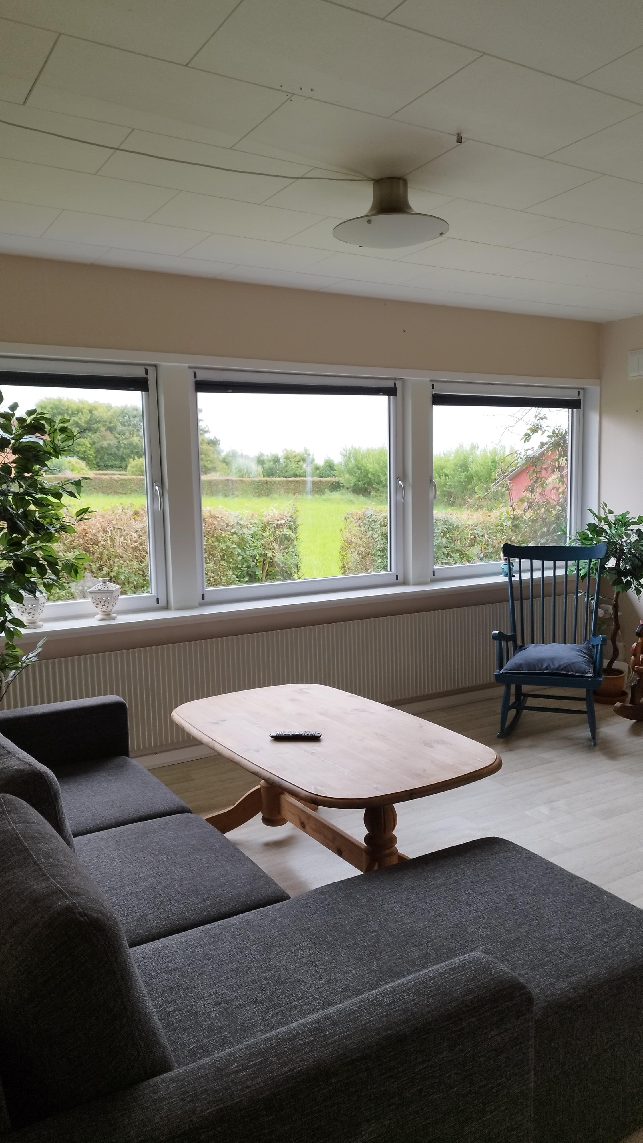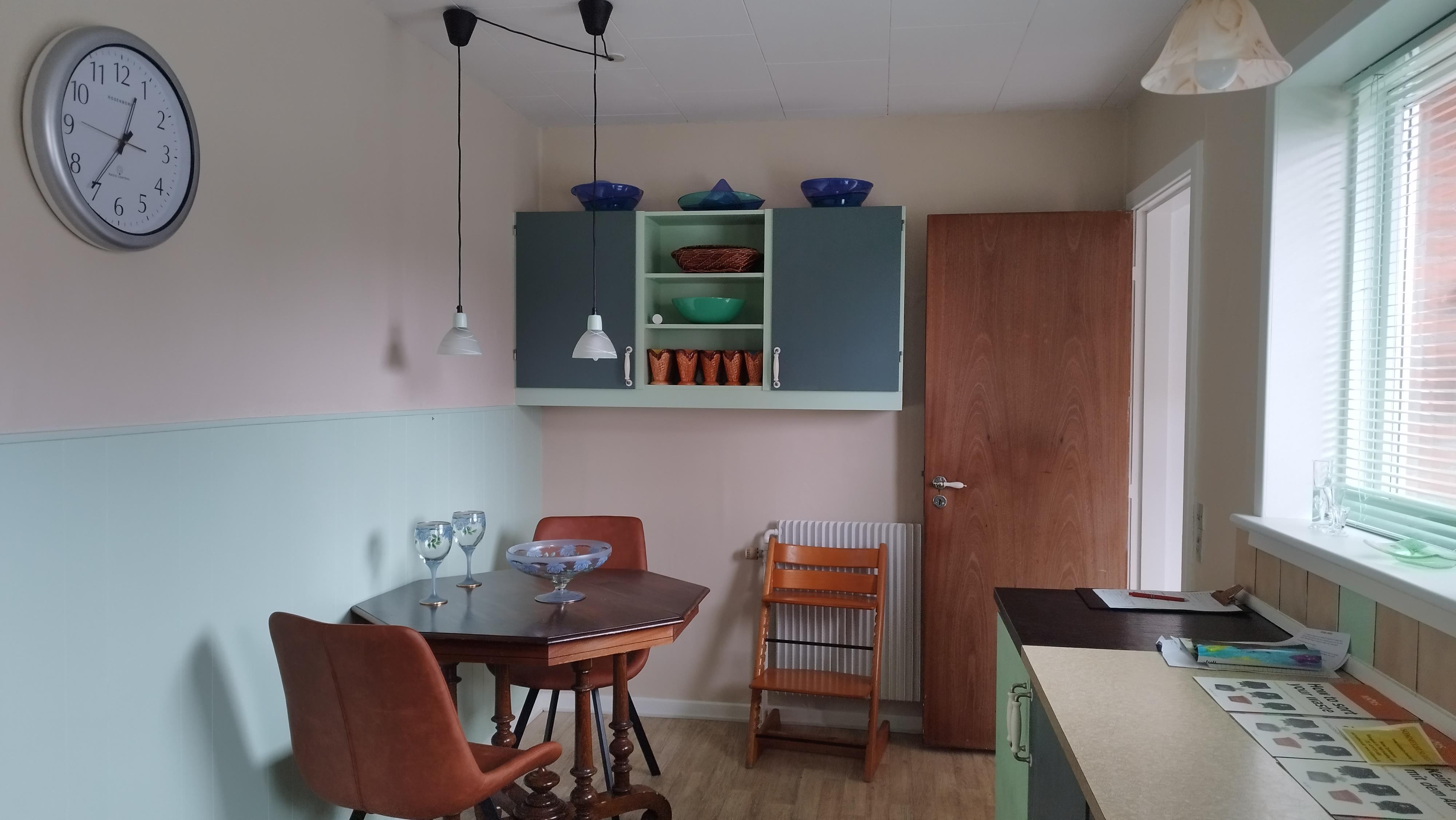 Im Inneren erwartet Sie eine helle und einladende Atmosphäre. Es gibt drei Schlafzimmer – eines mit Doppelbett, eines mit Einzelbett und eines mit Etagenbett – sowie ein Schlafsofa im Wohnzimmer, das zusätzliche Übernachtungsmöglichkeiten bietet. Der Wohnbereich ist mit einer gemütlichen Fernsehecke und einem Essbereich ausgestattet, und die voll ausgestattete Küche ermöglicht es, Mahlzeiten in vertrauter Umgebung zuzubereiten. Ein Hauswirtschaftsraum mit Waschmaschine und Trockner sorgt für zusätzlichen Komfort, und ein kleiner Fitnessraum mit Blick auf Felder und Fjord lädt zum Trainieren mit Aussicht ein.