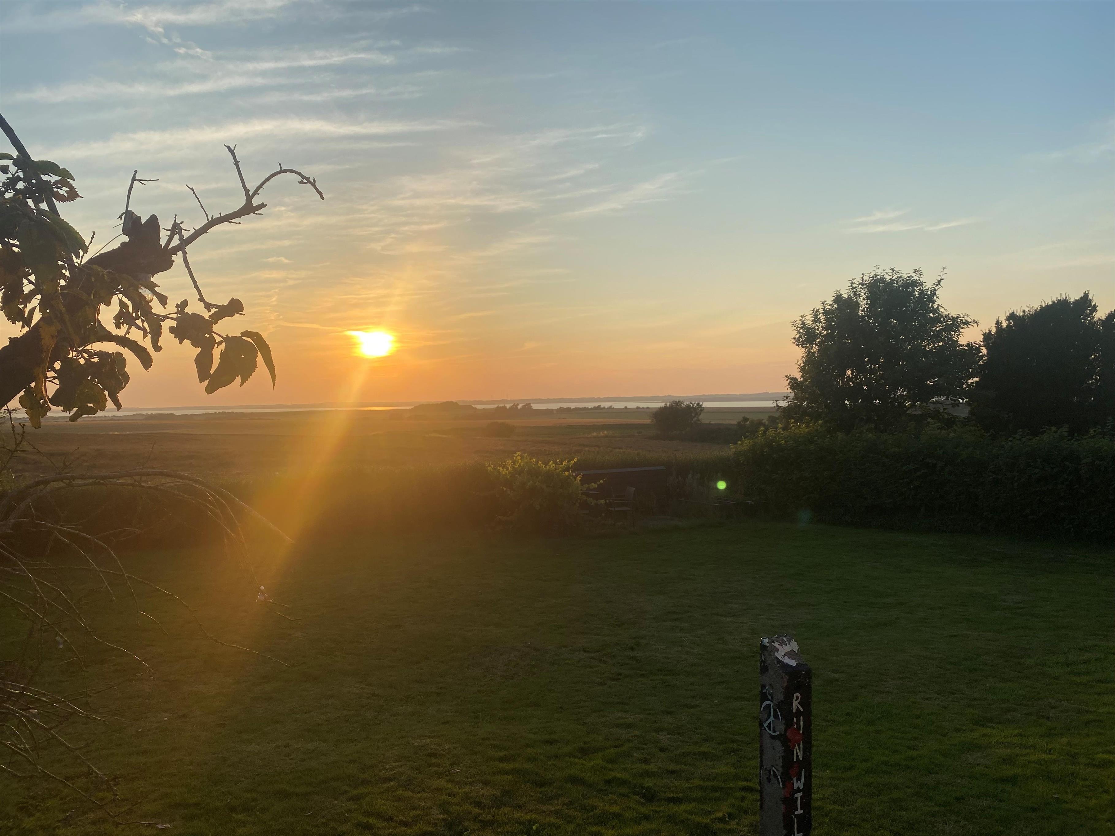 Draußen erwartet Sie eine überdachte Terrasse mit Gartenmöbeln – perfekt für den Morgenkaffee oder das Abendessen mit Blick auf die weite Landschaft und das Wasser am Horizont. Der Garten bietet eine großzügige Rasenfläche, einen Spielbereich für Kinder und eine gemütliche Feuerstelle – ideal für gesellige Abende unter dem Sternenhimmel.