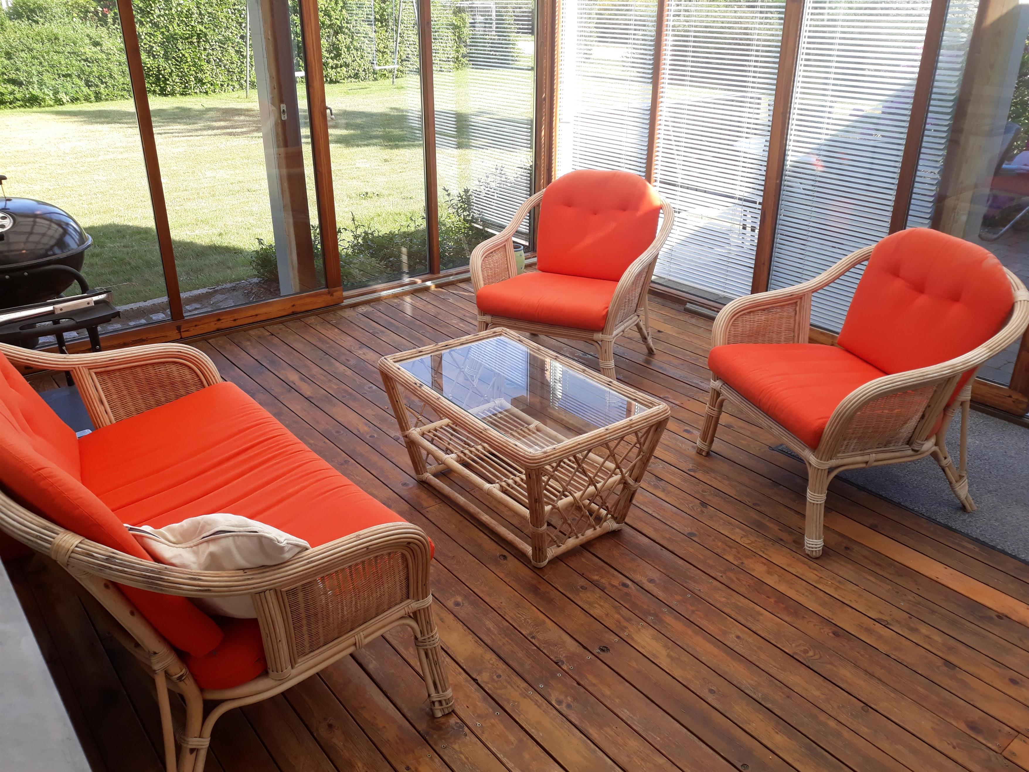 Schönes Ferienhaus von 65m2 in Gasbeton gebaut und mit einem schönen Wintergarten. Das Haus liegt auf 1.300m2 Gartengrundstück und befindet sich im Ørding Feriendorf. Das Haus enthält 3 Zimmer. 1 mit Doppelbett und 2 Zimmer mit Etagenbetten. Neben dem Wohnzimmer gibt es auch eine schöne Terrasse mit Gartenmöbeln. Kostenloses Wi-Fi. Es gibt einen Carport für das Auto. Das Haus ist nahe am Strand mit Badebrücke und es gibt gute Wandermöglichkeiten in der Umgebung.