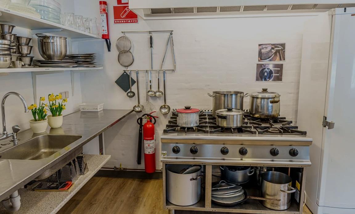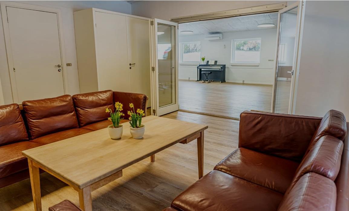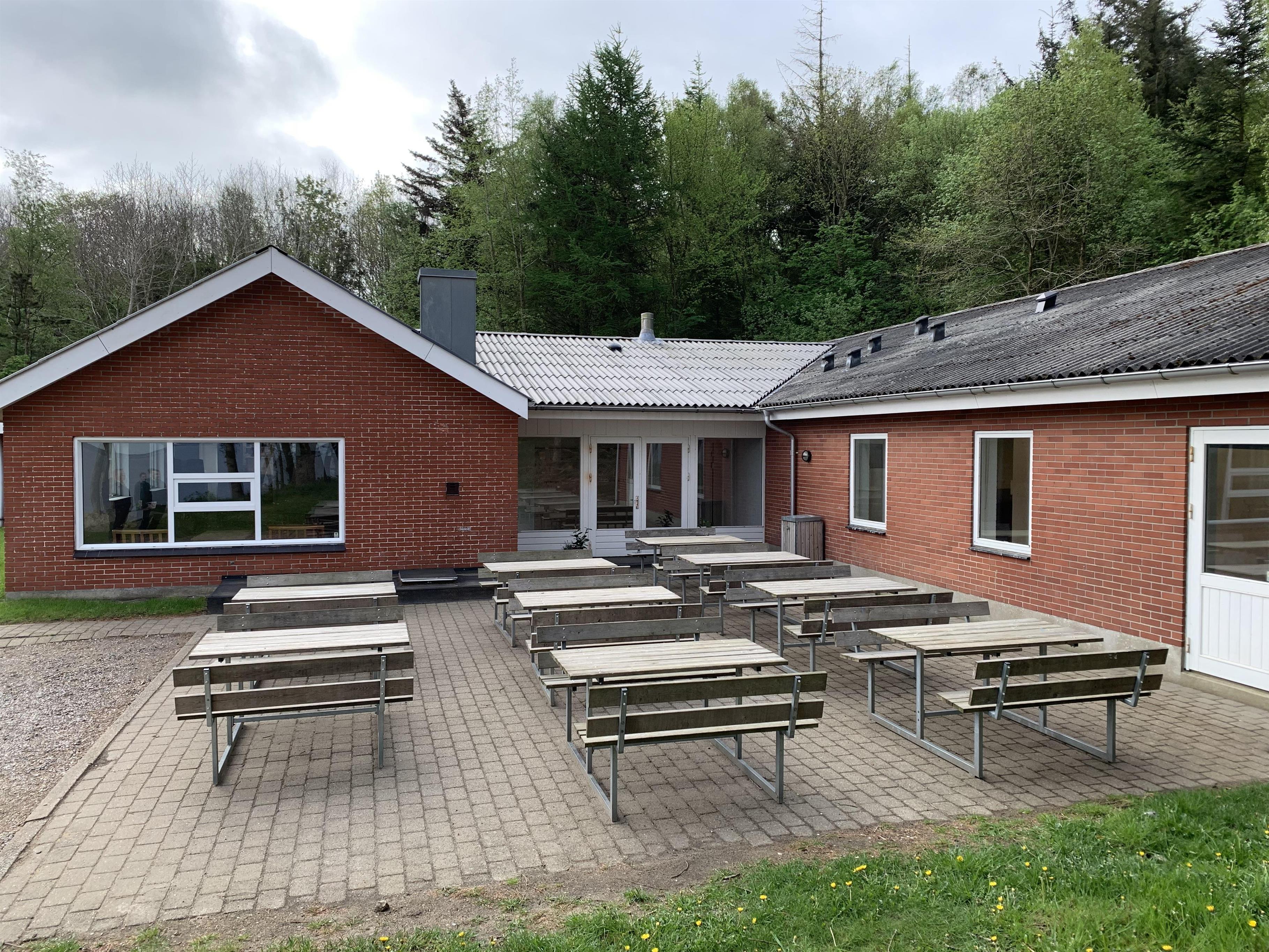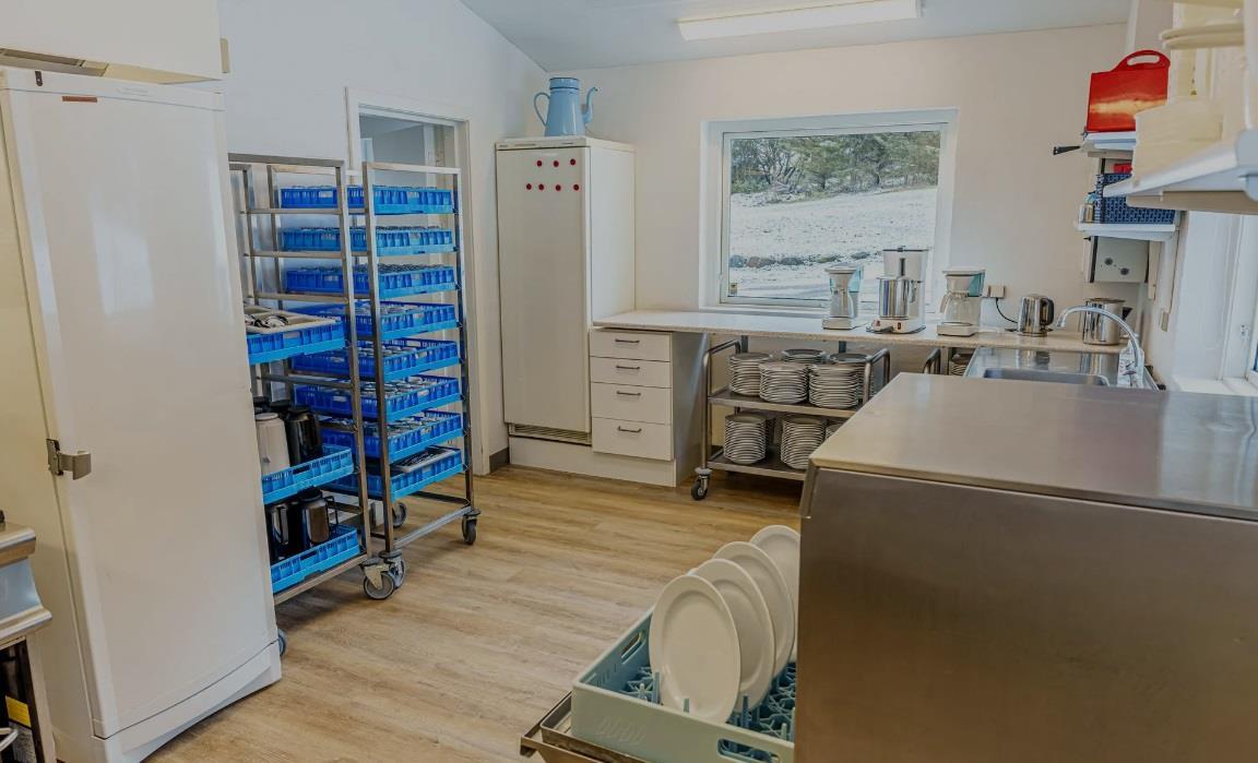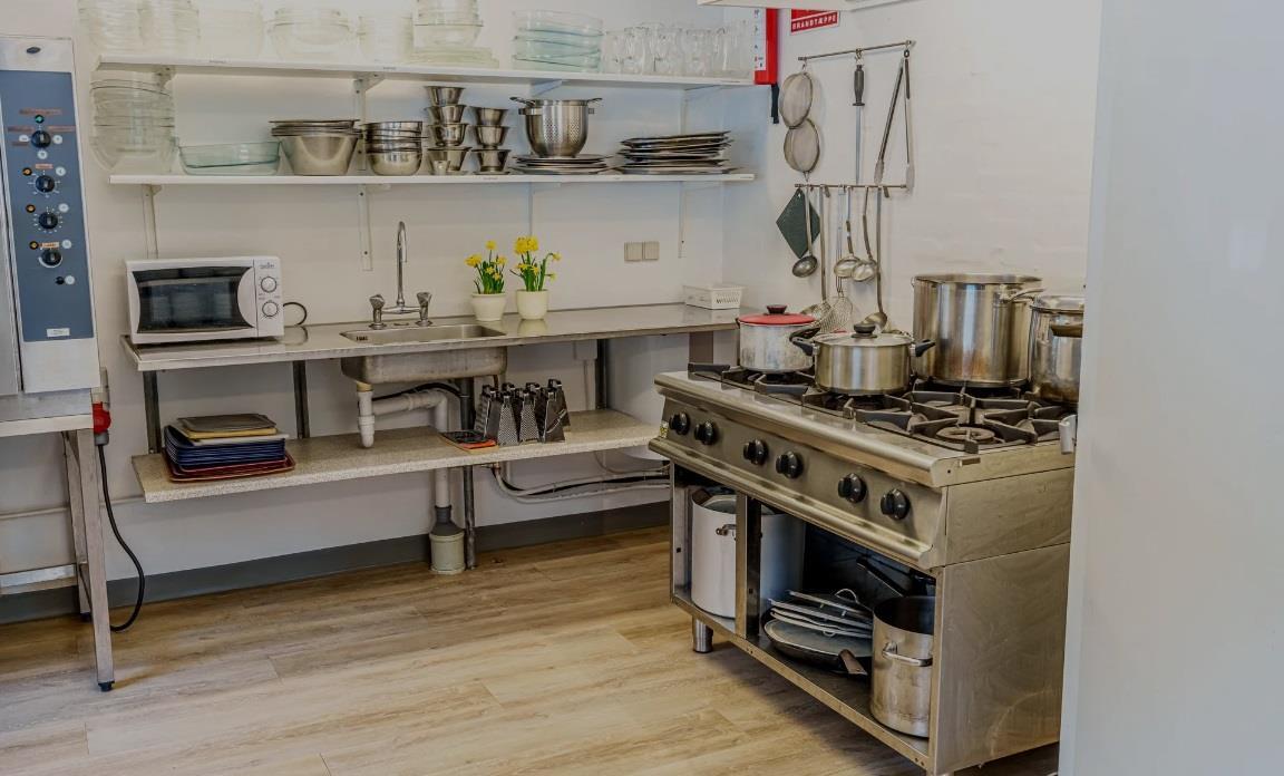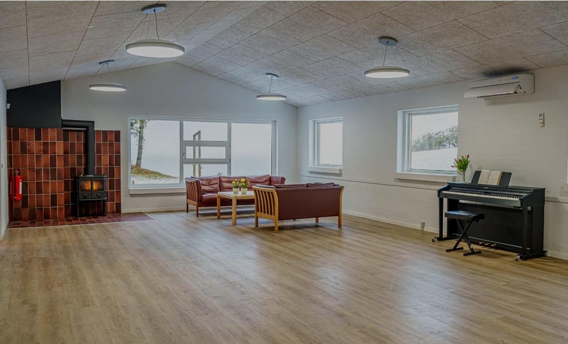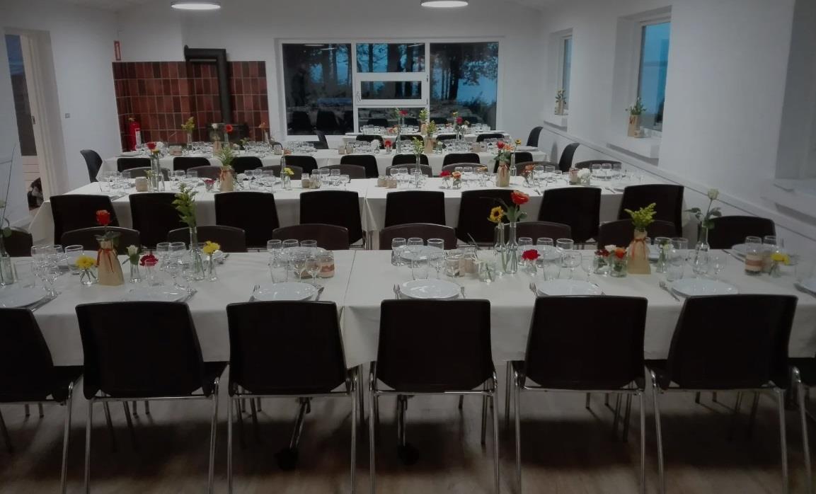 Im großen Raum gibt es einen Kaminofen, eine kleine Sofagruppe und leicht verschiebbare Tische mit Stühlen für ca. 90 Personen. Neben der Halle gibt es einen kleineren Raum mit einer Sofalandschaft und Schränken mit Weingläsern, zusätzlichen Küchengeräten und einem E-Piano. Die Küche enthält eine 24-Tassen-Kaffeemaschine und zwei normale 12-Tassen-Kaffeemaschinen, 2 Kühlschränke, eine Spülmaschine, einen 6-Flammen-Gasherd, einen Industrieofen und Geschirr für 100 Personen. Eine Gefriertruhe und ein Getränkekühlschrank befinden sich im Flur. Im Gebäude gibt es WLAN.