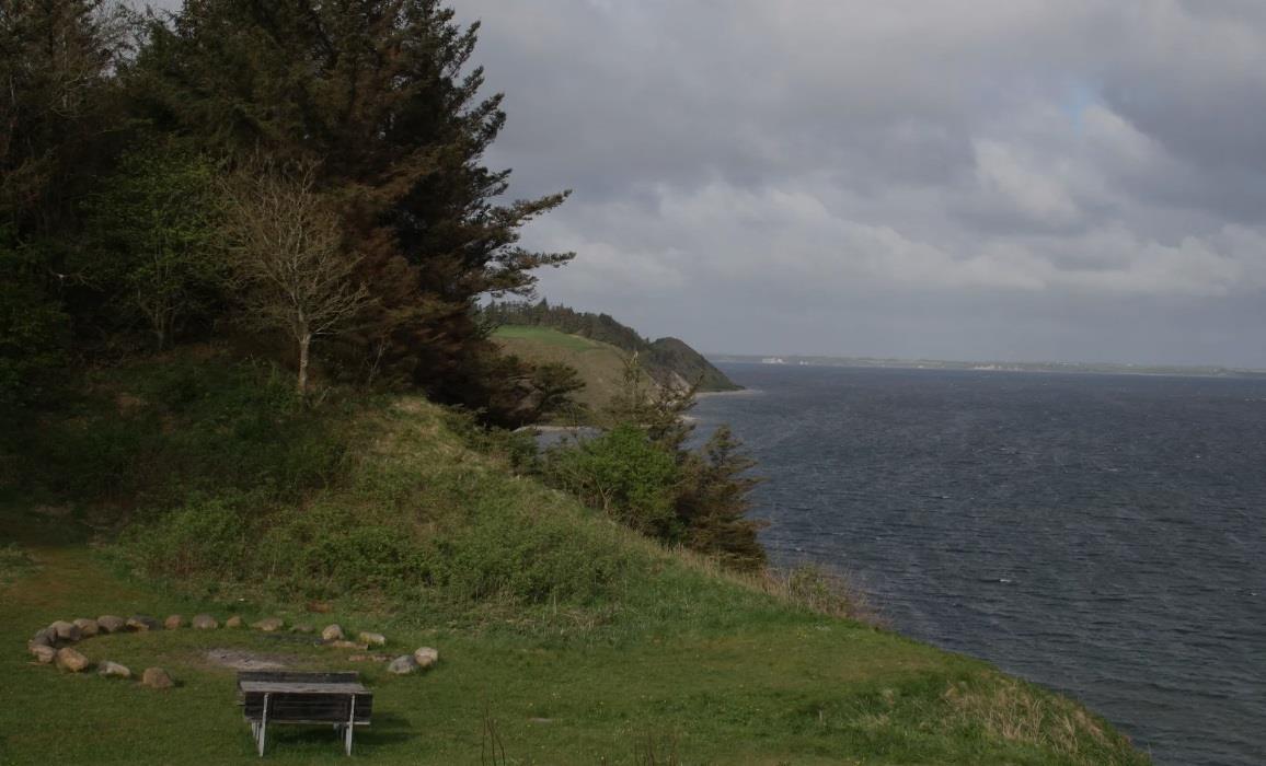 Es gibt 2 Lagerfeuerplätze, ein kleines Ballspielfeld unten in der Schlucht und den Zugang zum Strand über einen kleinen Pfad durch den Wald auf der linken Seite. Wenn Sie stattdessen 500 m nach rechts den Hang entlang gehen, finden Sie am Skibsted Strand einen Badesteg, an dem Sie schwimmen, mit einem Kajak anlegen oder anderen Wasseraktivitäten nachgehen können.