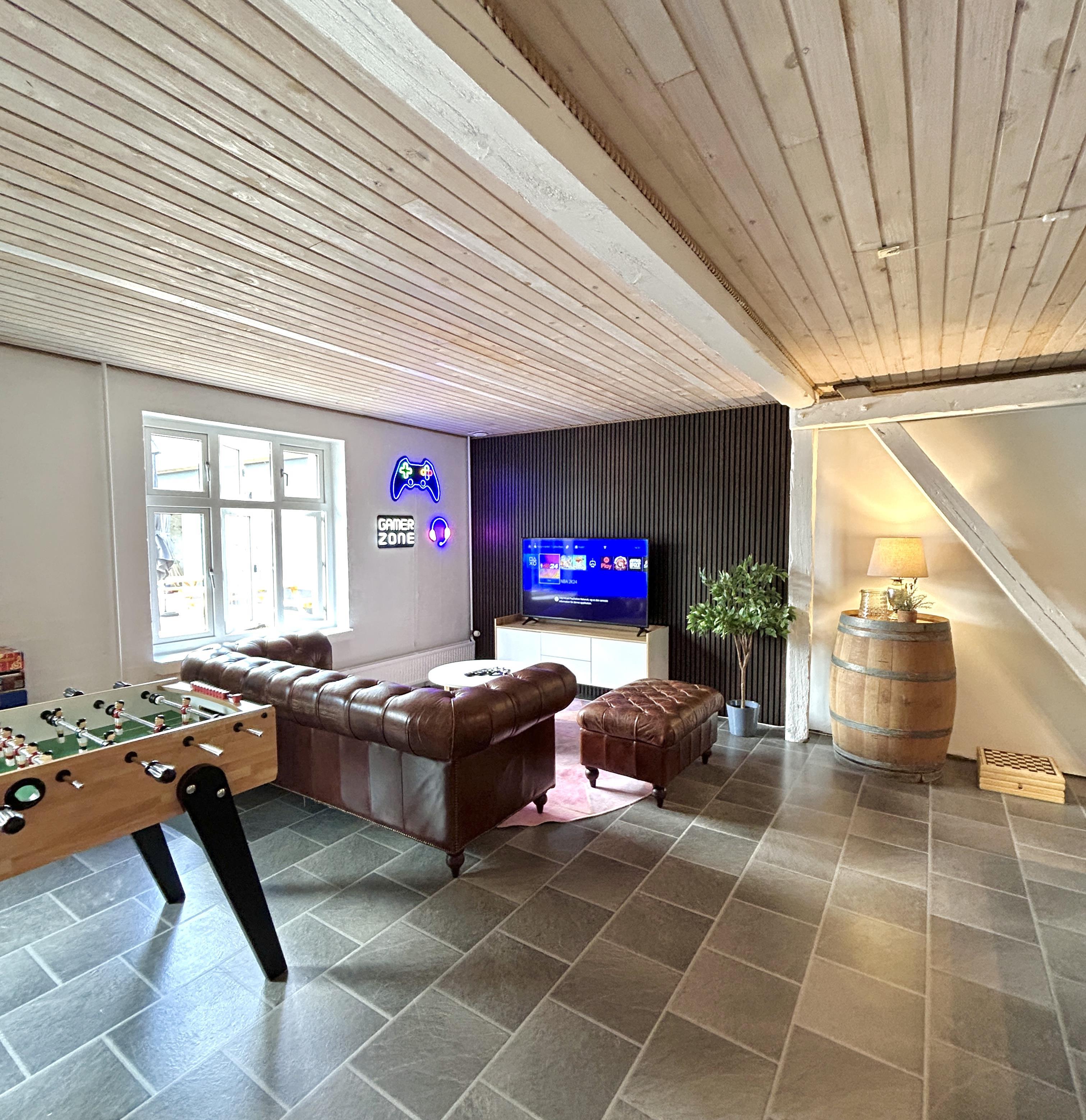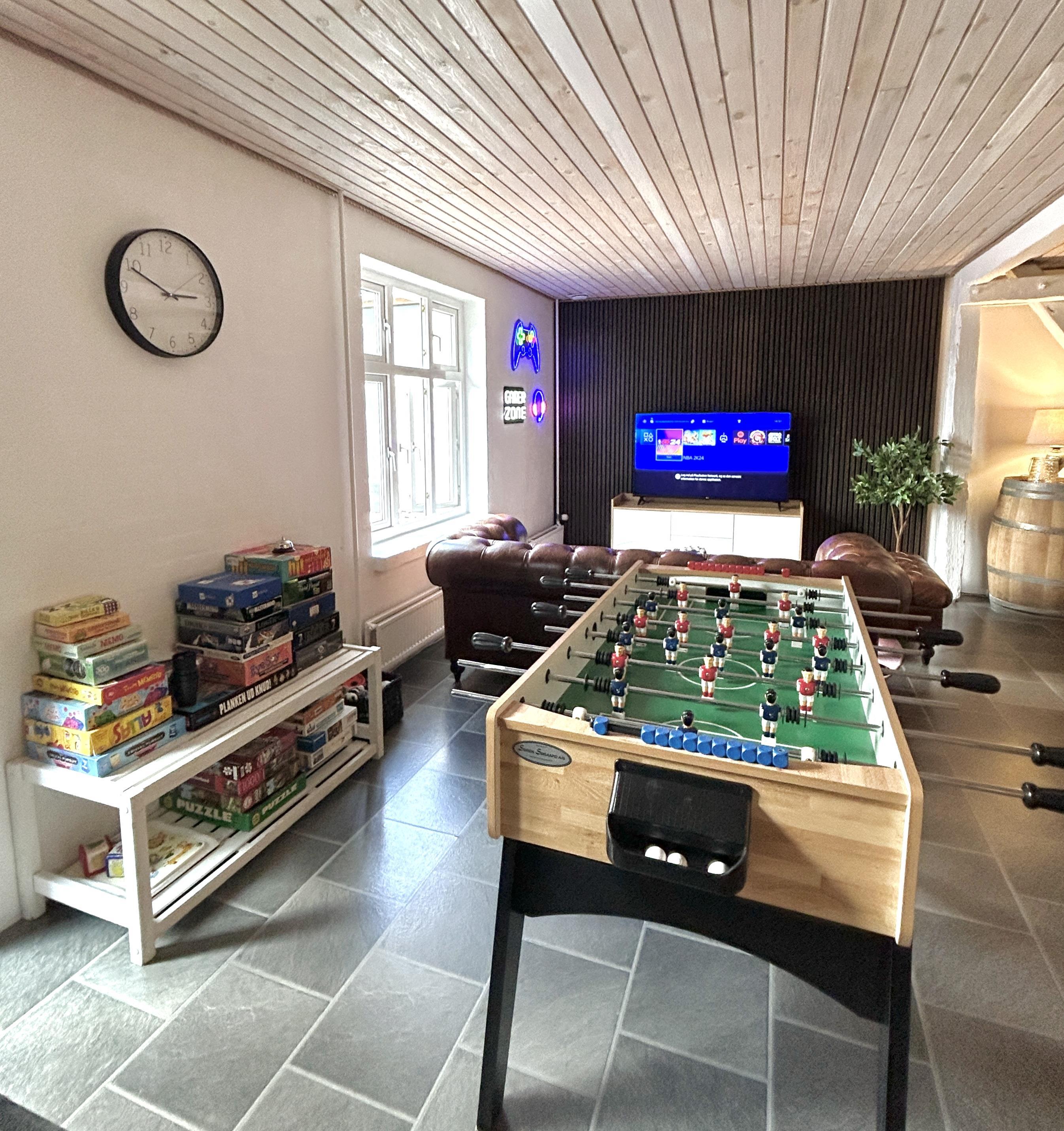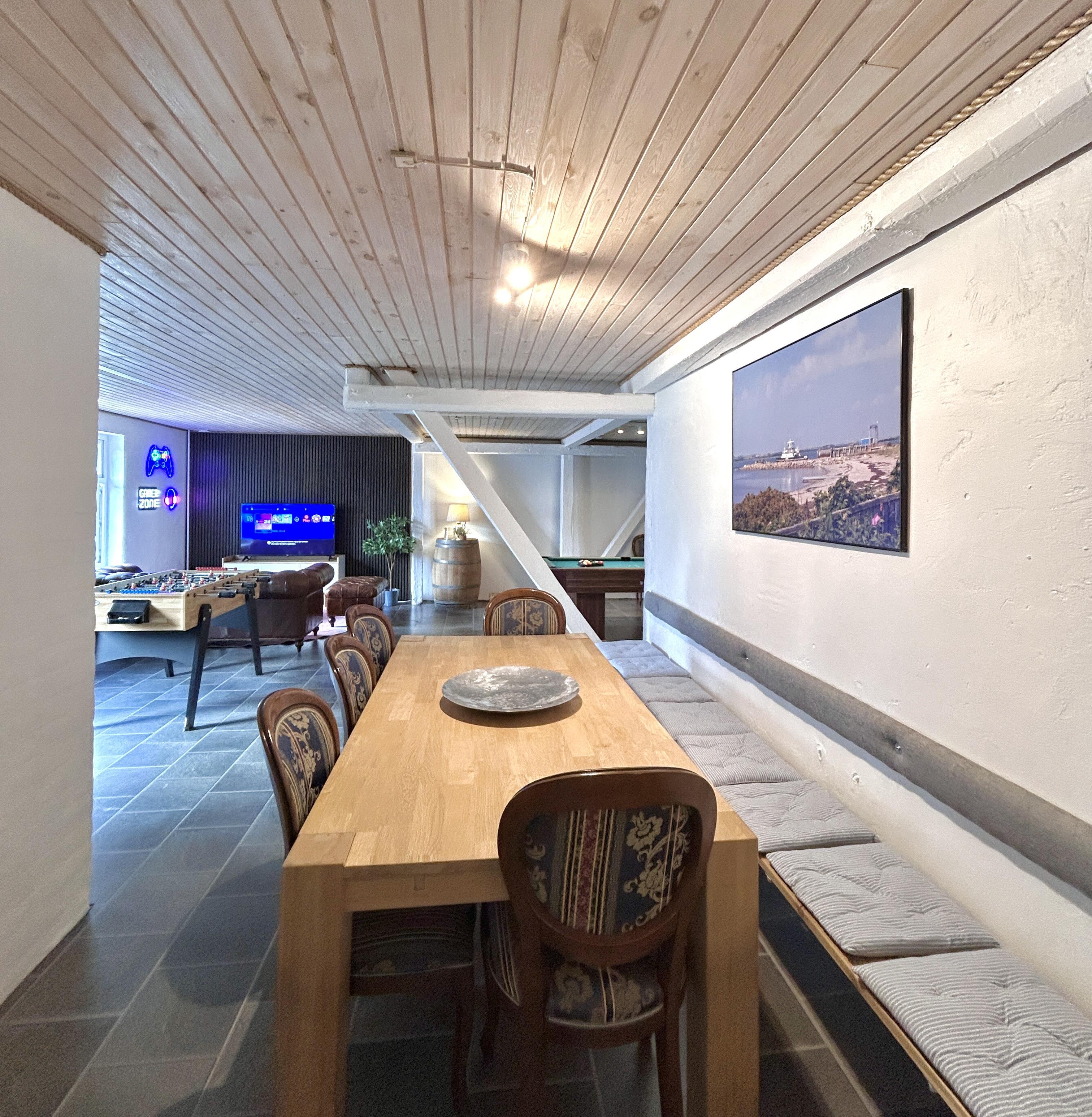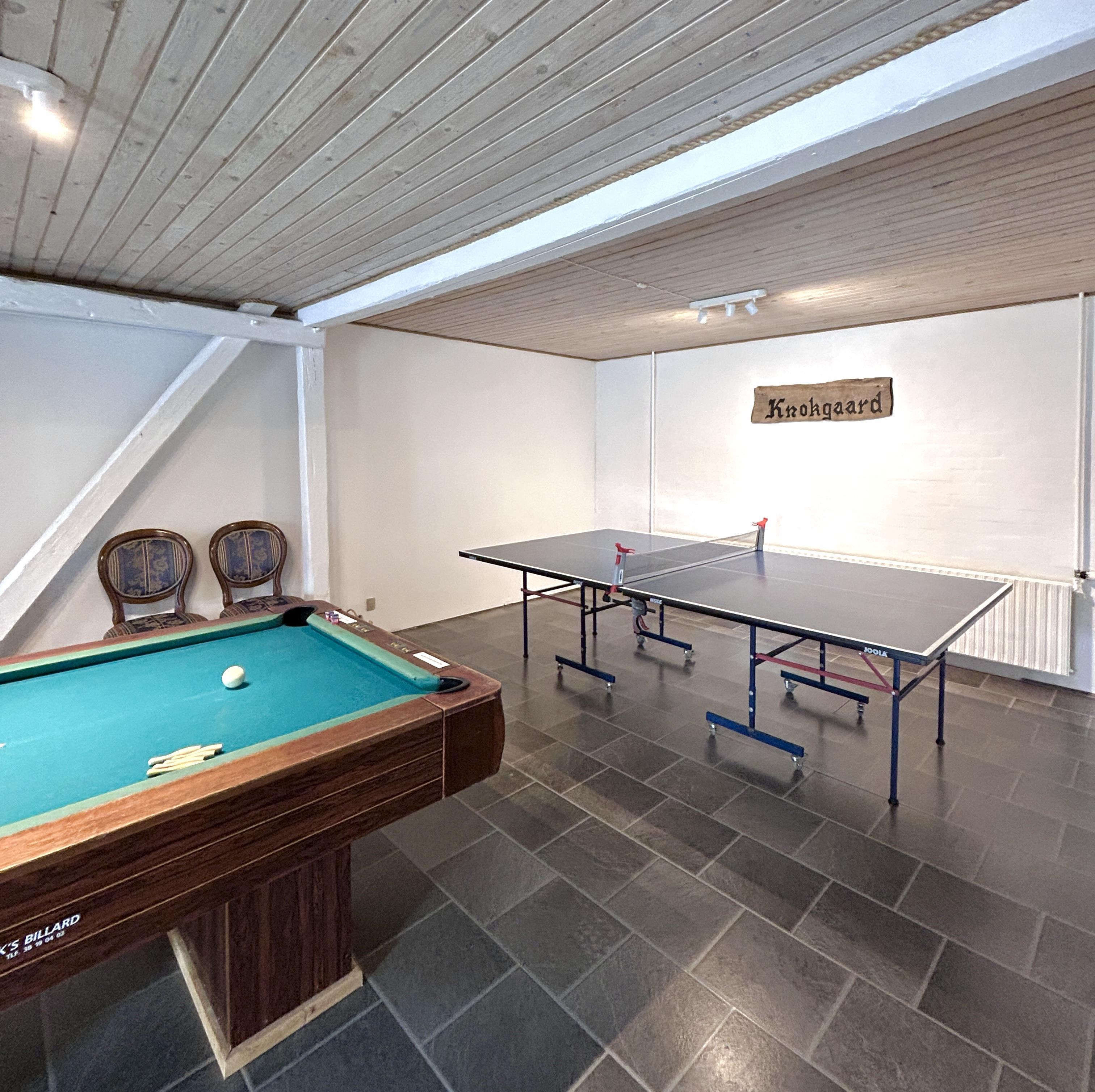 Knokgaard bietet ein einzigartiges Urlaubserlebnis, verteilt auf drei Gebäude - ein Haupthaus, ein Poolhaus und ein Nebengebäude, die zusammen sowohl Komfort als auch Unterhaltung bieten: