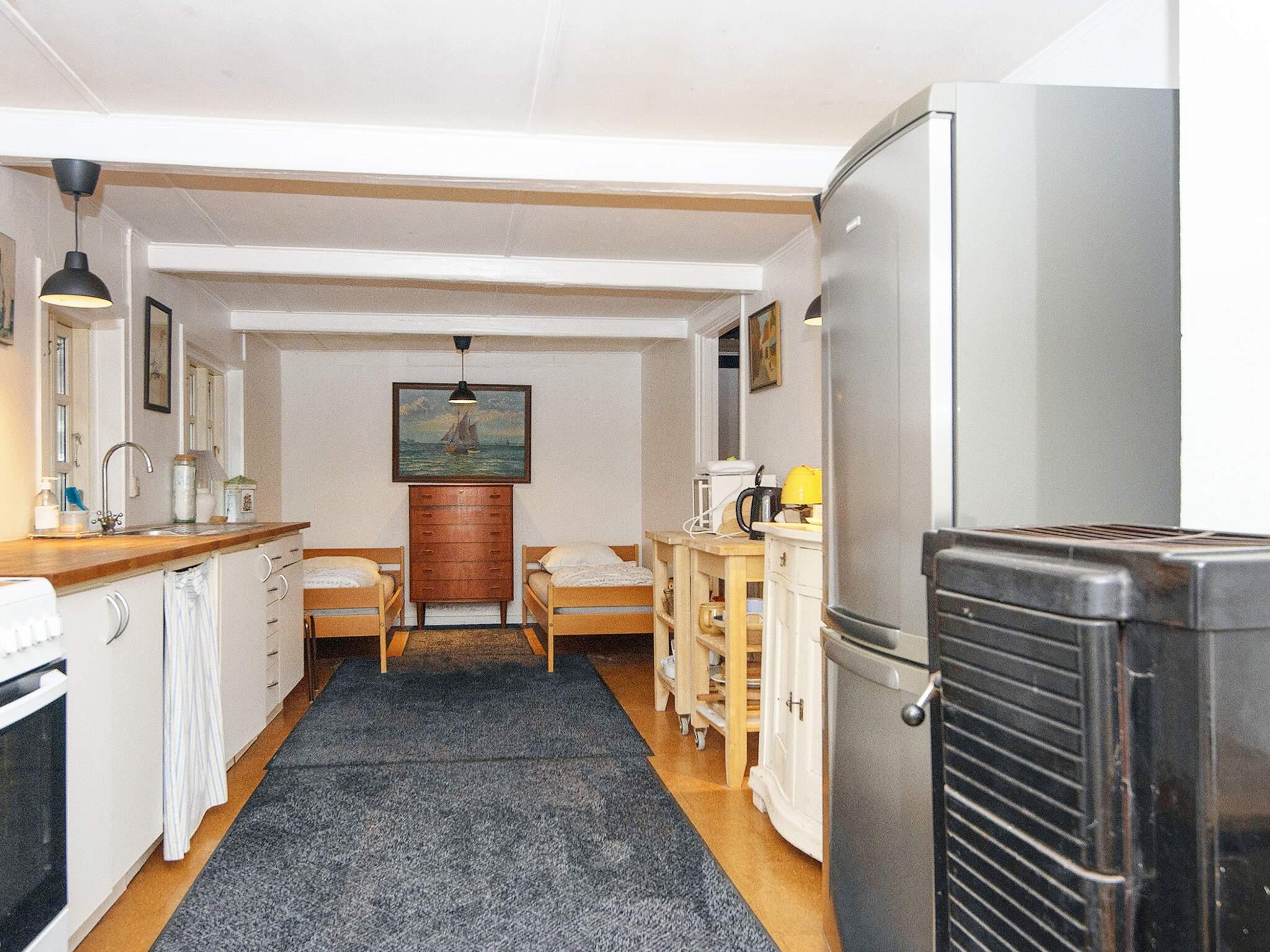 Separate Küche im Haus mit Zugang zum Wohnzimmer mit Holzofen. Keine Sender im TV, nur Bildschirm und Chromecast zum Streamen eigener Anbieter. Im Haus auch ein großes Schlafzimmer mit drei Betten. Zudem stehen am Ende der Küche zwei weitere Betten bereit (beachten Sie bitte, dass es sich hierbei um ein einzelnes, größeres Zimmer handelt).