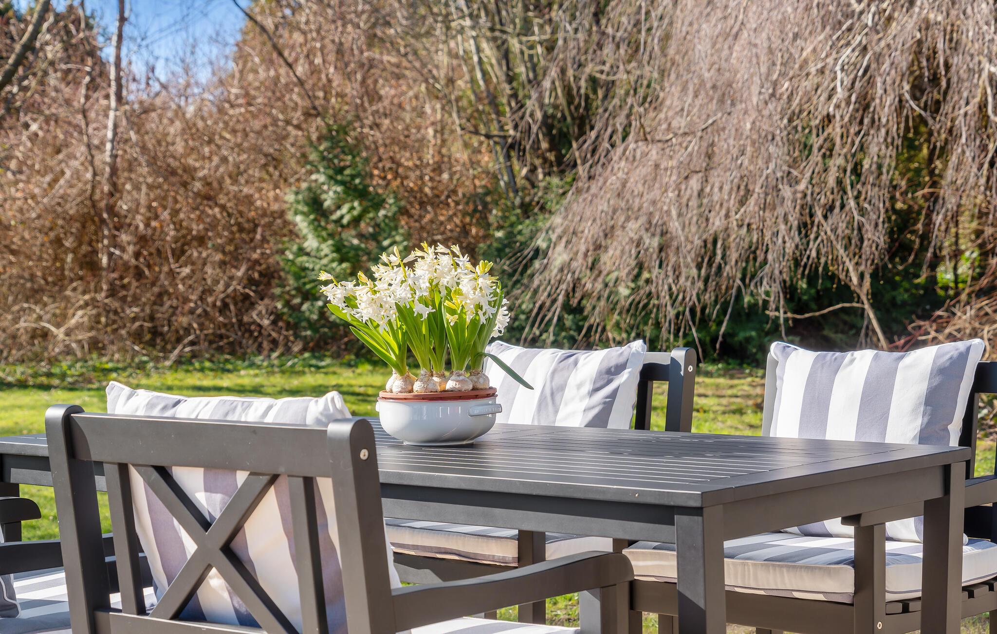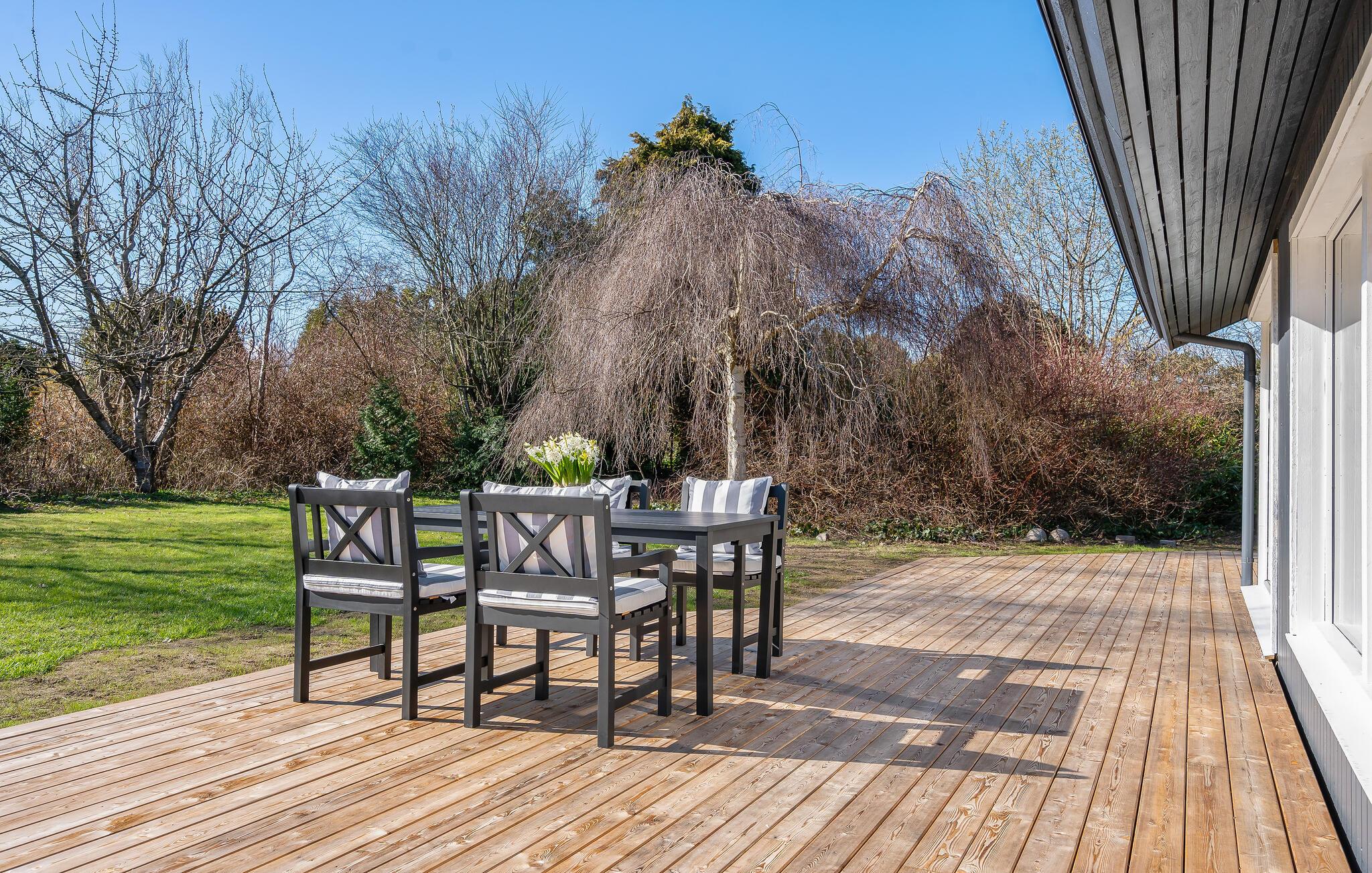 Der weitläufige Garten mit seinen schattenspendenden Bäumen lädt zu erholsamen Stunden im Freien ein. Beginnen Sie den Tag mit einem ausgiebigen Frühstück auf der geräumigen Holzterrasse und nutzen Sie die lauen Sommerabende für stimmungsvolle Grillfeste mit Ihren Liebsten.