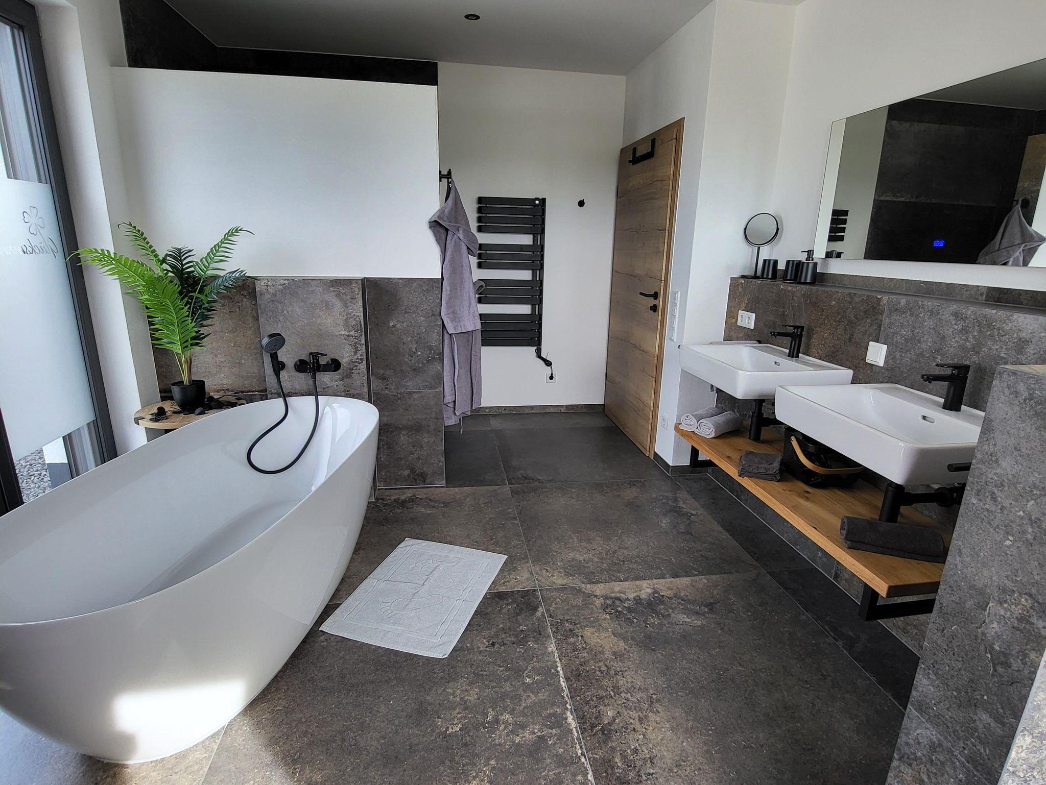 Badezimmer / Gäste-WC Das Badezimmer vereint Funktionalität und Luxus mit Doppelwaschbecken, Badewanne, Regendusche und Infrarotkabine für 2 Personen. Ein zweites, separates WC sorgt für zusätzlichen Komfort.