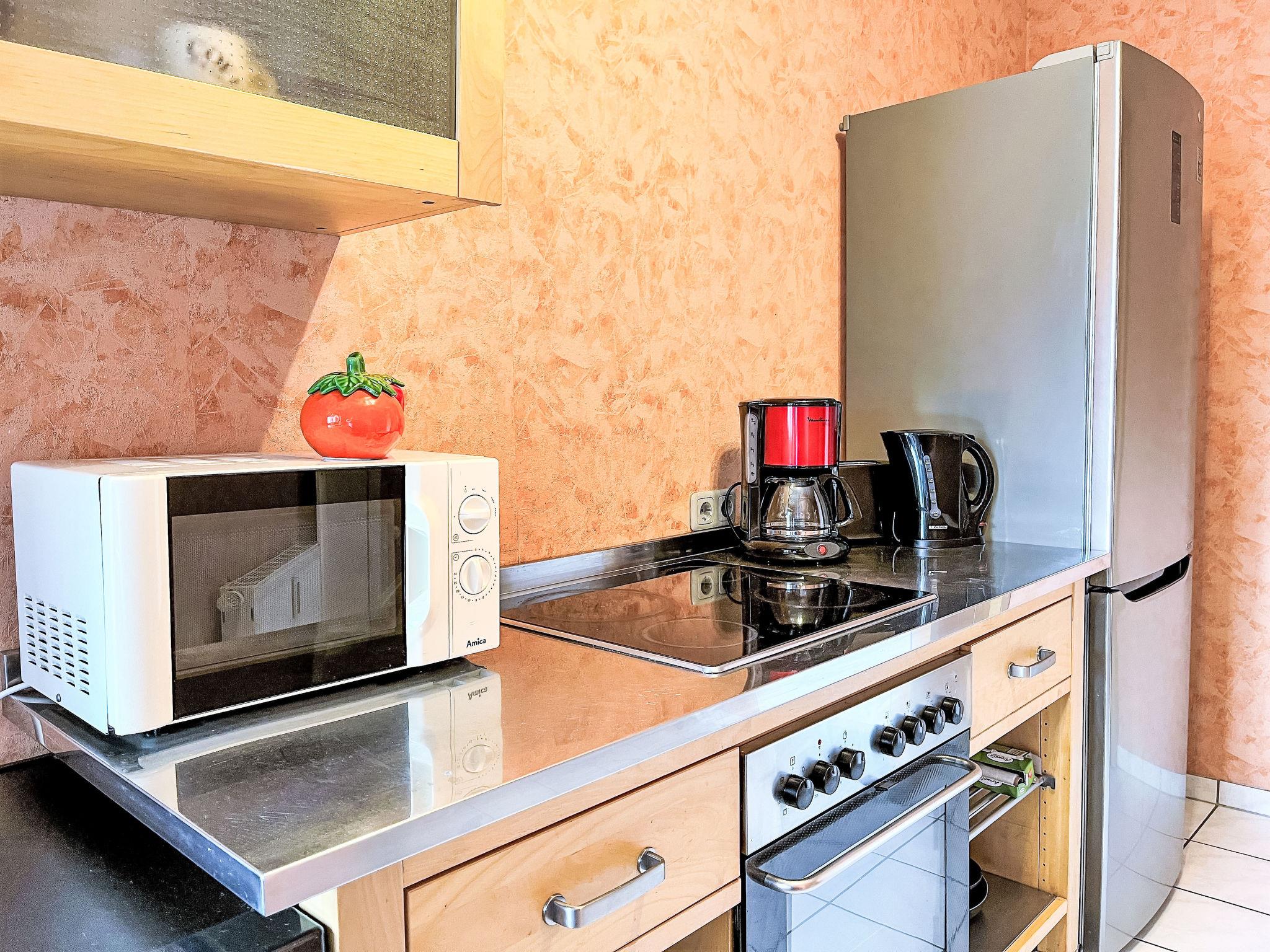 3-Zimmer-Wohnung 80 m2 im 1. Stock. Modern eingerichtet: Wohn-/Esszimmer mit Sat-TV (Flachbildschirm). 1 Zimmer mit 1 Bett und 1 Doppelbett. 1 Doppelzimmer. Küche (Backofen, Geschirrspüler, 4 Glaskeramikplatten, Toaster, Wasserkocher, Mikrowelle, elektrische Kaffeemaschine). Bad/WC. Abstellkammer. Zur Verfügung: Waschmaschine, Wäschetrockner. Internet (WLAN, gratis). Bitte beachten: Nichtraucher-Unterkunft. Maximal 2 Haustiere/Hunde erlaubt. Rauchmelder, Feuerlöscher.