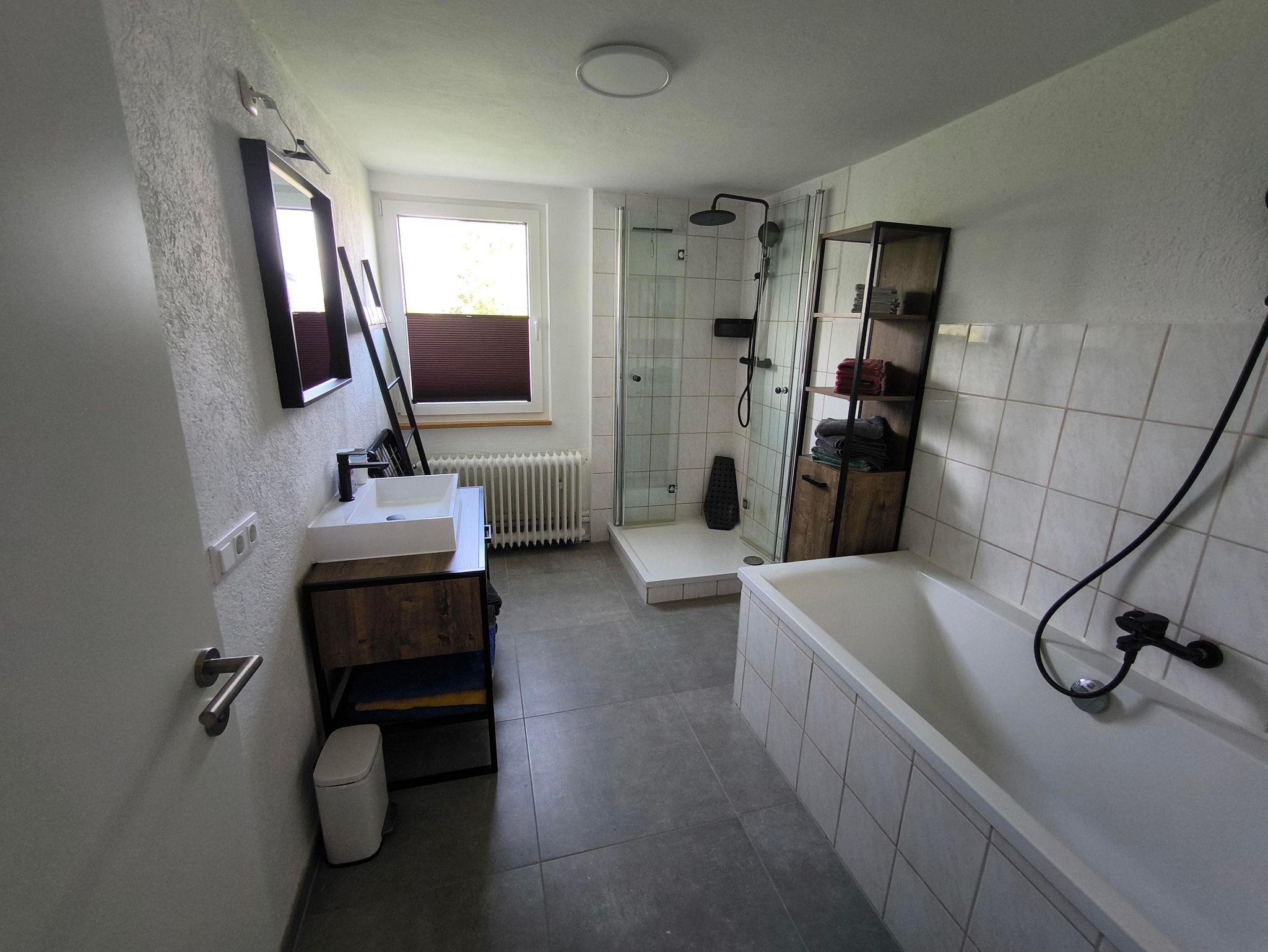 Ein großes Bad mit Badewanne und ein separates WC mit der Möglichkeit Ihre Wäsche zu waschen und zu trocknen, runden das Angebot ab. Waschmaschine und Trockner befinden sich in der Wohnung und müssen nicht mit anderen Gästen geteilt werden.