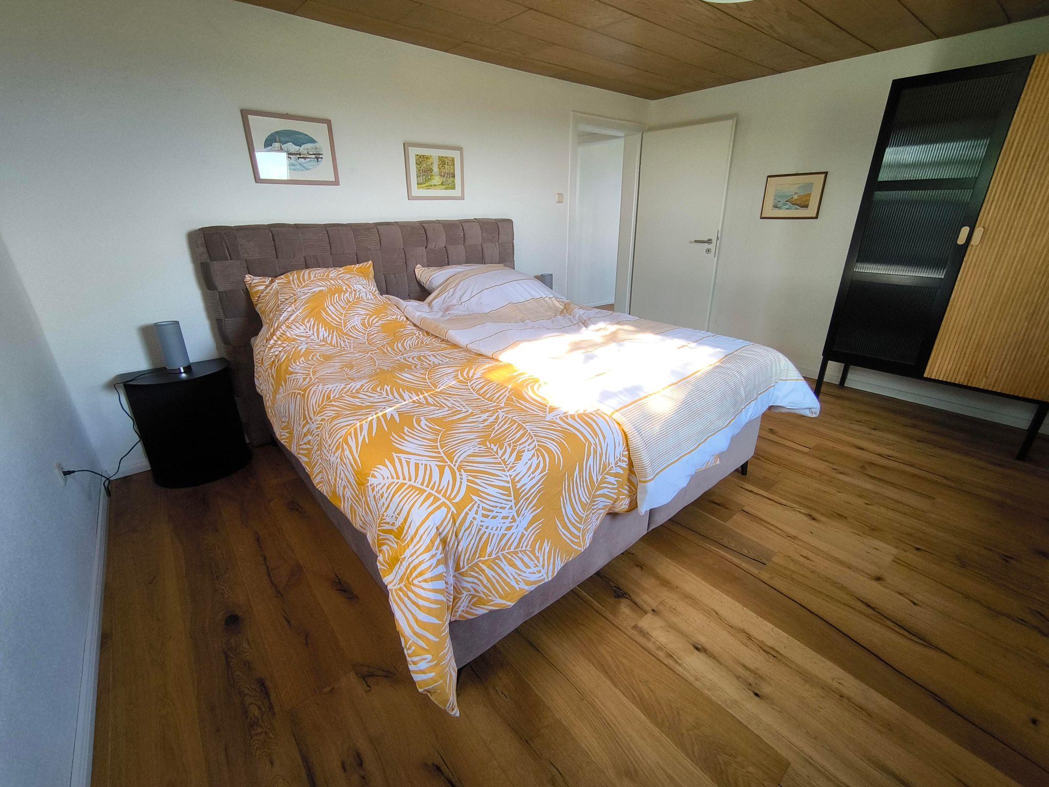 Unsere Ferienwohnung im Obergeschoss (85qm). Ein großzügiges Wohnzimmer (Ausziehsofa) und zwei Schlafzimmer (Elternschlafzimmer mit großem Doppelbett und ein Kinderschlafzimmer mit einem Einzelbett und einem Ausziehsofa) bieten bis zu 5 erwachsenen Personen ausreichend Platz für einen erholsamen Urlaub. Gemütlich kann man den Abend mit der ganzen Familie vor dem 55 Zoll großen TV ausklingen lassen.