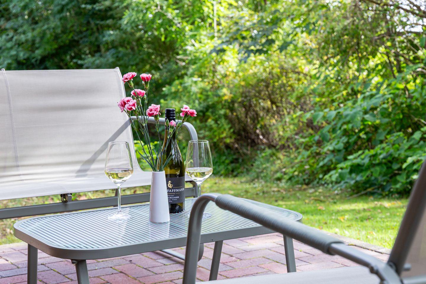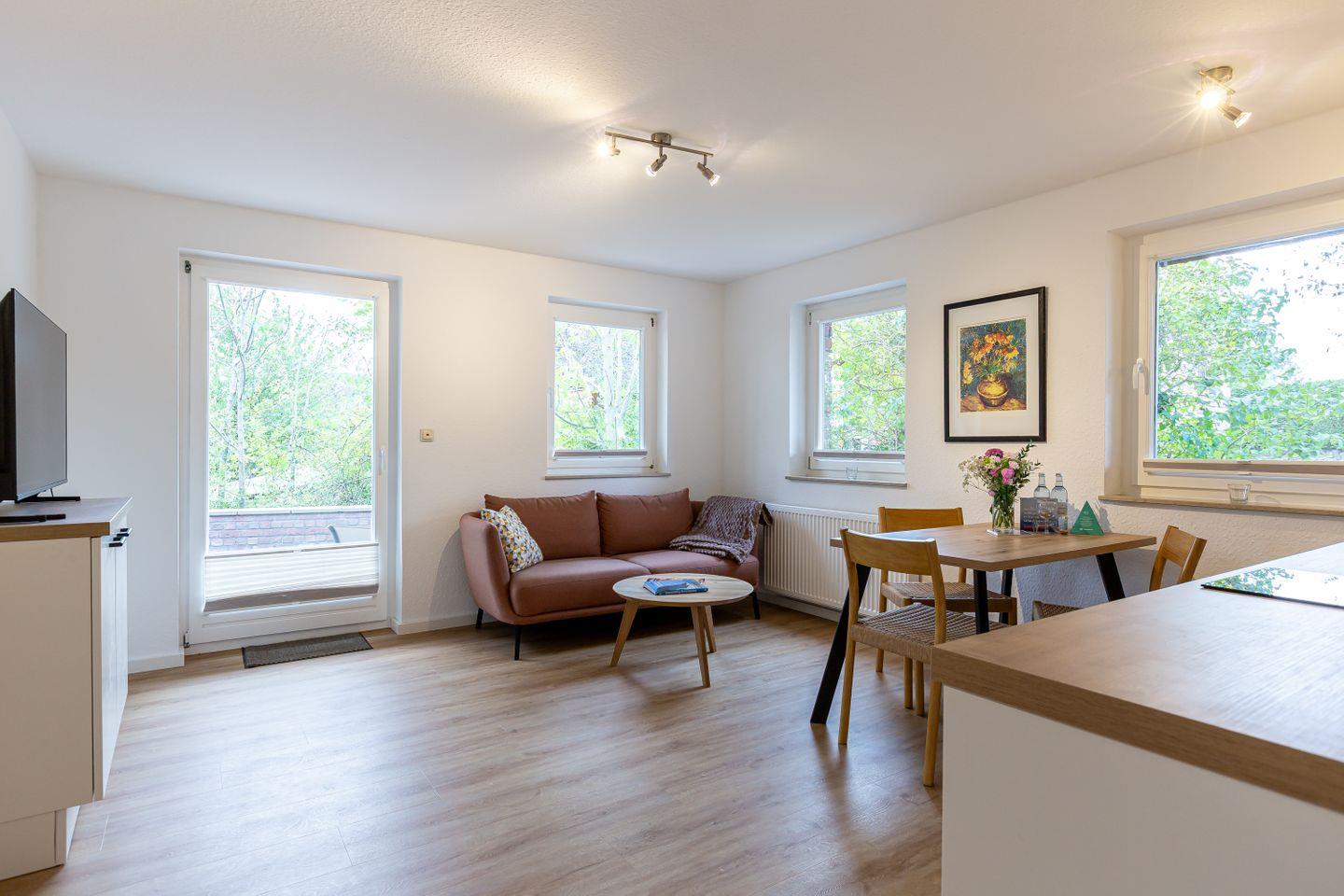 Zur Wohnung gehört eine Terrasse, die sich ideal für den Morgenkaffee an der frischen Luft eignet. Ein PKW-Stellplatz sowie zwei Fahrradstellplätze stehen direkt an der Unterkunft zur Verfügung.