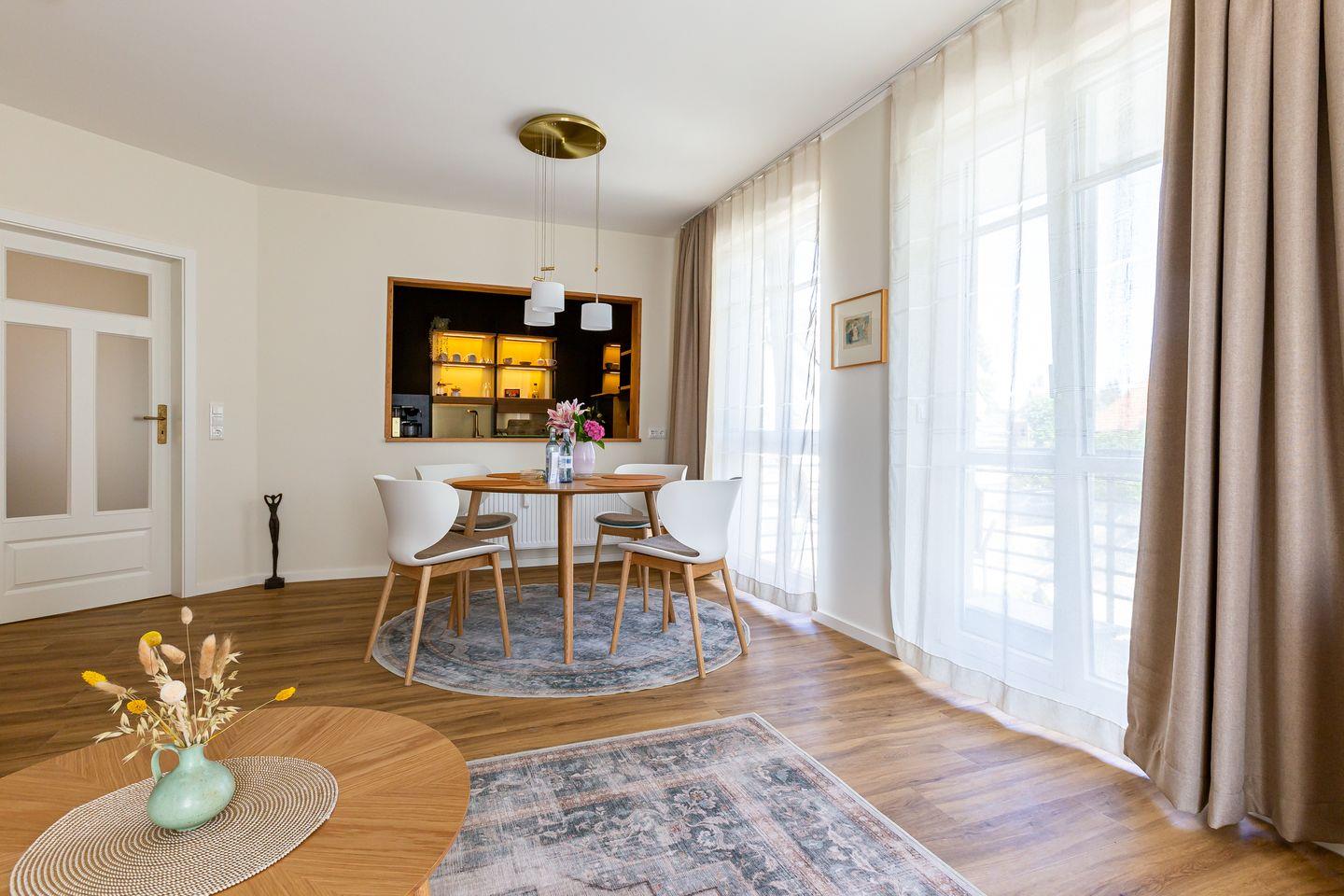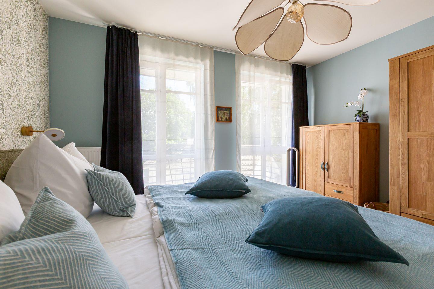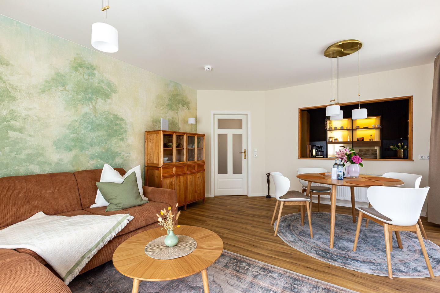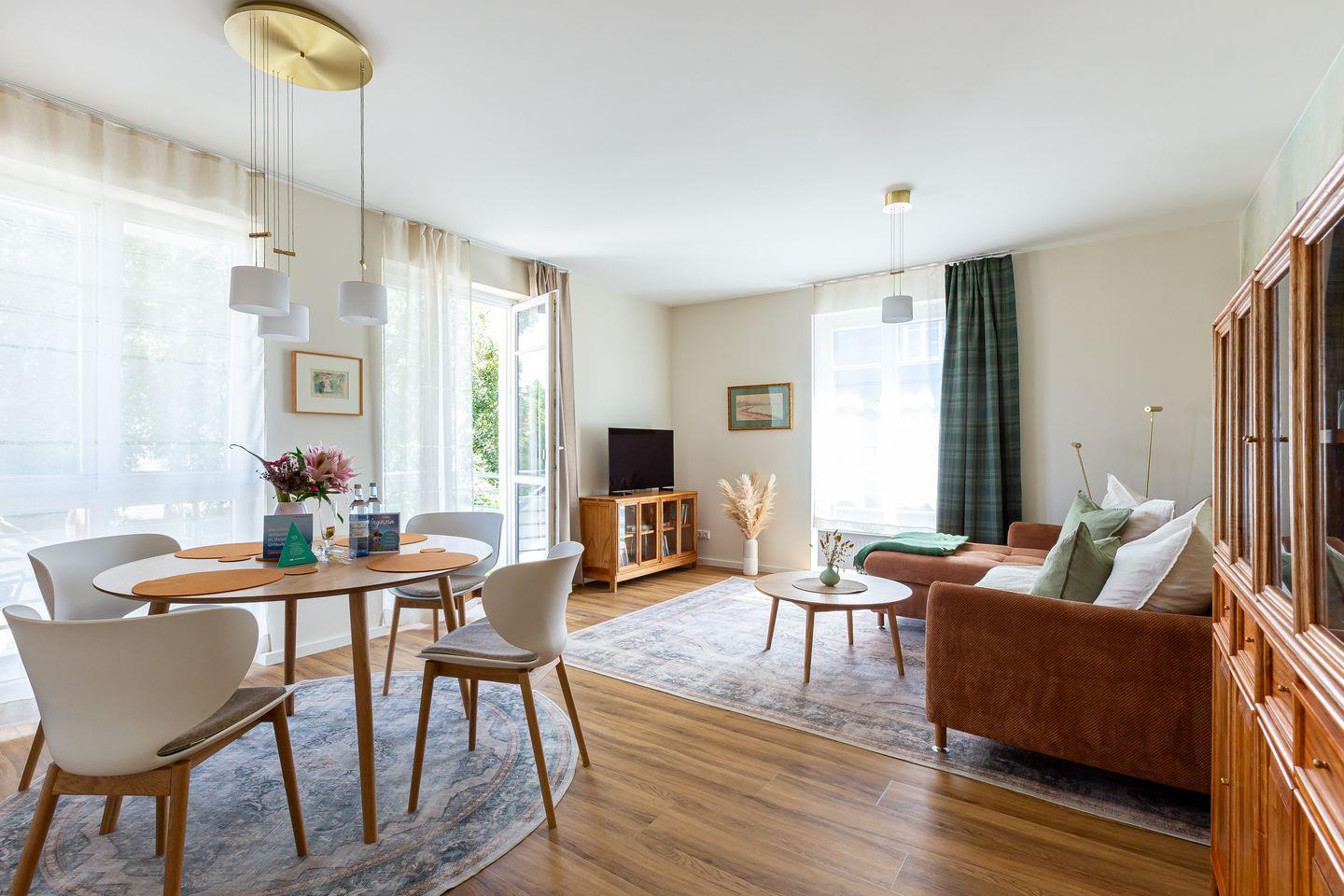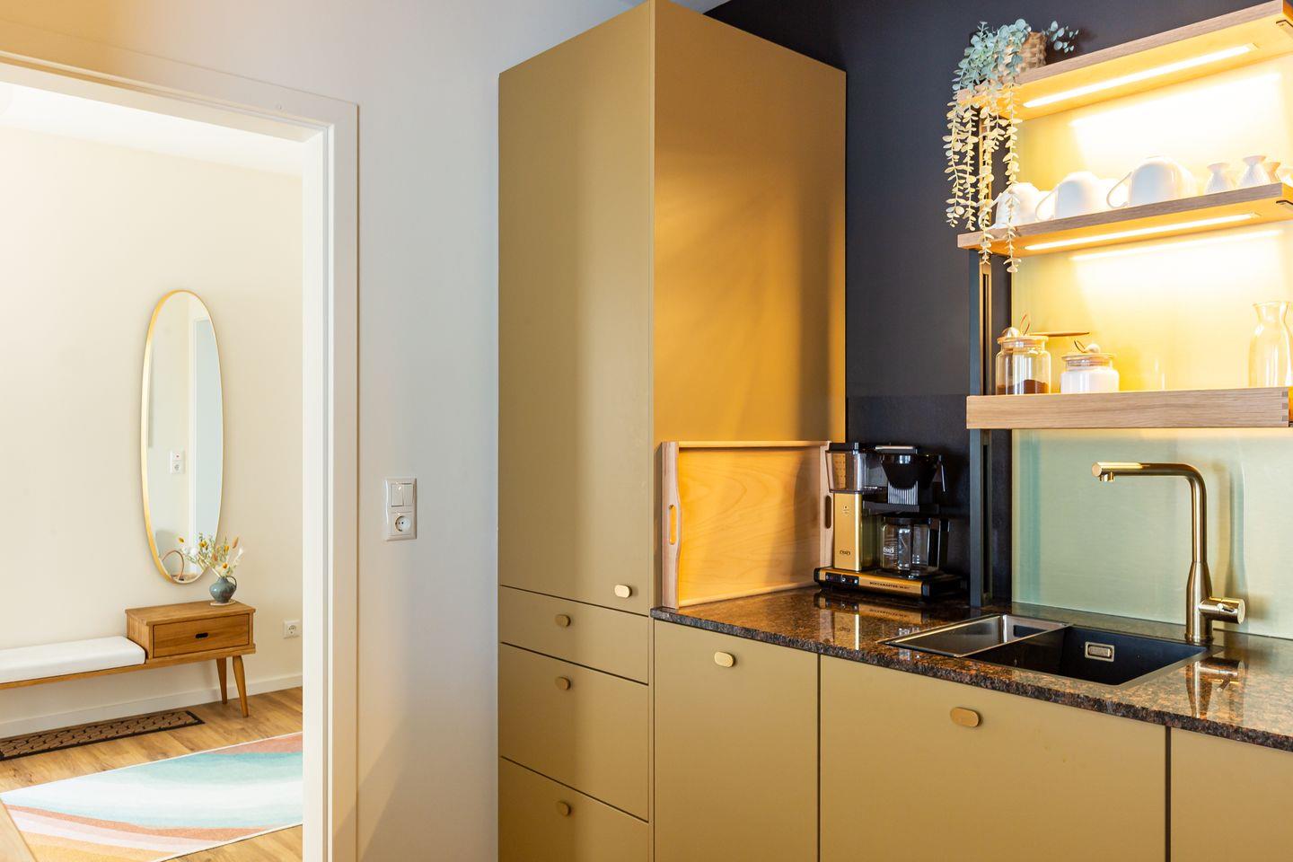 De Ruyter verbindet stilvolles Interior mit lässigem Ostseeflair. Die Ferienwohnung ist hochwertig eingerichtet im modernen Retro Stil. Warme Erdtöne wie Rost, Salbeigrün und Gold treffen auf natürliche Materialien wie Holz, Leinen und edles Messing. Ein geschmackvoller Mix, der Gemütlichkeit und Designbewusstsein auf den Punkt bringt. Das Wohnzimmer ist das Herzstück der Wohnung: hell, offen und mit viel Liebe zum Detail gestaltet. Die offene Küche mit modernsten Miele Geräten und einer praktischen Durchreiche macht das Kochen zum entspannten Miteinander. Vom Wohnzimmer aus geht es direkt auf den Balkon, ideal, um den ersten Kaffee des Tages dort zu genießen. Auch das Schlafzimmer hat Zugang zu einem kleinen Balkon. Klare Linien, natürliche Materialien und eine stimmige Farbwelt schaffen auch hier eine Atmosphäre, die ganzjährig für maximale Erholung und ein traumhaftes Urlaubsgefühlt steht.