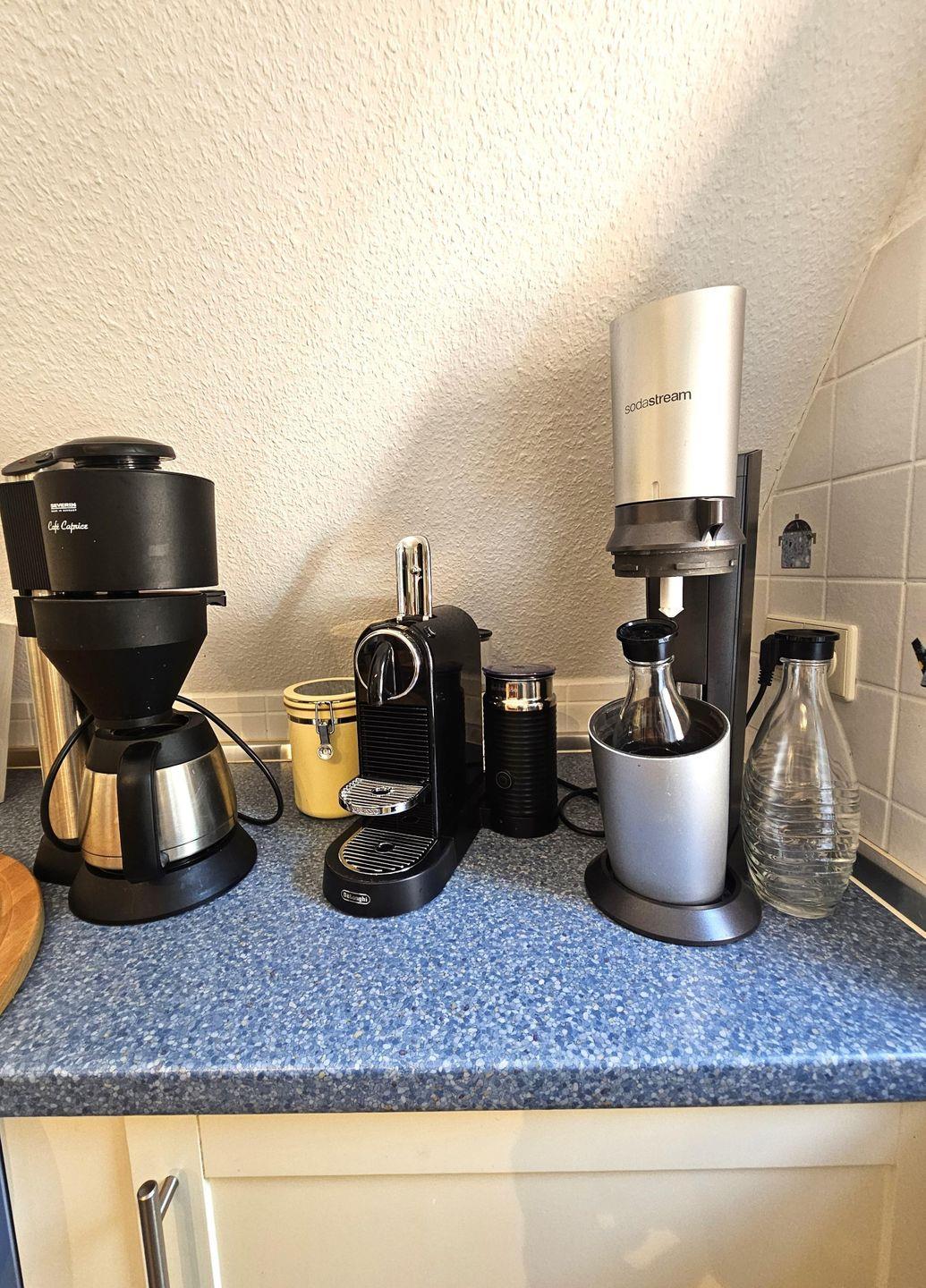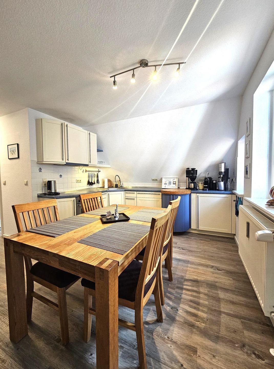 Der Wohnbereich ist mit Sofa, TV sowie Radio ausgestattet und geht in eine offene Küche über. Ein Essbereich mit Esstisch ist vorhanden. Die Küche ist umfassend ausgestattet: Herd mit 4-Platten-Kochfeld, Backofen, Kühlschrank mit Gefrierfach, Spülmaschine sowie Kaffeemaschine, Wasserkocher und Toaster. Geschirr, Besteck und Küchenutensilien stehen bereit.