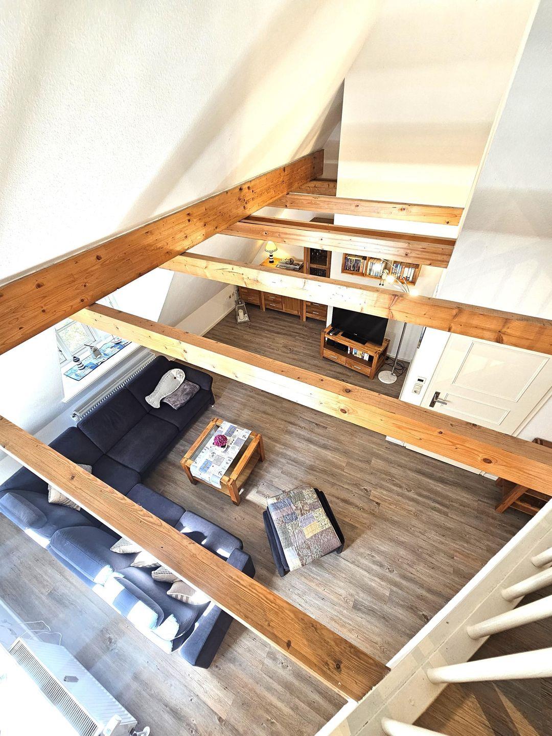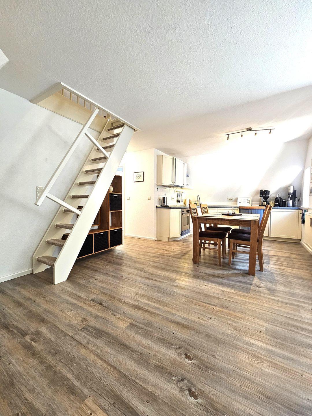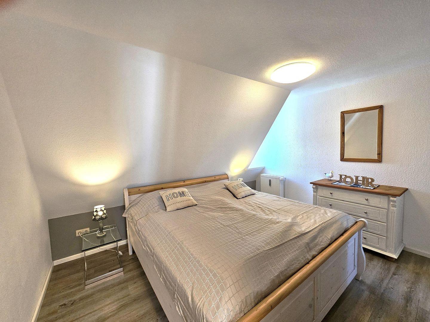 Die Wohnung Noordlicht in Alkersum: 70 m² große Unterkunft für bis zu 4 Personen mit 2 Schlafzimmern auf 2 Etagen. Offene Küche zum Wohnzimmer mit Backofen, Spülmaschine und 4-Platten-Herd. Bad mit Wanne/Dusche. Terrasse mit Gartenmöbeln, Garten, WLAN, TV. Gemeinschaftliche Waschmaschine/Trockner (gegen Gebühr), 1 kostenloser Privatparkplatz. Haustiere willkommen (max. 2), Nichtraucher. Strand/Meer 3,7 km.