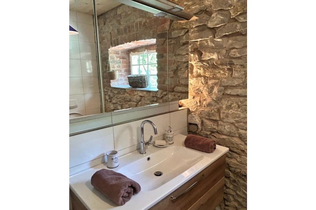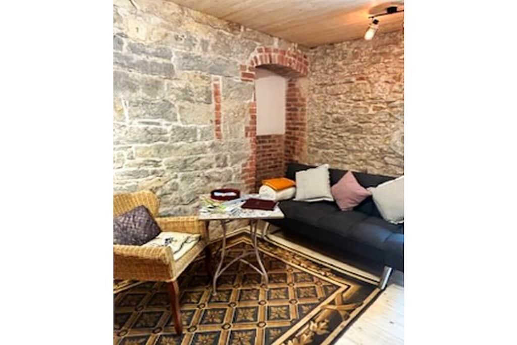 Diese Ferienwohnung besticht durch die wundervollen Naturstein- und Backsteinwände. Es gibt eine Küche mit Backofen, Ceranfelder, Spülmaschine, gr. Kühlschrank, Kaffemaschine, Wasserkocher, . Die historischen Möbel und die schönen Wände verleihen der Wohnung Charme. Der Blick die Fenster geht ins Grüne und auf den Hofgarten. Ein Sofadoppelbett steht in der Stube zur Verfügung. Der Eingang hat eine Rampe, so dass in der Wohnung auch Gäste mit Rollator oder Rollstuhl übernachten können. Das Bad ist barrierefrei und ist mit einerDusche und .WC ausgestattet. Der Zusatzofen im Wohnzimmer verbreitet gemütliche Wärme. Der Blick durch die grossen Fenster geht ins Grüne. Für Kinder gibt es Kinderbetten oder ein Reisebett.