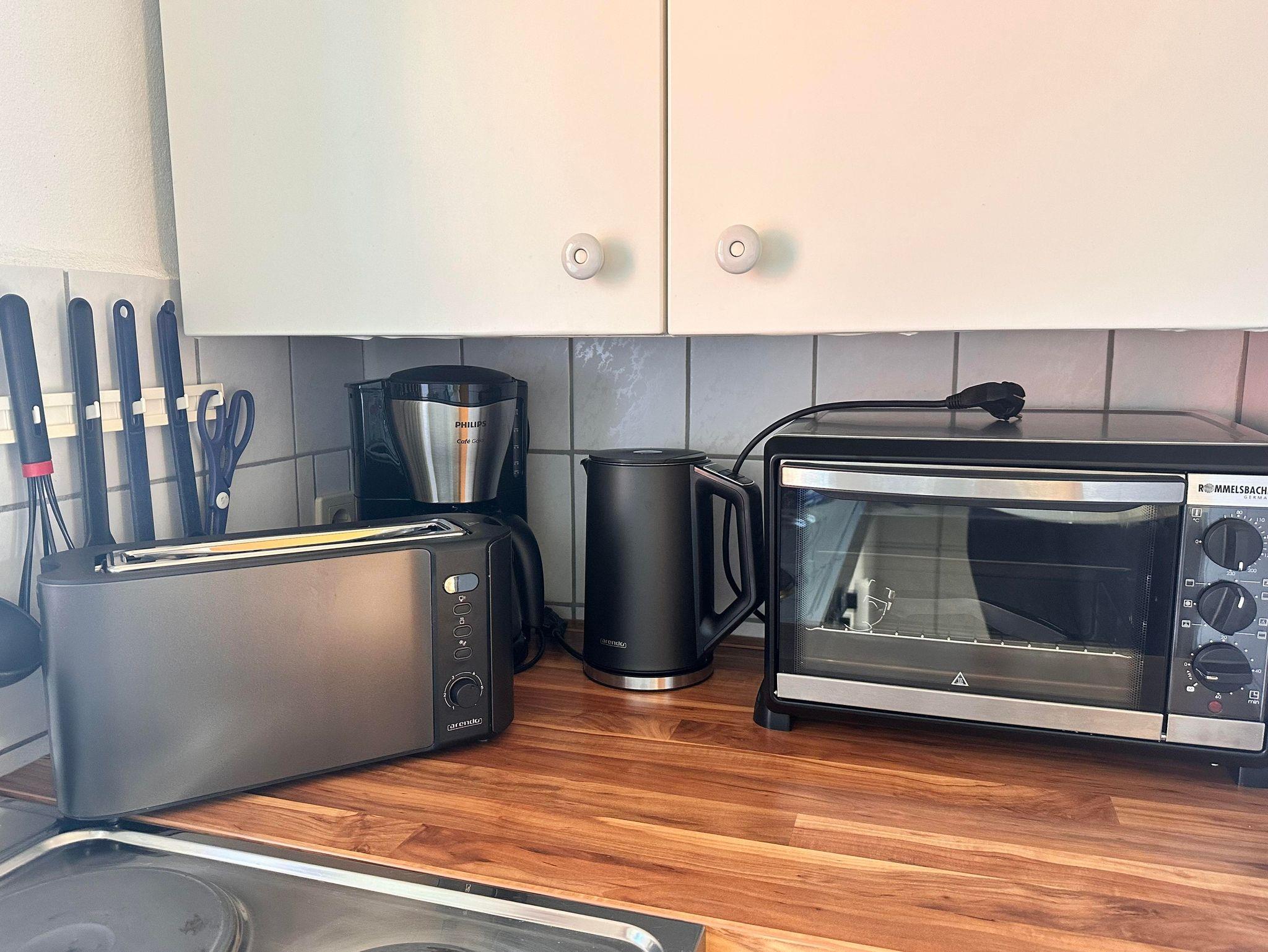 Die voll ausgestattete Küche bietet dir alle notwendigen Utensilien – vom Geschirr bis hin zu Töpfen und Pfannen. Es gibt einen Kühlschrank, einen Herd mit zwei Kochfeldern, einen kleinen Backofen, einen Wasserkocher, Toaster und eine Kaffeemaschine.