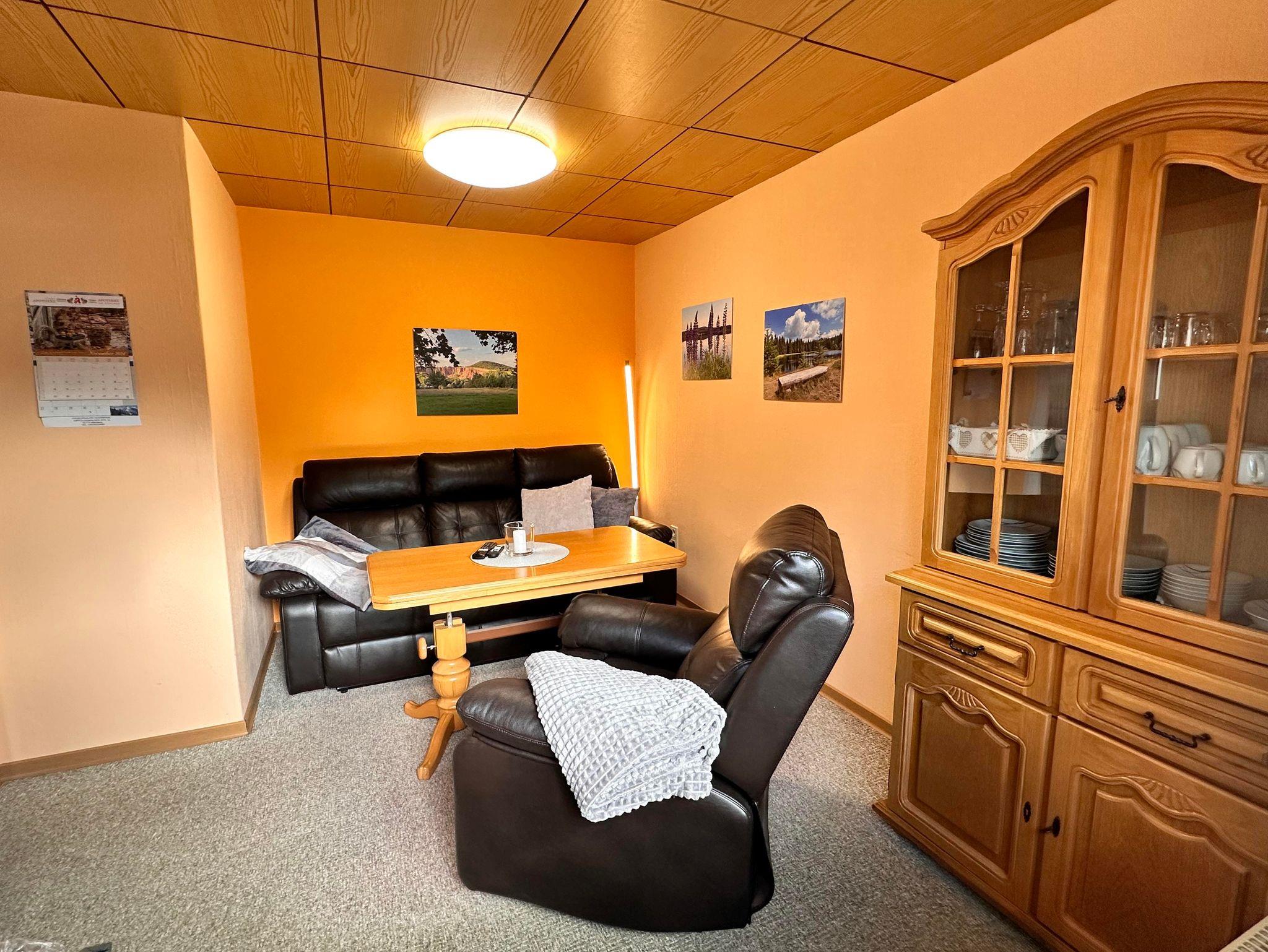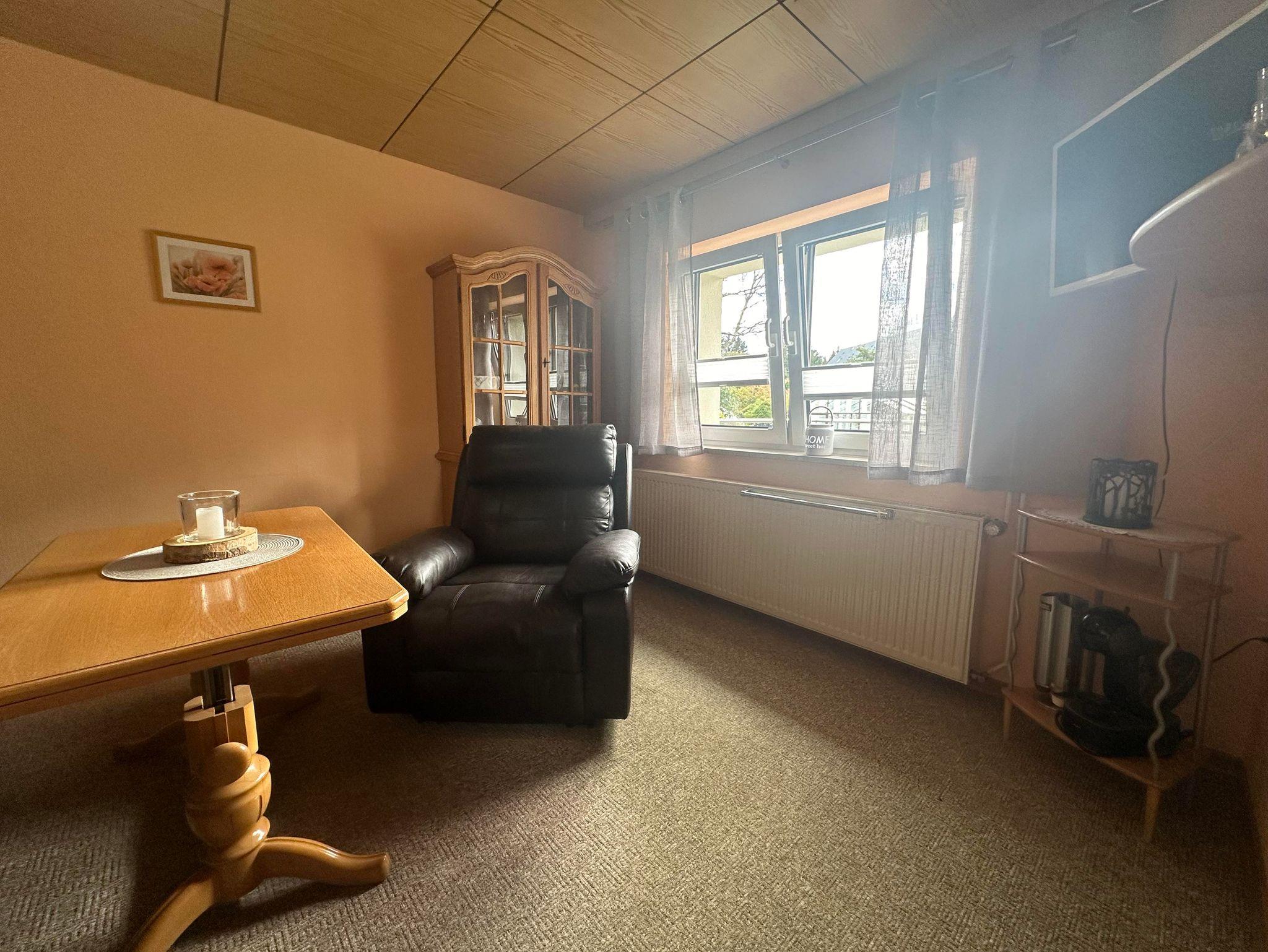 Im Wohnbereich erwartet dich ein gemütliches Sofa mit Loungefunktion, ein Sessel sowie ein Fernseher für entspannte Abende.