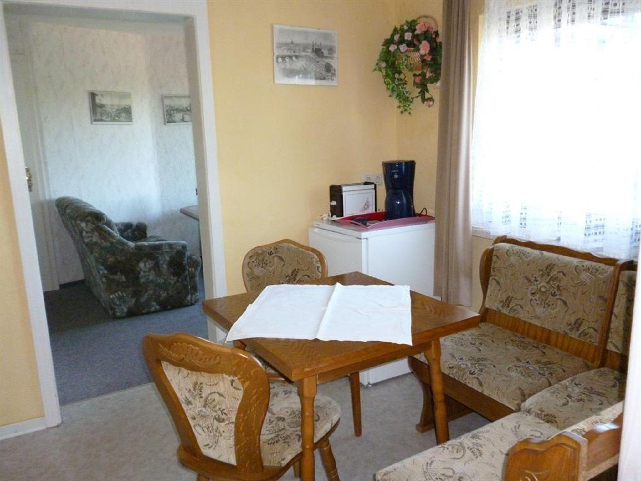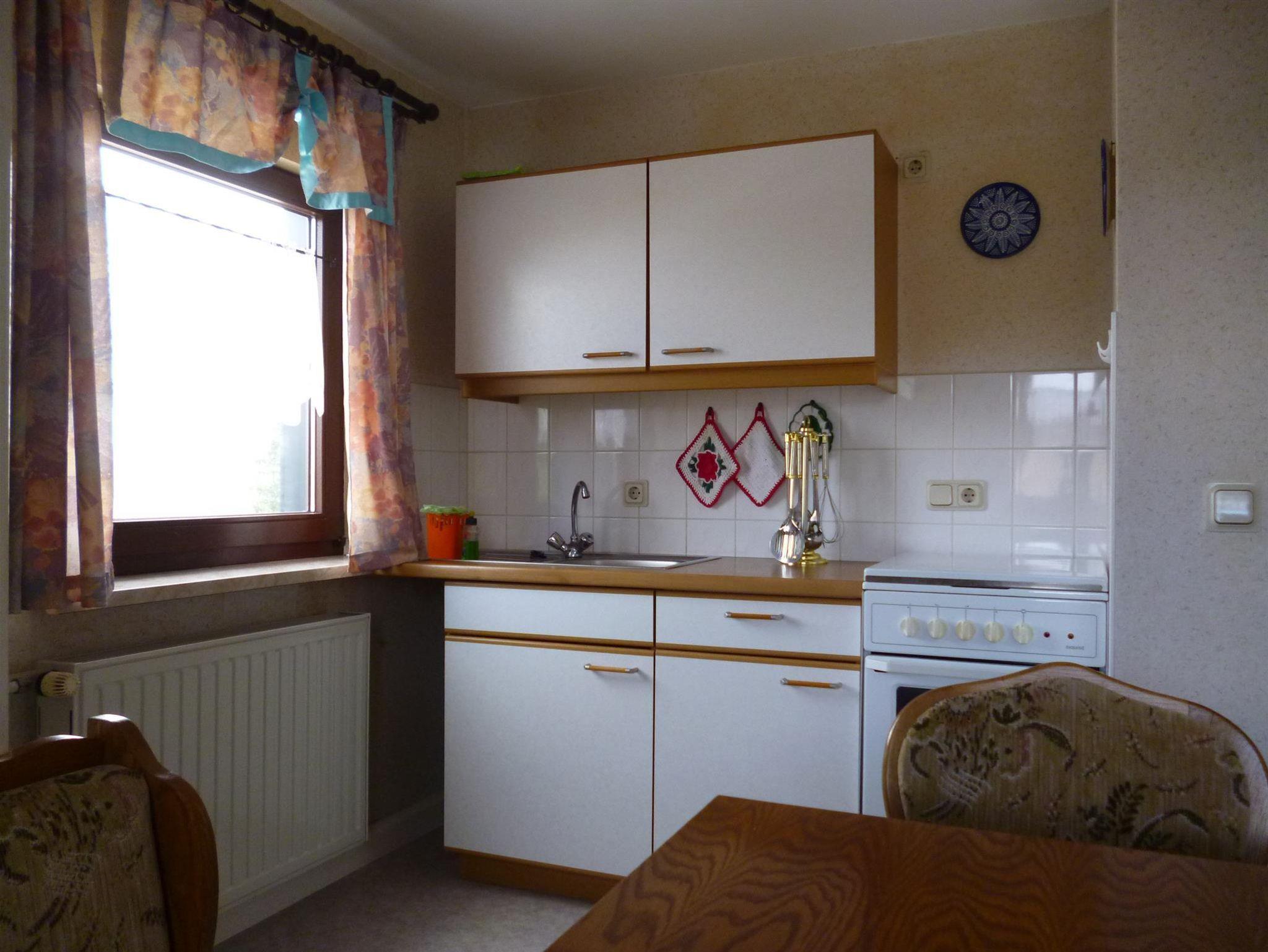 Fewo ohne Balkon für 2 Erw. und 2 Kinder (Wohn/Schlafraum (2 Aufbettungen für Kinder auf Doppelschlafcouch 1,40 breit), Küche mit Essplatz und E-Herd, Schlafraum 2 Peronen mit Doppelbett, Du/WC, TV, Radio,
