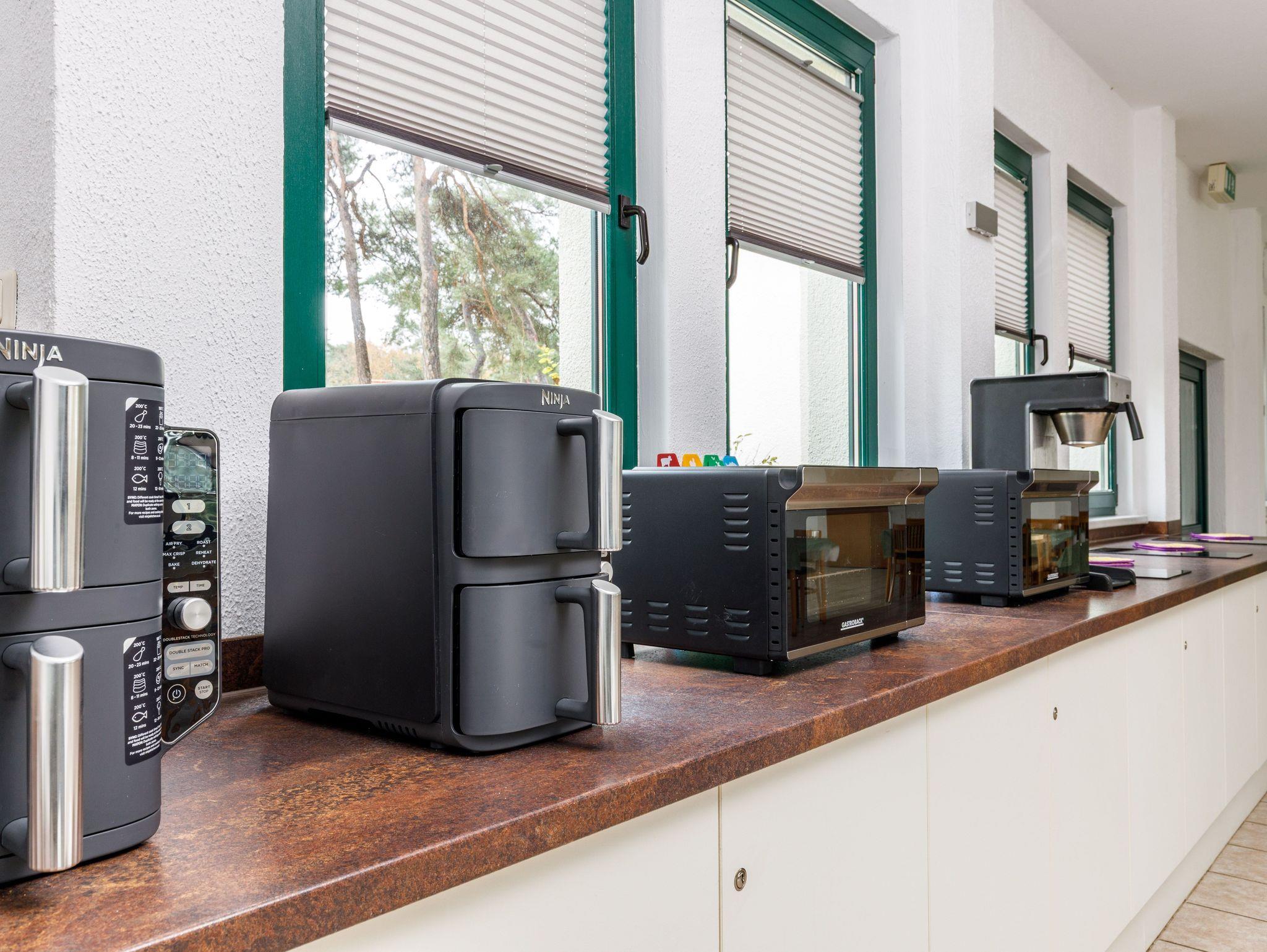 Zur Ausstattung gehören ein Bad mit Dusche und WC, ein Wohnbereich mit Esstisch, Kleiderschrank und TV sowie kostenfreies WLAN. Zusätzlich stehen ein Kühlschrank, eine Mikrowelle und eine Kaffee-Kapselmaschine zur Verfügung. Eine eigene Küche ist bewusst nicht vorhanden. Stattdessen nutzen Gäste die großzügige Gemeinschaftsküche auf dem Gelände mit allen notwendigen Kochutensilien.
