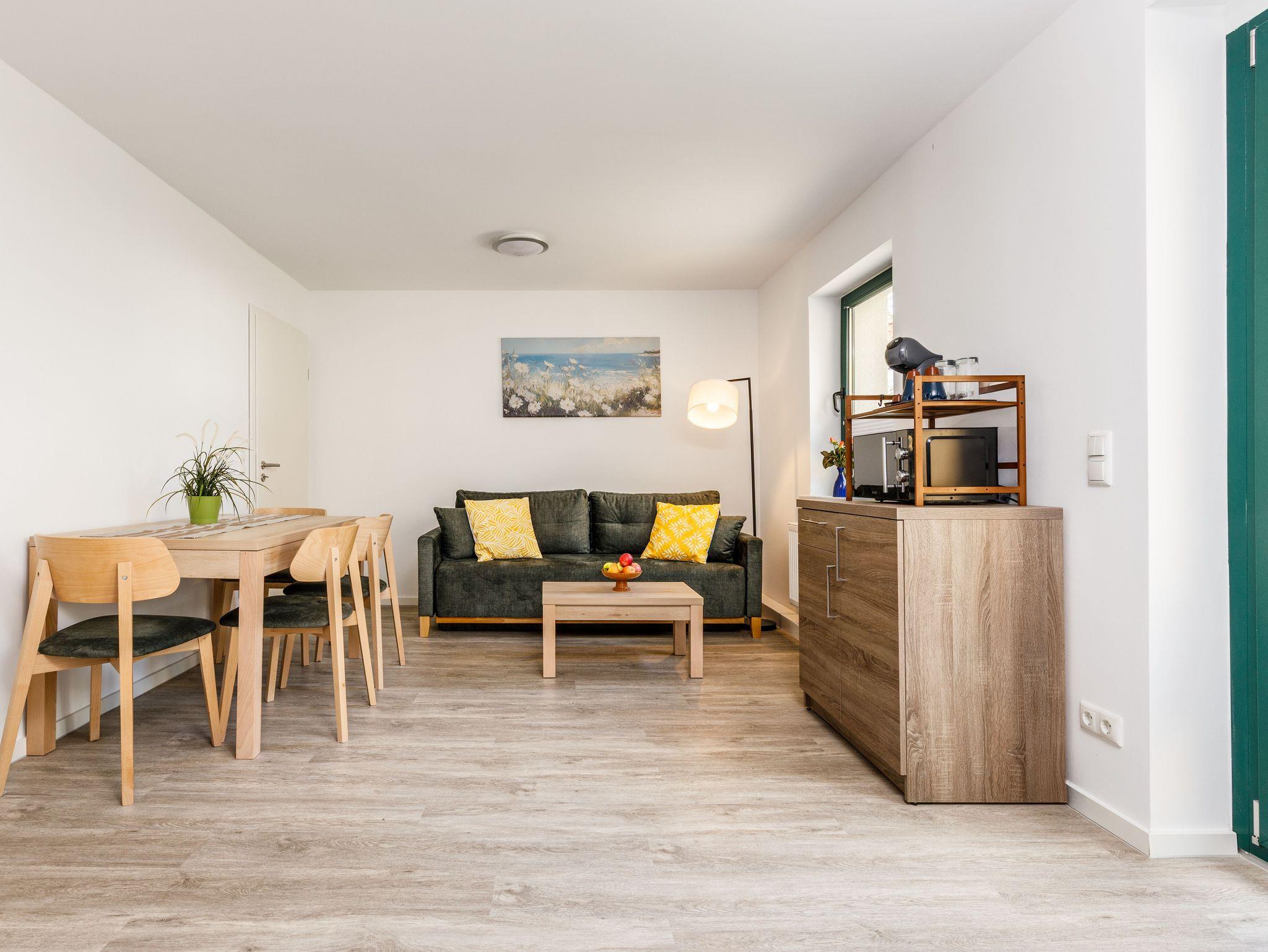 Das Apartment verfügt über ein Schlafzimmer mit Doppelbett sowie ein weiteres Schlafzimmer mit einem Einzelbett. Zusätzlich steht im Wohnbereich ein Schlafsofa zur Verfügung. Die allergikerfreundliche Ausstattung macht das Apartment besonders angenehm für unsere Gäste. Haustiere sind daher nicht gestattet.
