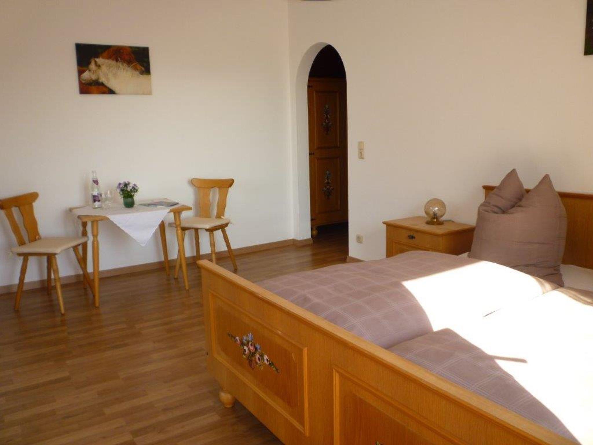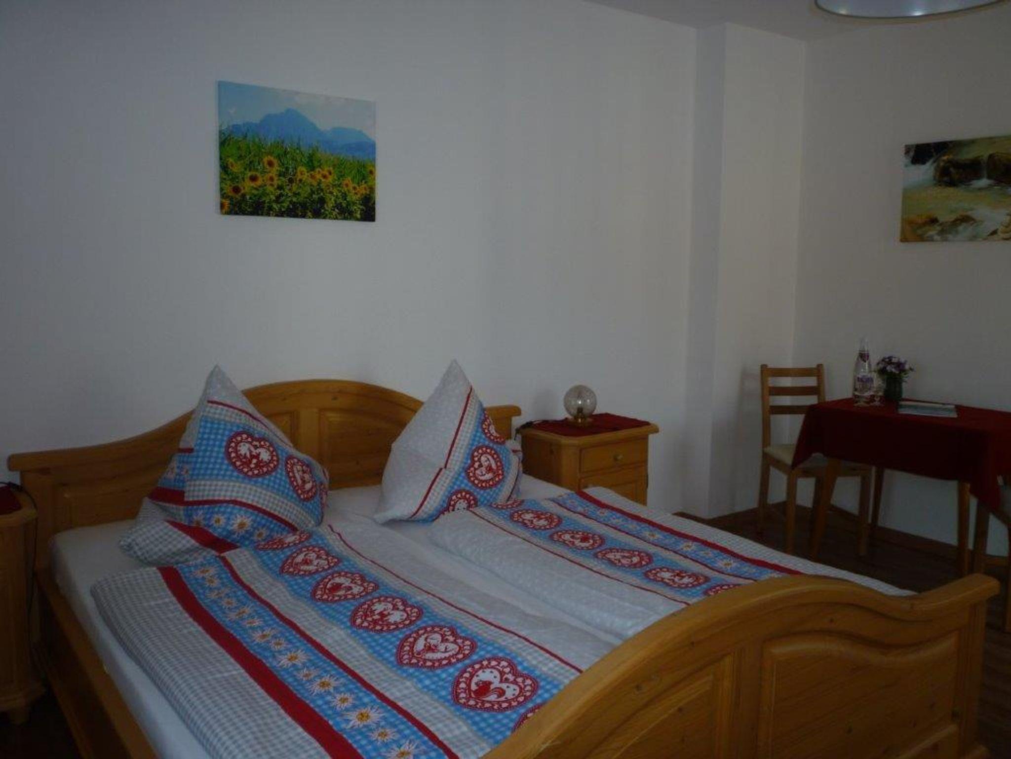 Das gemütliche Doppelzimmer im Erdgeschoss verfügt über ein Doppelbett und ist im bayerisch-rustikalen Stil eingerichtet. Es verfügt über Dusche/WC und Toilettenartikel sowie über einen Balkon bzw. eine Terrasse. Bettwäsche und Handtücher werden gestellt. Der Balkon bzw. die Terrasse sind mit Gartenmöbeln bestuhlt. Alle Zimmer haben einen direkten Blick auf die heimische Bergwelt und die umliegende Natur. Ein reichhaltiges Frühstück im gemütlichen Frühstücksraum ist im Preis inbegriffen.