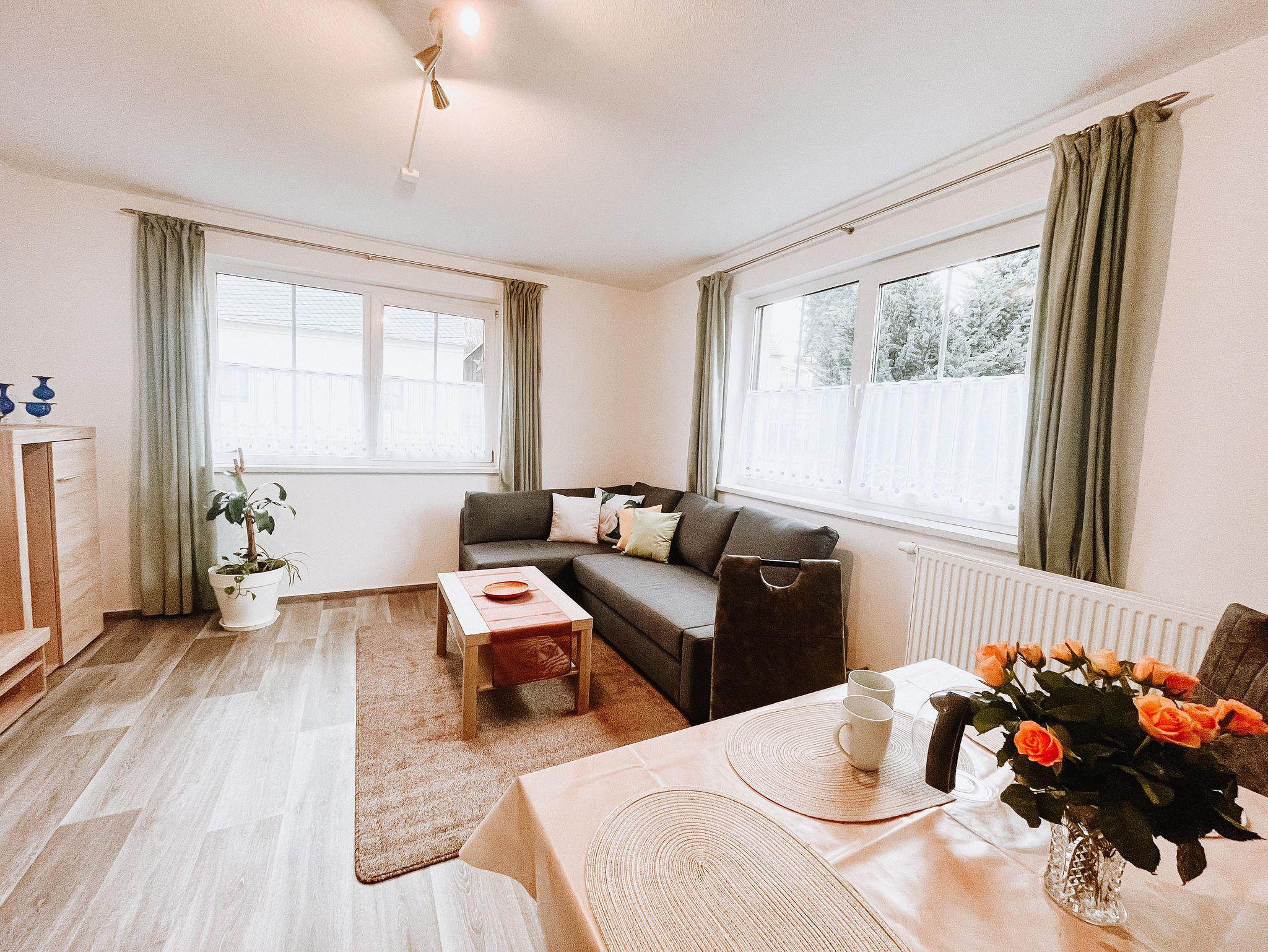 Die Ferienwohnung im Erdgeschoss ist ca. 60qm groß, ebenerdig und für 2-4 Personen geeignet. Sie ist ausgestattet mit einem Schlafzimmer mit Boxspringbett, einem Wohn- und Essbereich mit einer Schlafcouch, einer Küche sowie einem Bad mit Dusche und Wanne und einem separatem Waschplatz mit Toilette. Bei Bedarf kann ein Kinderbett von uns zur Verfügung gestellt werden. Die Küche besitzt einen Kühlschrank, eine doppelte Induktionskochplatte, Mikrowelle, Kaffeemaschine, Wasserkocher, Eierkocher, Toaster sowie einen kleinen Esstisch. Unsere Sauna kann gegen einen kleinen Aufpreis genutzt werden. Kostenlose Parkplätze befinden sich direkt auf dem Grundstück. Ihre Fahrräder oder Wintersportgeräte können Sie in einem Container (mit Ladestation für E-Bikes) auf dem Hof sicher und kostenlos abstellen.
