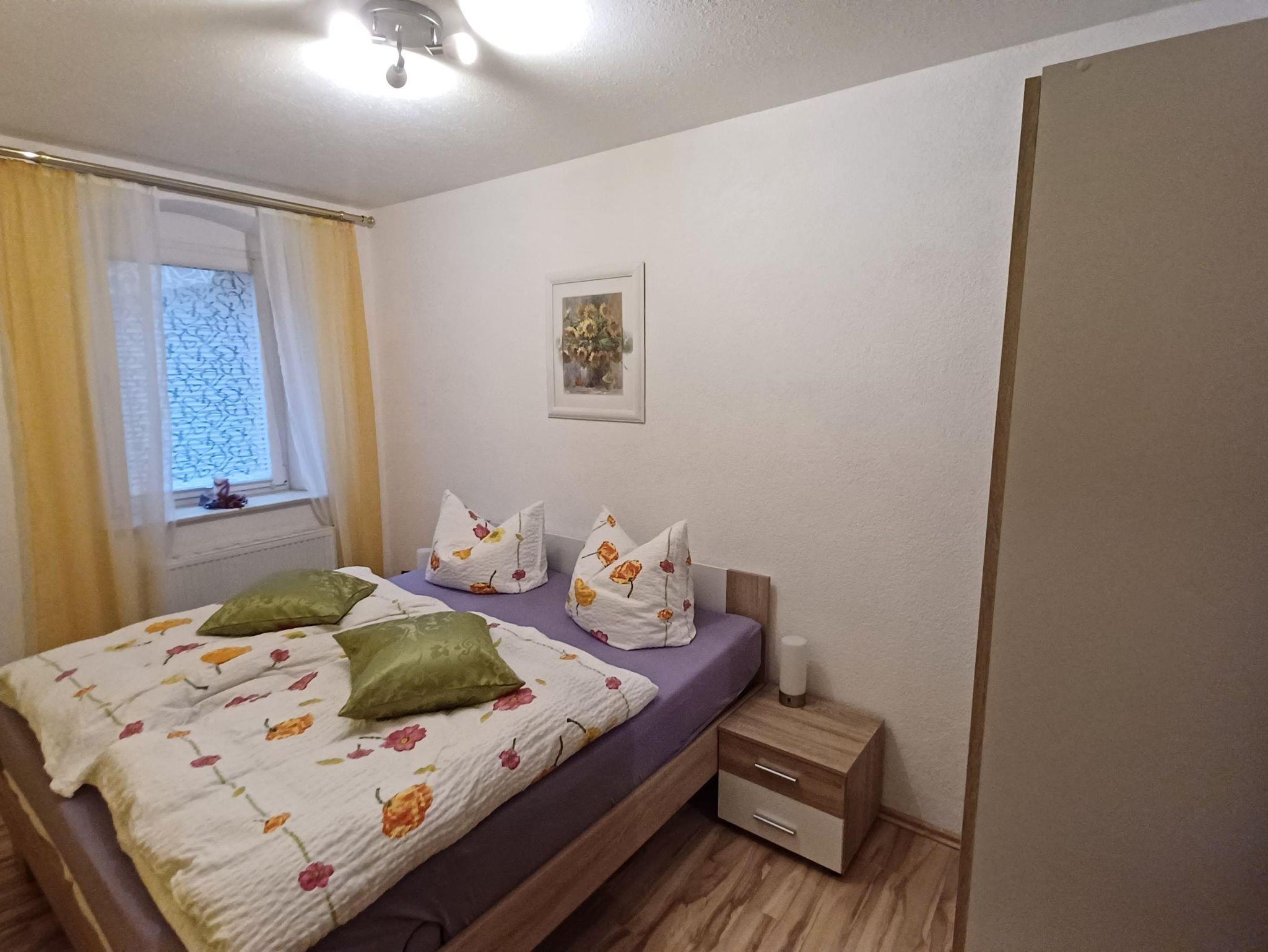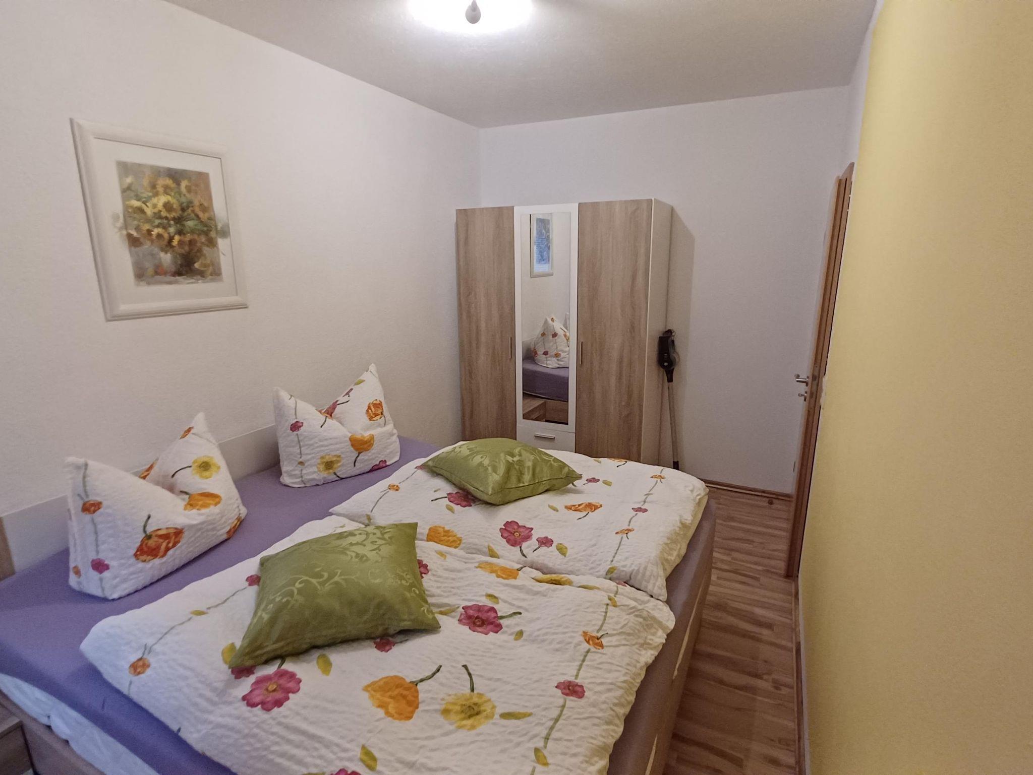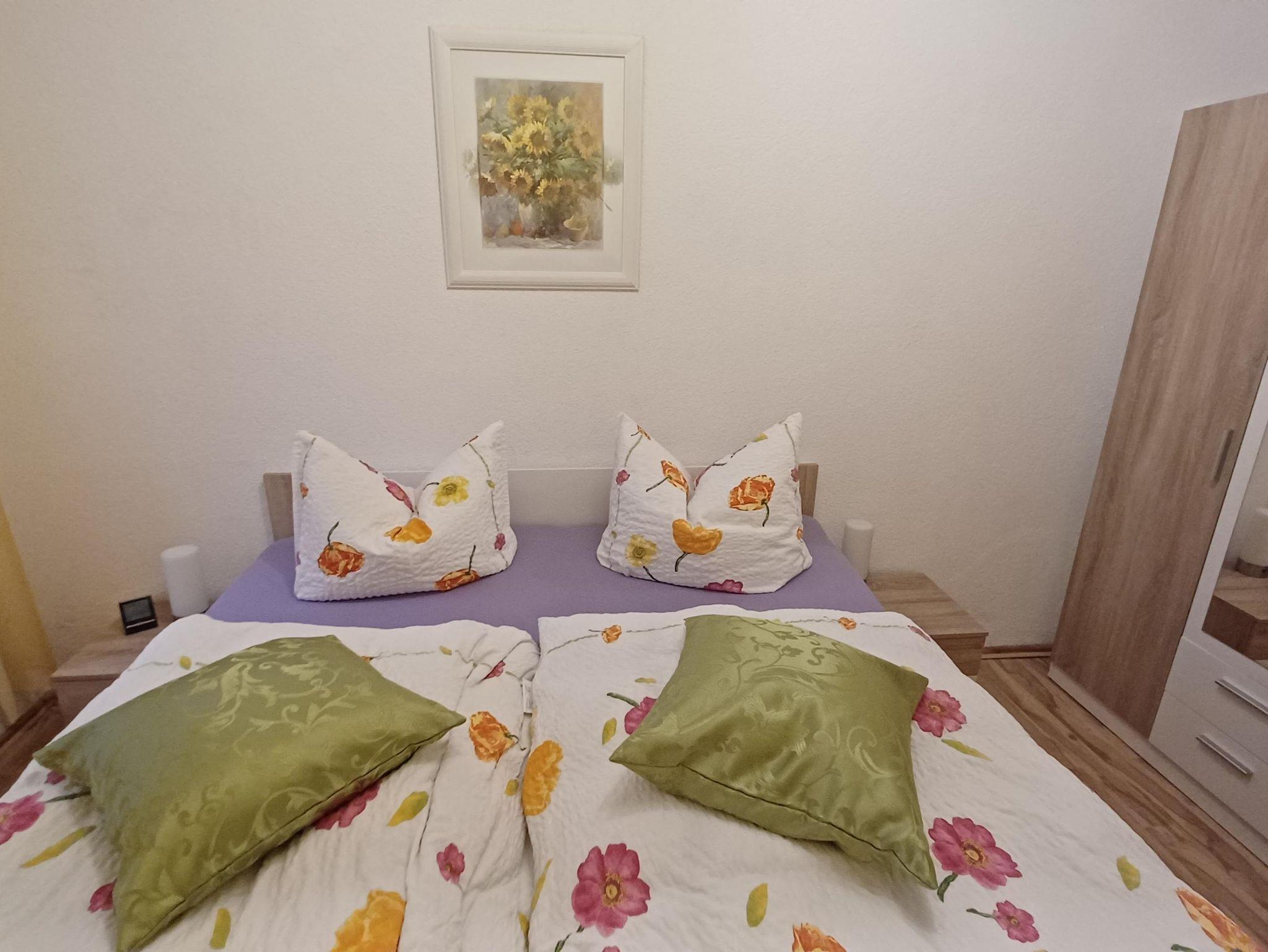 Zur Wohnung gehört ein gemütliches Schlafzimmer mit einem großen Doppelbett ,Kleiderschrank