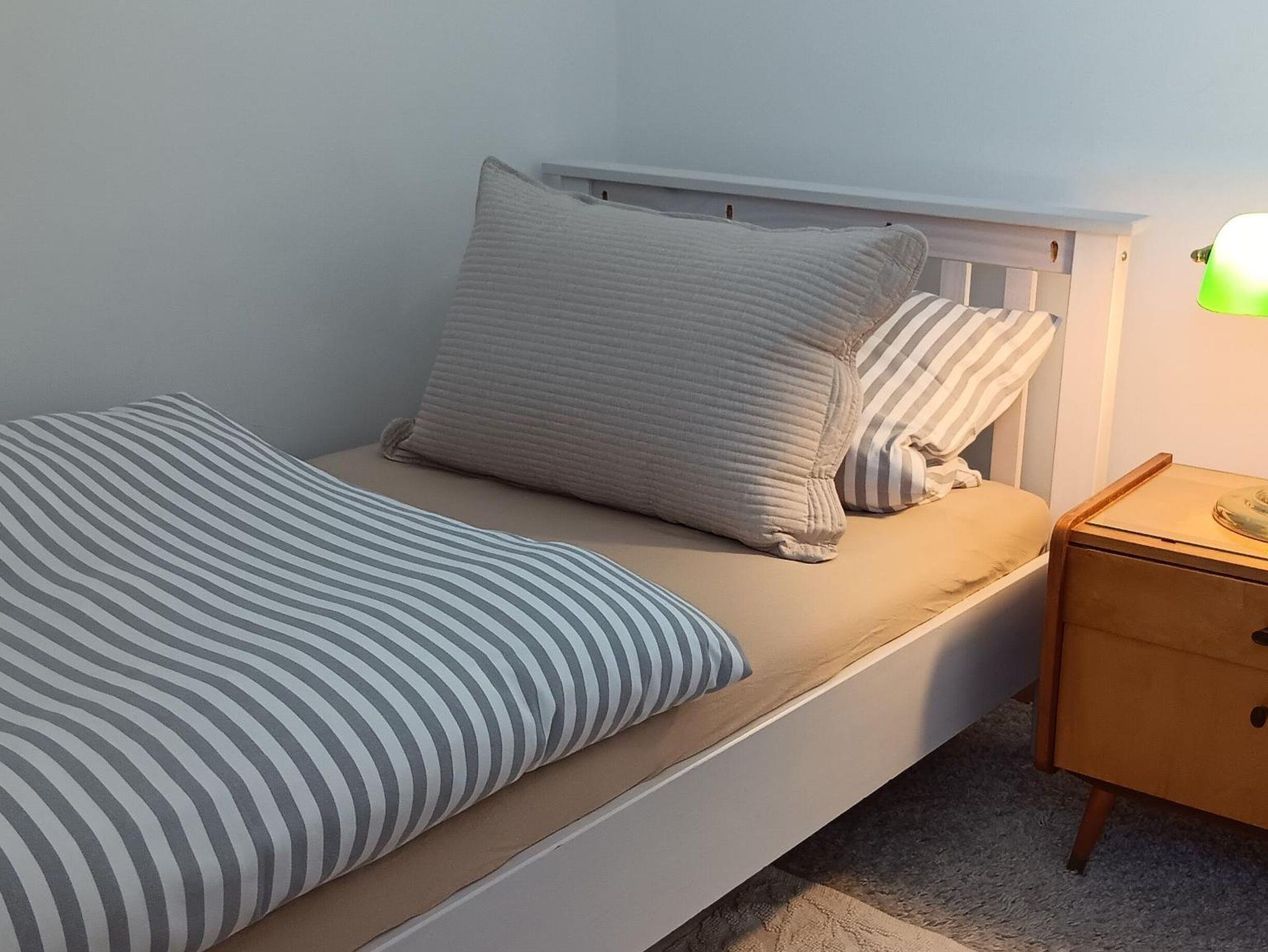 Die Ferienwohnung (79m²) befindet sich im 1 Stock. Sie verfügt über 3 Schlafzimmer, davon 2 Einzelzimmer und ein Doppelzimmer mit Doppelbett. Das großzügige Wohnzimmer ist mit einer verwandelbaren Schlafcouch für 2 Kinder bzw. 1 Erwachsenen und einem Fernseher ausgestattet. In der neuwertigen Küche finden Sie einen Kühlschrank mit Gefriertruhe, Geschirrspüler, Elektroherd (Ceran-Feld), Backofen, Kaffeemaschine, Kochtöpfe, Geschirr und Küchenwäsche. Das Badezimmer ist mit Badewanne, WC und Handtücher ausgestattet. Nutzung des Gartens möglich, Grill vorhanden. WLAN, Parkplatz und Endreinung sind inklusive.