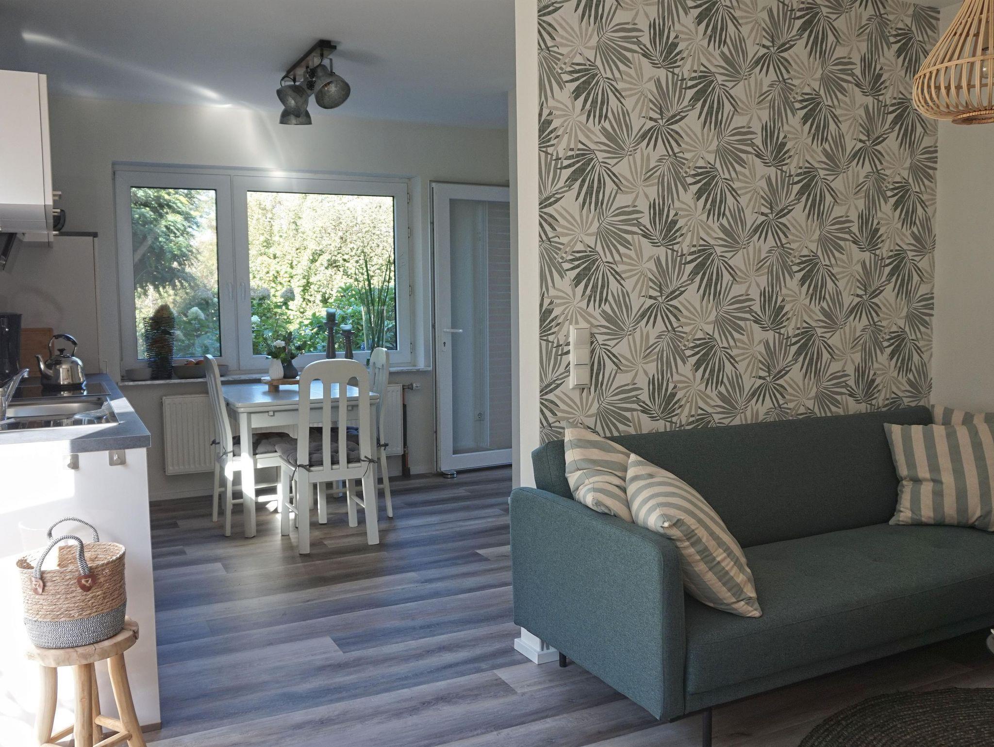 Liebevoll eingerichtetes Wohnzimmer, eine edle Küche mit Esstisch, ein helles Bad mit begehbarer Dusche. Die Wohnung verfügt über einen eigenen Eingang sowie einen Zugang zur überdachten Terrasse mit Gartenzugang.