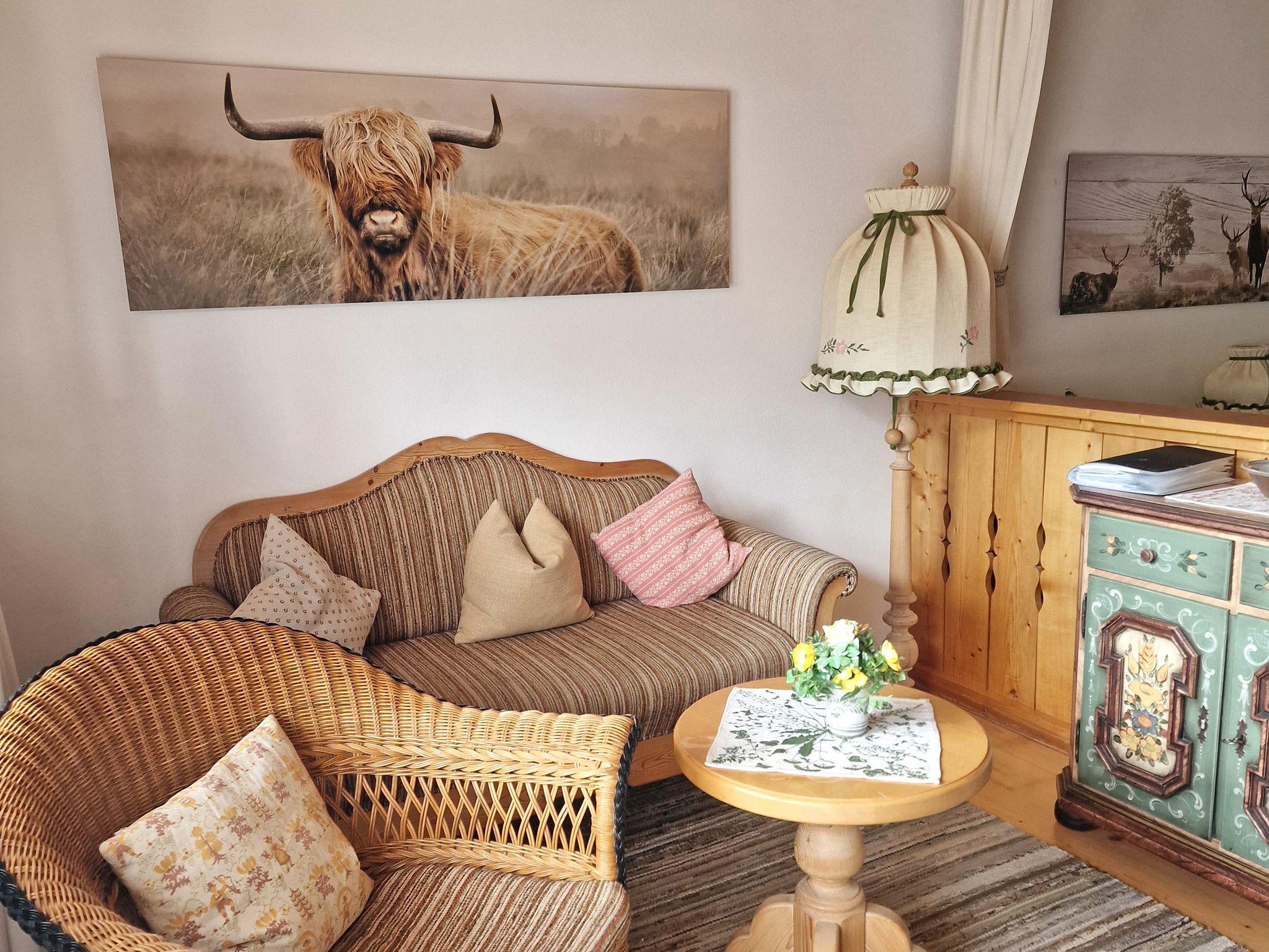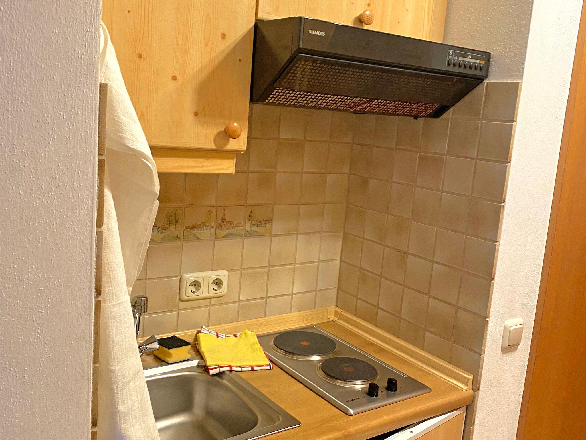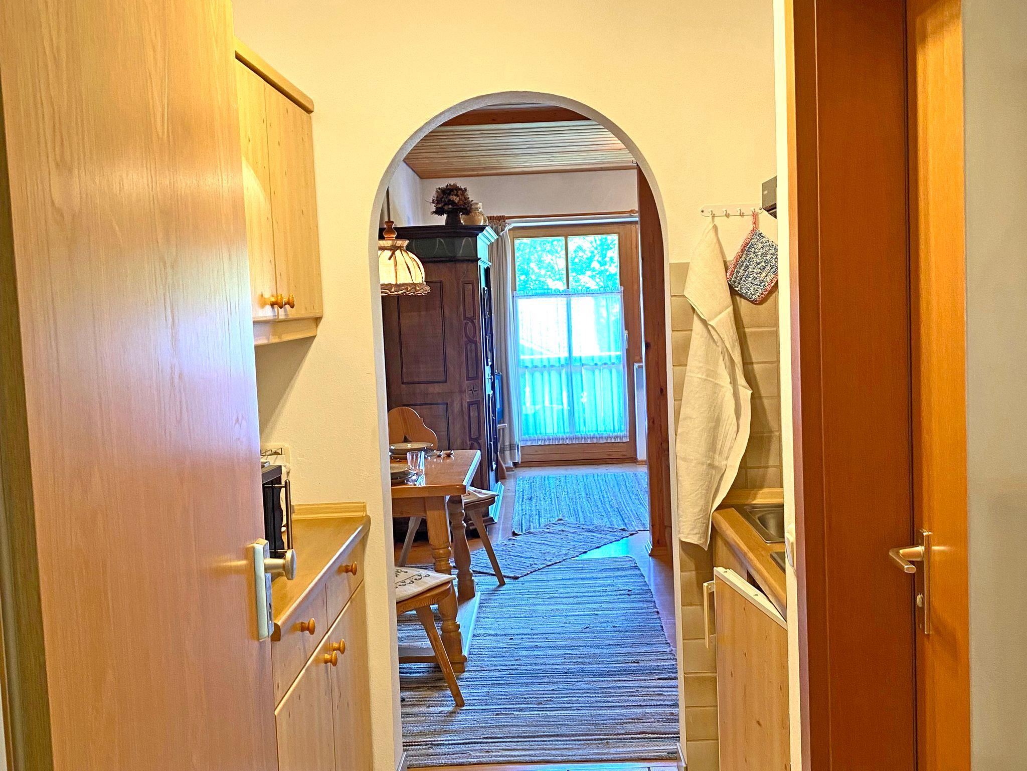 Die Ferienwohnung Sonnenschein mit 32 qm Wohnfläche für 2 Personen wurde zu einem offenen Wohnraum mit Schlafbereich aufgeteilt und wirkt durch ihr helles Holzmobiliar sehr freundlich. Der offene und große Wohnraum wurde optisch durch eine niedrige Holzwand zum Wohlfühlen getrennt. Auf der einen Seite zwei Einzelbetten 90 x 200 cm und auf der anderen Seite das gemütliche Wohnzimmer mit bequemer Couch, Flechtsessel, Flat-TV, kostenloses WLAN, ein schöner Esstisch für zwei Personen, ein Bauernschrank für Ihre Utensilien und Kleidung. Die Küchenzeile wurde in den Eingangsbereich der Wohnung integriert mit Kühlschrank/Tiefkühlfach, 2fach-Kochplatte, Mikrowelle, Kaffeemaschine, Toaster, Wasserkocher und ist mit Küchengegenständen wie Geschirr, Gläser, Besteck, Pfannen, Töpfen etc. ausgestattet. Badezimmer mit Dusche/WC und Fön. Der Süd-West-Balkon mit Blick auf die Berge lädt zum Entspannen ein.