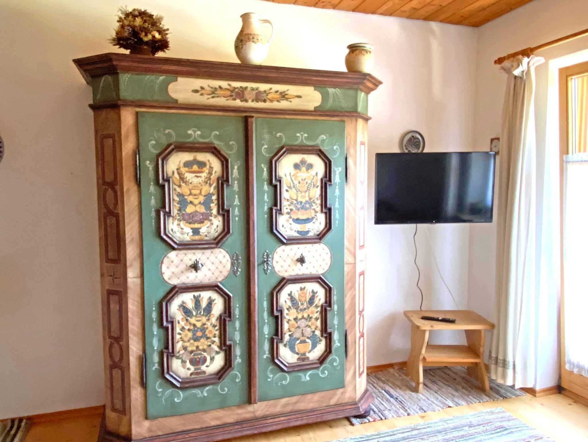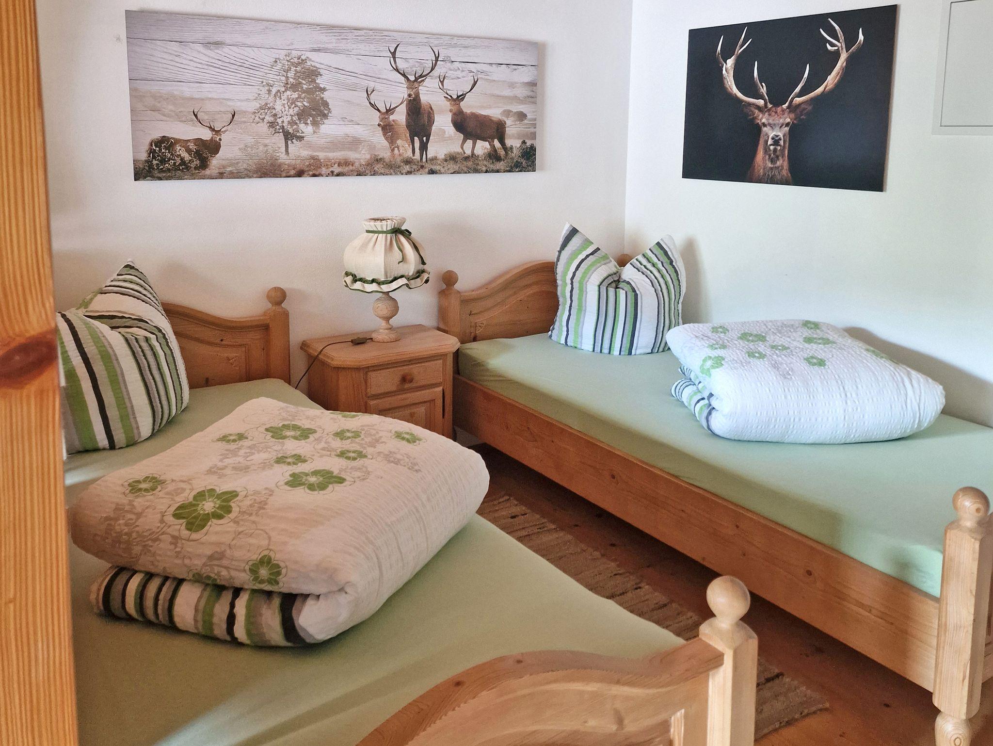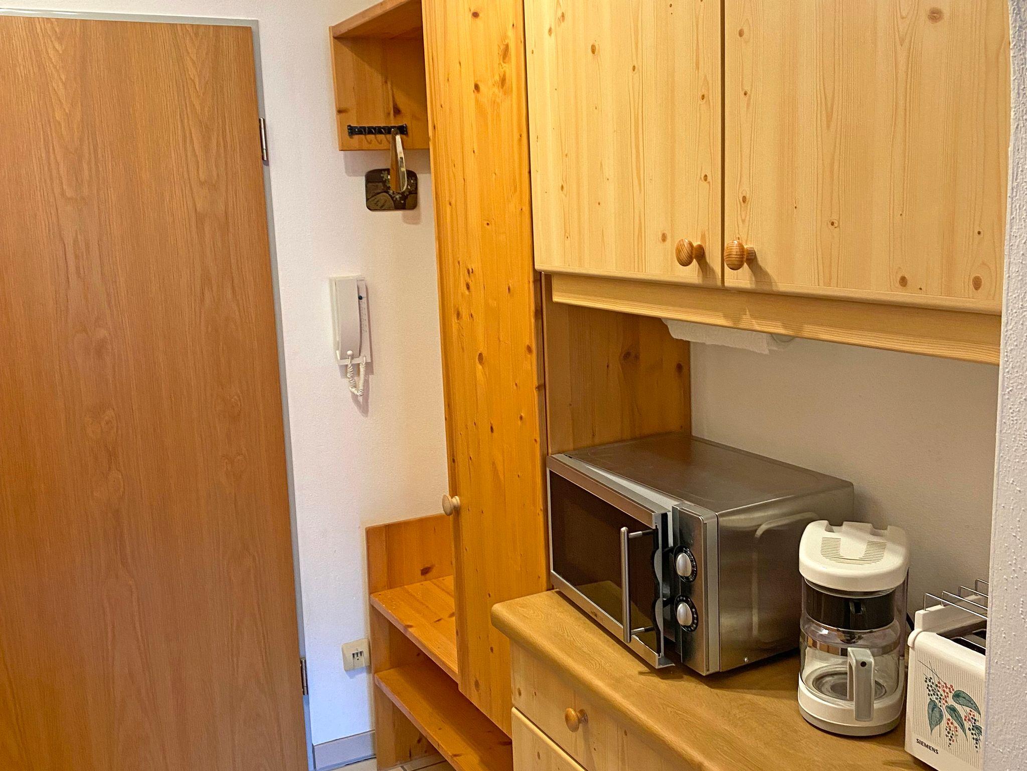 Die Ferienwohnung Sonnenschein mit 32 qm Wohnfläche für 2 Personen wurde zu einem offenen Wohnraum mit Schlafbereich aufgeteilt und wirkt durch ihr helles Holzmobiliar sehr freundlich. Der offene und große Wohnraum wurde optisch durch eine niedrige Holzwand zum Wohlfühlen getrennt. Auf der einen Seite zwei Einzelbetten 90 x 200 cm und auf der anderen Seite das gemütliche Wohnzimmer mit bequemer Couch, Flechtsessel, Flat-TV, kostenloses WLAN, ein schöner Esstisch für zwei Personen, ein Bauernschrank für Ihre Utensilien und Kleidung. Die Küchenzeile wurde in den Eingangsbereich der Wohnung integriert mit Kühlschrank/Tiefkühlfach, 2fach-Kochplatte, Mikrowelle, Kaffeemaschine, Toaster, Wasserkocher und ist mit Küchengegenständen wie Geschirr, Gläser, Besteck, Pfannen, Töpfen etc. ausgestattet. Badezimmer mit Dusche/WC und Fön. Der Süd-West-Balkon mit Blick auf die Berge lädt zum Entspannen ein.