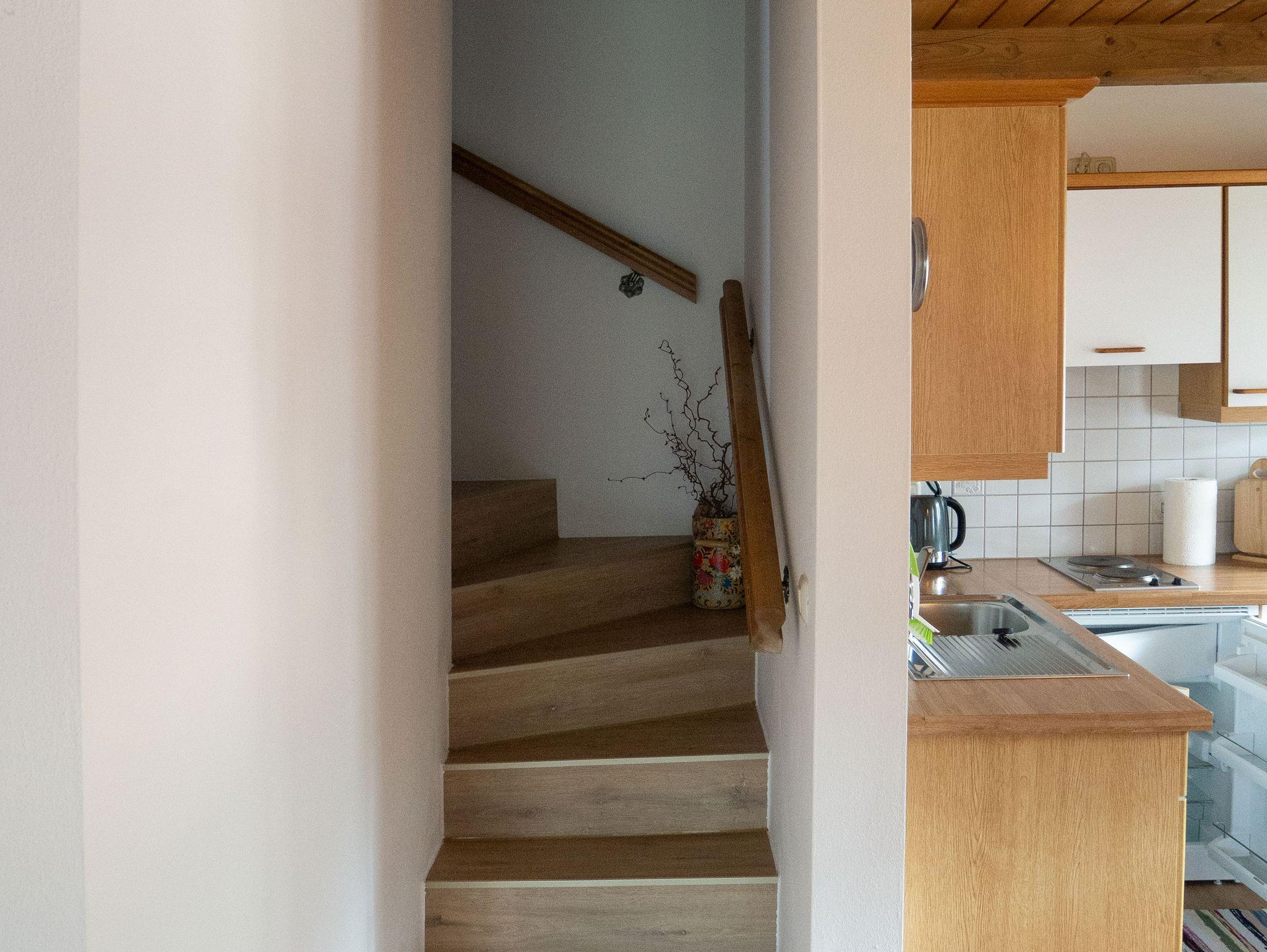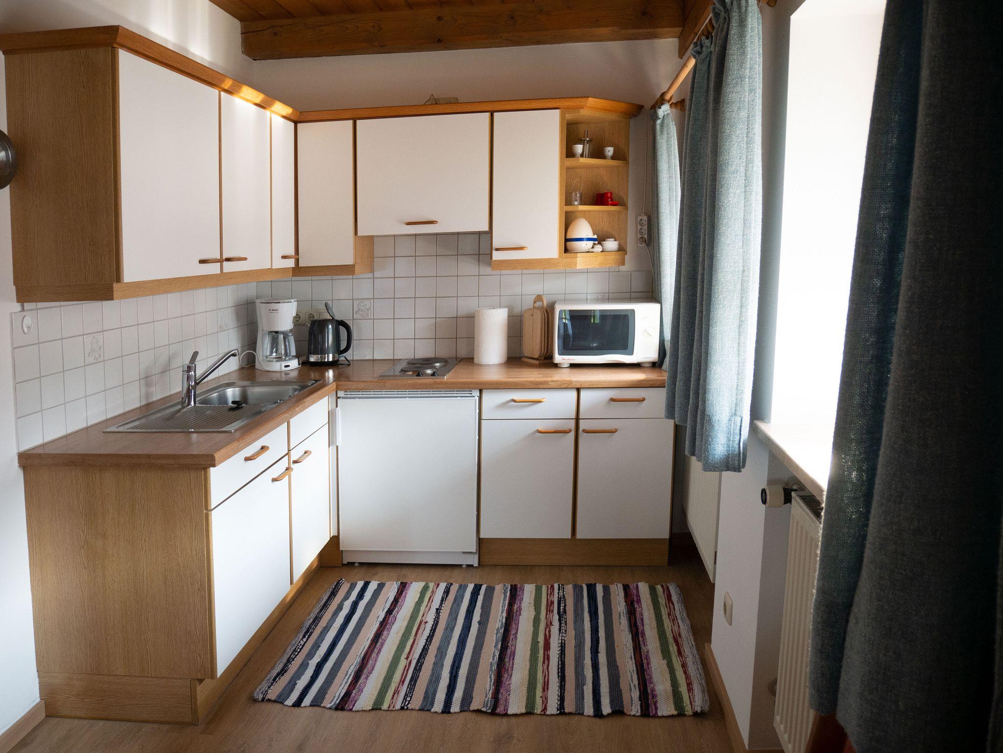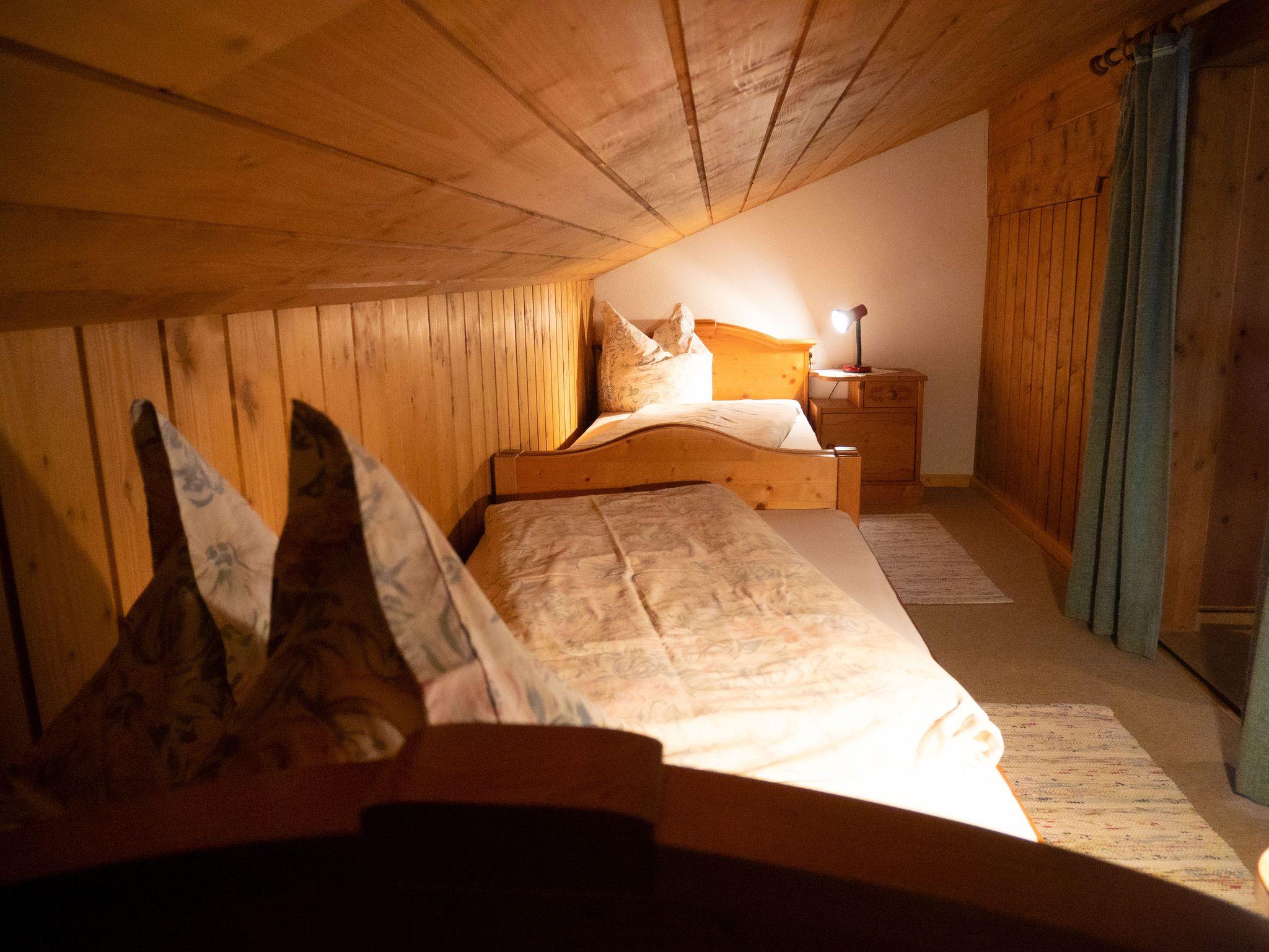 Unsere großzügige, im alpenländischen Stil liebevoll eingerichtete Ferienwohnung mit 75?m² erstreckt sich über das 2. Obergeschoss und das Dachgeschoss und bietet damit viel Raum für Familien oder befreundete Reisende, die den bäuerlichen Flair genießen möchten. Im 2. OG empfängt Sie ein gemütlicher Wohnbereich mit warmen Holzakzenten, einem ausziehbaren Schlafsofa, Flat-Kabel-TV und kostenlosem WLAN. Die offene Kochnische ist mit Kühlschrank und Tiefkühlfach, Mikrowelle, Zwei-Platten-Kochfeld, Filterkaffeemaschine, Wasserkocher und Toaster ausgestattet und lädt dazu ein, gemeinsam zu kochen und den Tag in der einladenden Essecke ausklingen zu lassen. Ein separates Gäste-WC sowie der Süd-/West-Balkon, auf dem Sie die Abendsonne und den Blick über Wiesen und Berge genießen können, runden diese Etage ab. Im Dachgeschoss erwartet Sie ein großzügiges Schlafzimmer für bis zu fünf Personen – mit einem Doppelbett, einem Einzelbett sowie zwei weiteren Einzelbetten in einer gemütlichen Schlafnische, die besonders bei Kindern beliebt ist. Das moderne Badezimmer mit Dusche, WC und Dachfenster sorgt für Licht und Wohlbefinden, während ein weiterer Balkon den Blick in die Natur öffnet. Die gesamte Wohnung ist mit Parkettboden gestaltet und vermittelt ein Gefühl von Wärme und Geborgenheit. Bettwäsche und Handtücher sind inklusive. Im Haus stehen Ihnen Waschmaschine und Wäschetrockner gegen Gebühr zur Verfügung. Bitte beachten Sie, dass Haustiere nicht erlaubt sind.