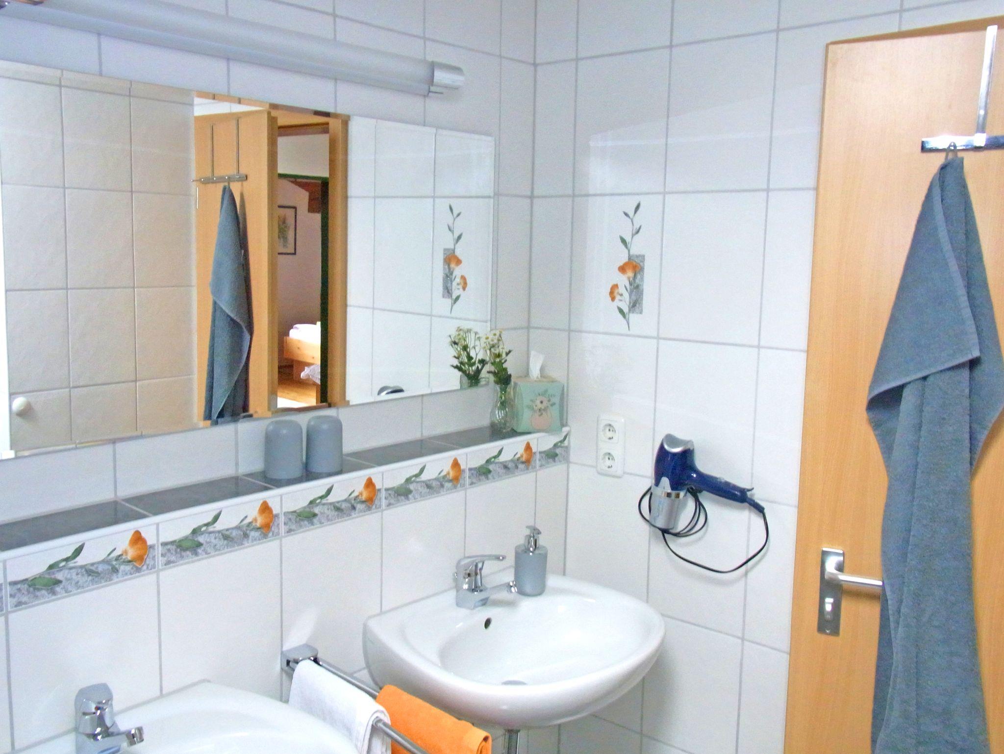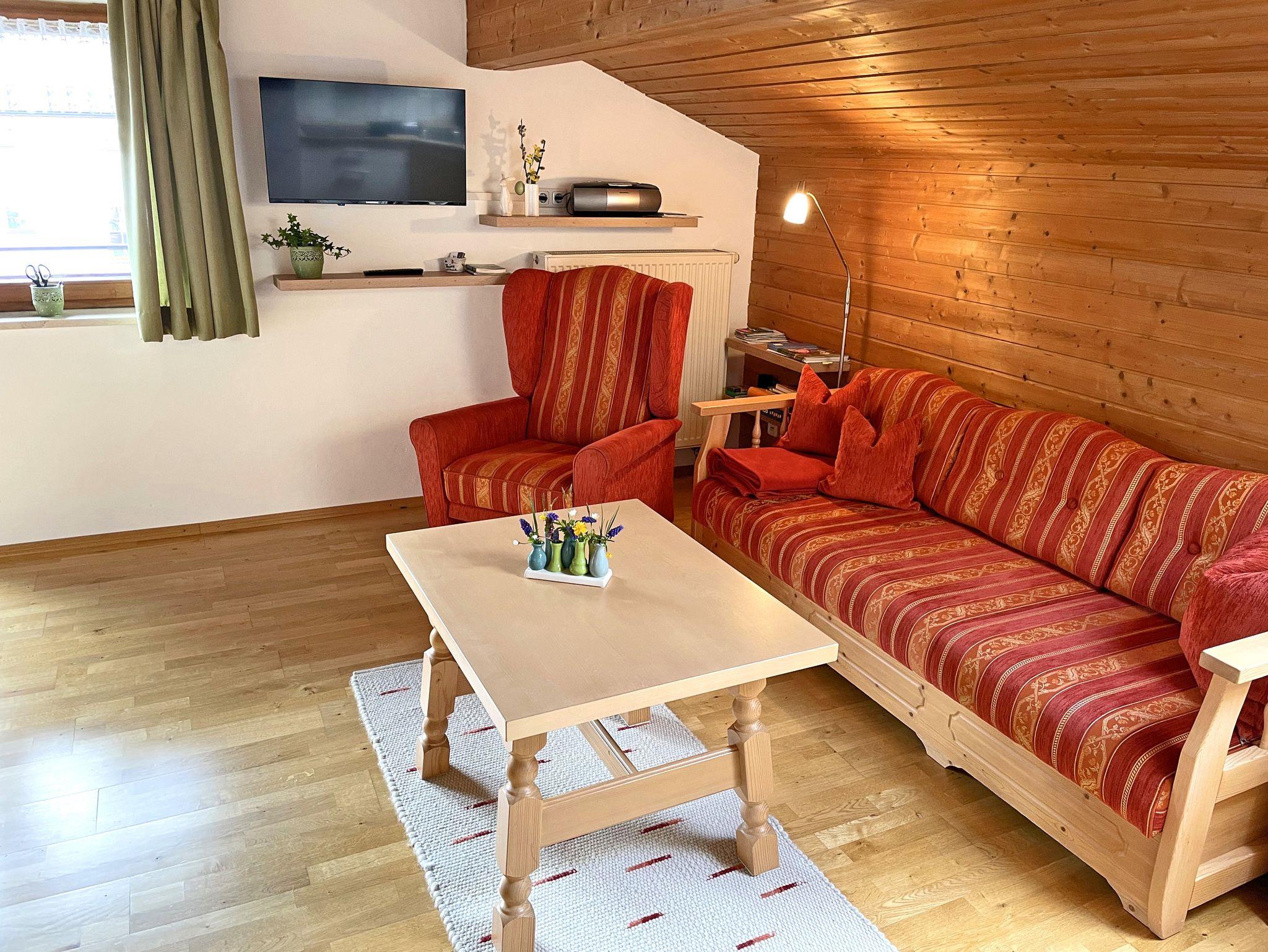 Komfortable, gemütliche Ferienwohnung mit Parkettboden im 2. Obergeschoss und großem überdachtem Ostbalkon mit herrlichem Ausblick auf die Berge. Zwei extra Schlafzimmer, ein Schlafzimmer mit Doppelbett und ein Schlafzimmer mit zwei Einzelbetten, die auch zusammengeschoben werden können. Auf Anfrage kann ein Kinderbett aufgestellt werden. Gemütlicher Wohnraum mit Küchenzeile, Spülmaschine, Backofen, einer Eckbank, Stühle und Tisch zum Essen (Kinderhochstuhl möglich) und eine Couch-Sitzgruppe, SAT-TV, kostenloses WLAN und Radio. Badezimmer mit Dusche/WC und Fön. Für Kinder: Spielwiese und Kinderfuhrpark am Haus. Haustiere dürfen nicht mitgebracht werden.