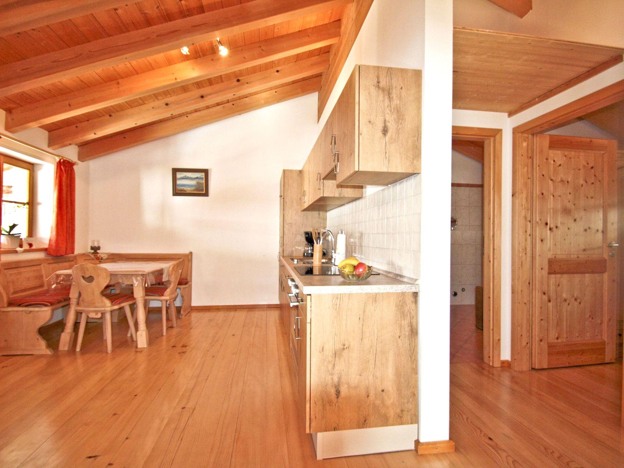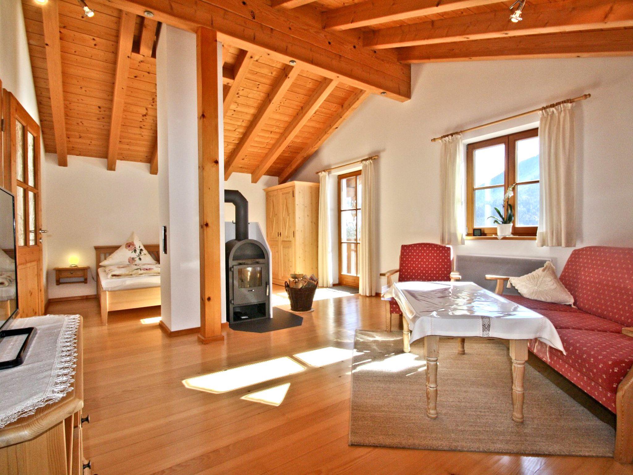 Gemütliche, äußerst idyllische, ländlich gelegene Nichtraucher-Ferienwohnung Kampenwandblick, 74 qm, befindet sich im 1. Stock mit separatem Eingang über eine Außentreppe. Der in der gesamten Wohnung verlegte Echtholz-Fußboden und der helle Sicht-Dachsstuhl sorgen für eine sehr wohnliche Atmosphäre. Zwei Balkone nach Süd-Osten und nach Süd-Westen laden zum Verweilen ein und geben den Blick frei in die umliegende Bergwelt. Wohnküche mit Essecke, Spülmaschine, E-Herd mit Backofen, Kühlschrank mit Gefrierfach, Toaster, Wasserkocher und Kaffeemaschine. Das Wohnzimmer ist vom Schlafzimmer räumlich durch einen Holzofen und der Kaminmauer abgetrennt. Wohnzimmer mit Sofa, Sessel, Tisch, TV/SAT, DVD, kostenloses WLAN, Zentralheizung und Holzofen (extra Kosten für Holz), Schlafzimmer mit Doppelbett und Kleiderschrank. Zweites separates Schlafzimmer mit einem Stockbett und Kleiderschrank. Badezimmer mit Dusche/WC und Fön.