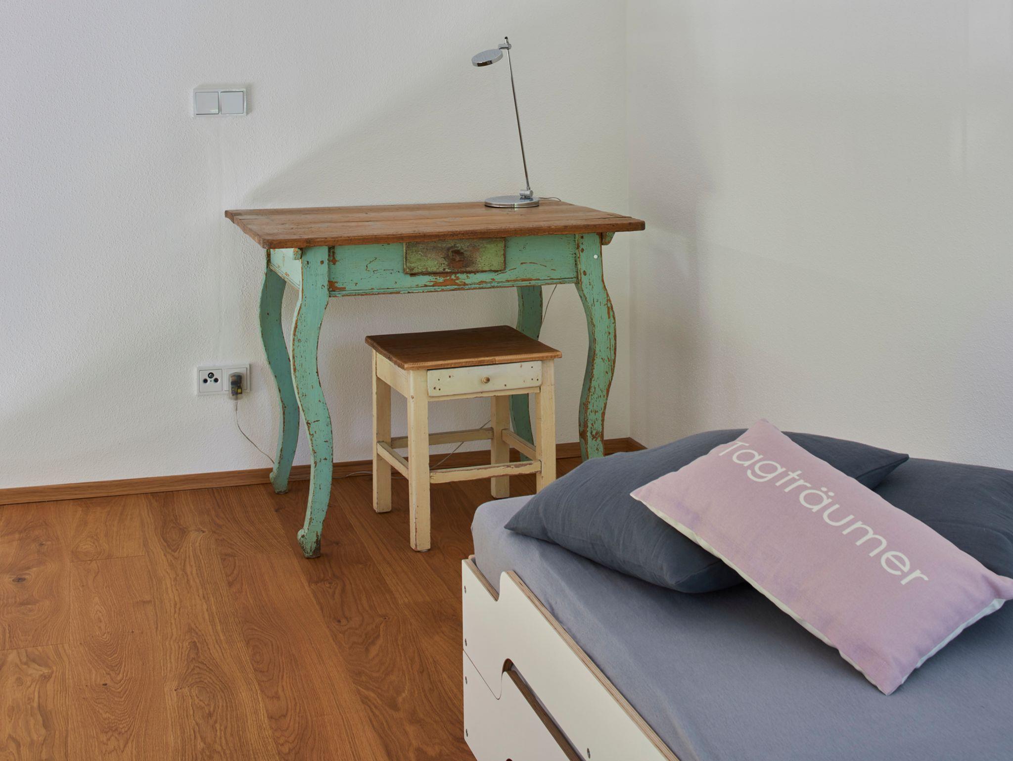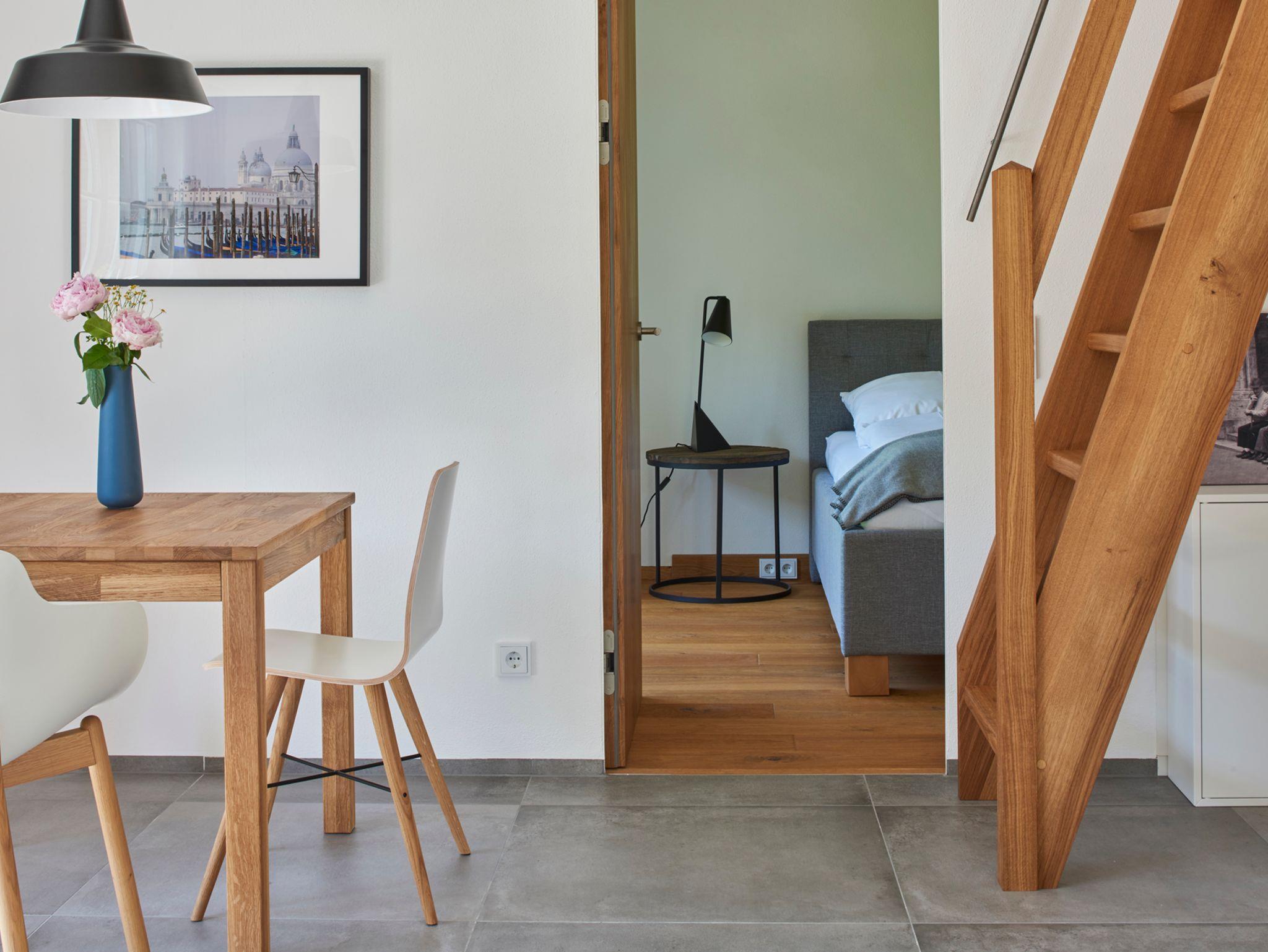 Wer mag, urlaubt auf zwei Ebenen: Vom Wohnbereich mit Essplatz und „Chill out Area“ (Couch + Sat TV, kostenloses WLAN und Internetanschluss) führt eine sportlich-steile (!) Treppe hinauf zur Galerie, wo zwei weitere Einzelbetten und ein kleiner Schreibtisch mit Hocker auf müde Häupter warten. - Kommen Sie doch herein, es wird Ihnen gefallen.