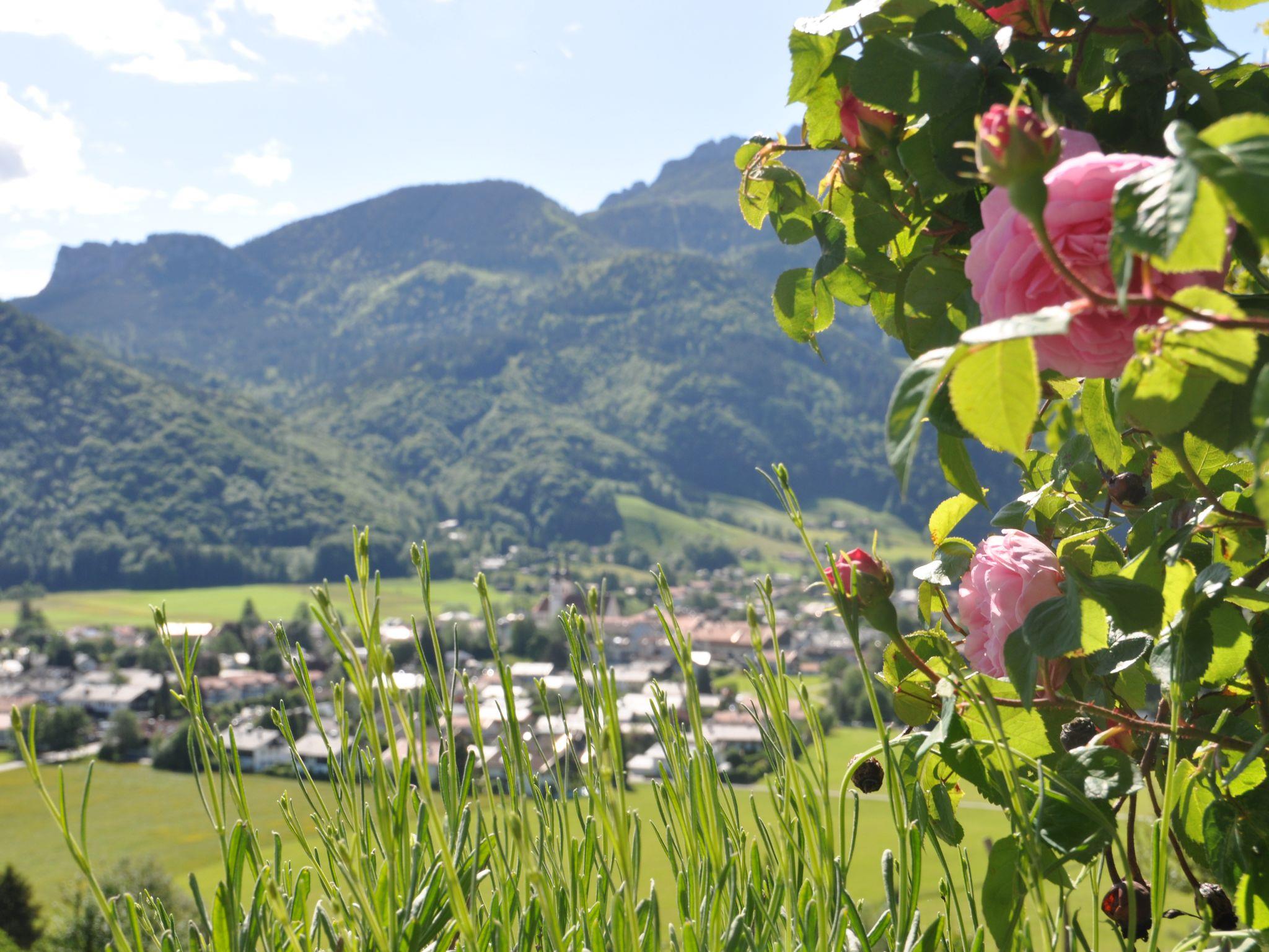 Gemütliche Nichtraucher Ferienwohnung (1.Stock) mit Parkettböden, mit zwei separaten Schlafzimmern mit Doppelbett, in einem Schlafzimmer ist ein zusätzliches Einzelbett. Wohnküche mit Eckbank, SAT-TV, W-LAN und Kochnische, Dusche und WC, Parkettböden, Südbalkon, separater Eingang und eigener Parkplatz. Freisitz im Bauerngarten mit Panoramablick auf Aschau, Kampenwand und Schloss Hohenaschau.