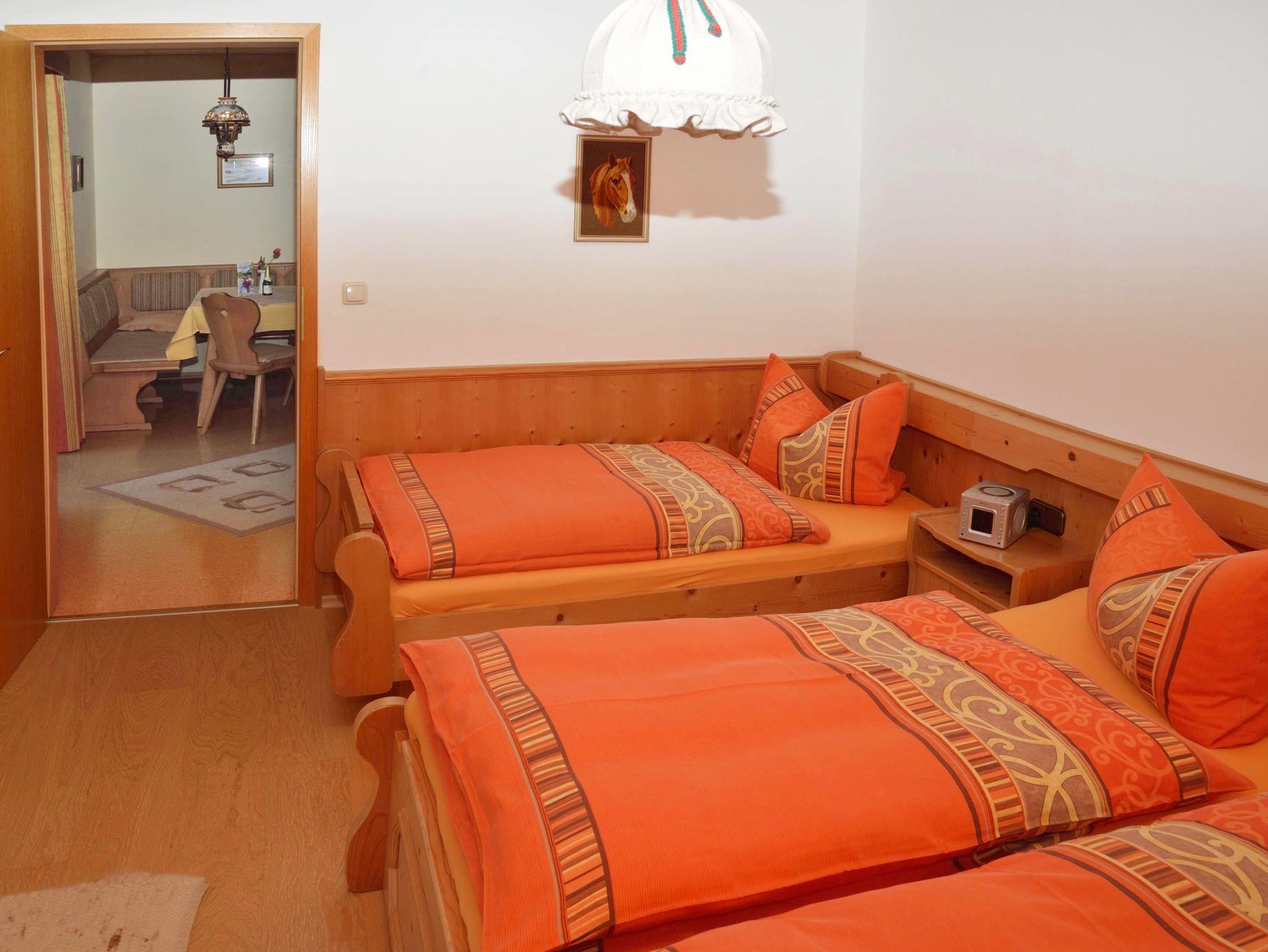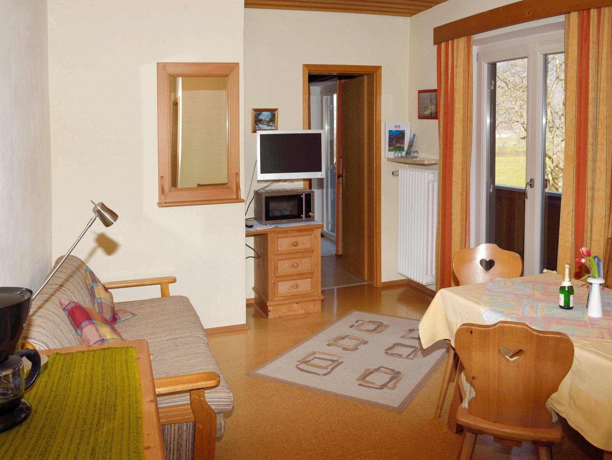 Gemütlich komfortabel und liebevoll eingerichtete Ferienwohnung (50 qm) im 1. Obergeschoss mit großem Ost-Balkon und herrlichem Gebirgsblick. Separates Schlafzimmer mit einem Doppelbett 1,8 m x 1,8 m und einem Einzellbett. Komplett ausgestattete Wohnküche mit Kaffeemaschine, Toaster, Ausziehcouch, Kabel-HD-TV und kostenloses WLAN. Badezimmer mit Dusche/WC. Handtücher und Bettwäsche stehen zur Verfügung. Gerne dürfen Sie gegen Aufpreis einen Hund mitnehmen.
