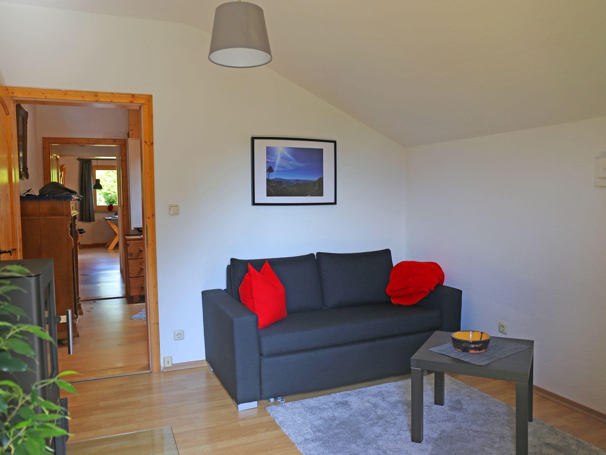 Der Aufgang in die 88 qm Wohnung führt über eine große West-Terrasse mit separatem Wohnungseingang. Die Wohnung verfügt über 4,5 Zimmer mit zwei Bädern, Westterrasse und Südbalkon und erstreckt sich über den ganzen ersten Stock eines Einfamilienhauses. Küche mit Vollausstattung, wie Kühl- und Gefrierschrank, Spülmaschine, Herd mit Backofen und Ceranfeld, Mikrowelle mit Mikrowellengeschirr, Nespresso Kaffeemaschine, Filterkaffeemaschine, Toaster, Wasserkocher und inklusive aller notwendigen Kochutensilien, einem großzügig gestalteten Essbereich sowie einem gemütlichen Ohrensessel zum Relaxen. Ein kleiner weiterer Raum, welcher als Bibliothek dient, lädt zum Entspannen ein, und verfügt über eine angenehme, entspannende Sitzgelegenheit. Wohnzimmer mit ausziehbarer Schlafcouch, Schwedenofen, Flachbild TV, kostenloses WLAN und direkter Zugang auf den Südbalkon. Zwei Schlafzimmer mit Doppelbetten: 1 x 2,00 m x 2,00 m und im zweiten 1,80 m x 2,00 m. Ein großes Bad mit Dusche, Duschsitz, WC und ein kleineres Bad beim zweiten Schlafzimmer mit Dusche/WC und Waschbecken. Bettwäsche und Handtücher sind vorhanden. Starterset für unsere Gäste: Kaffeekapseln, Tee, Zucker, Öl, Essig, Salz, Pfeffer, Toilettenpapier und Seife. Elektrogrill, Parkplatz direkt vor dem Haus, Garage für Abstellen der Räder, Garage auch separat anzumieten für Autounterbringung.