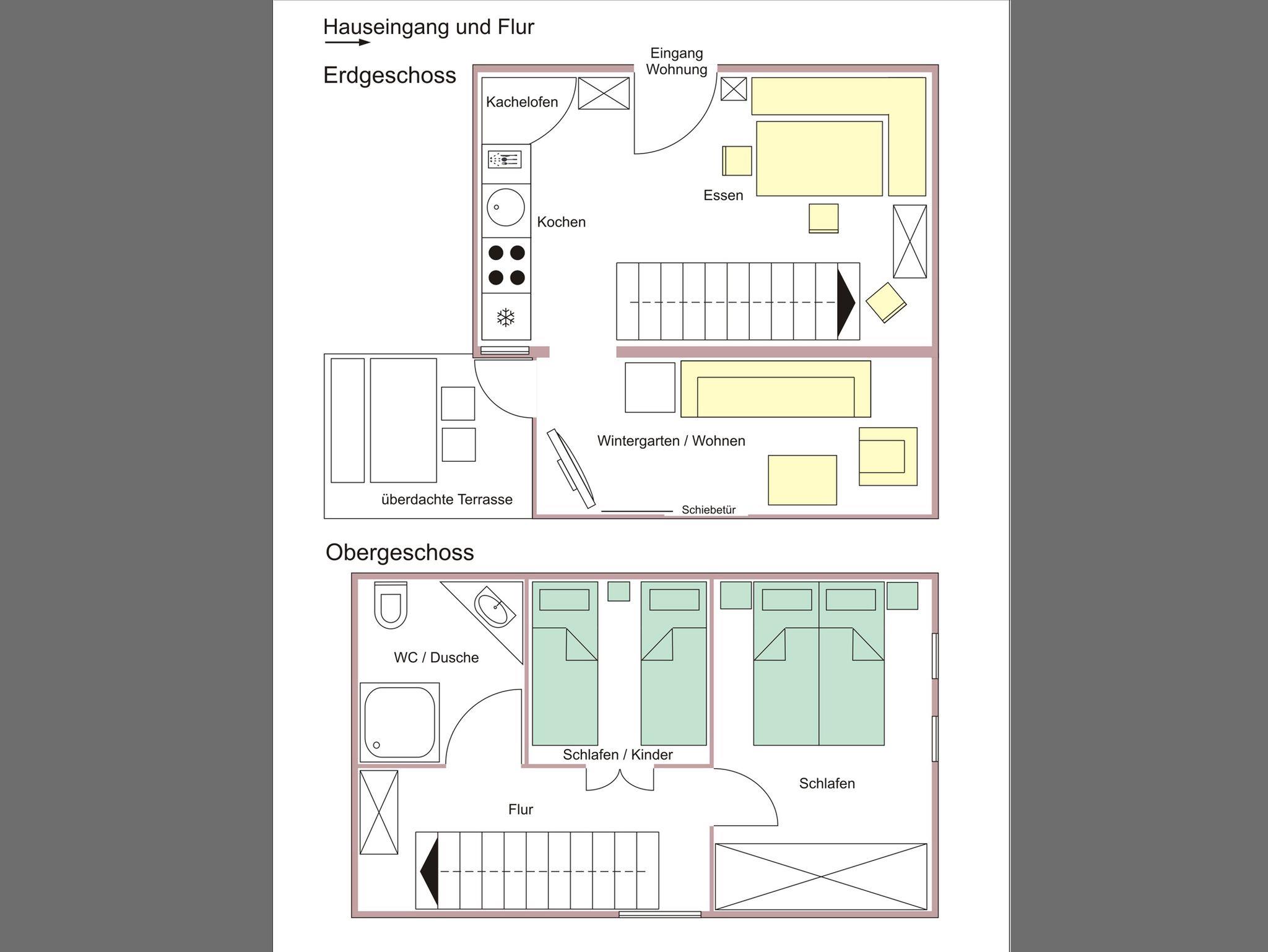 Unsere drei 5 Sterne Maisonette-Wohnungen sind jeweils für 4 Personen (max. 2 Erw. u. 2 Kinder) ausgelegt. Im EG befindet sich der Ess- und Wohnbereich, Wintergarten und eigene Terrasse. Im OG mit Sichtdachstuhl befinden sich die beiden Schlafräume, das Bad mit Zirbenpflegeprodukten, Kosmetikspiegel und ein Balkon.