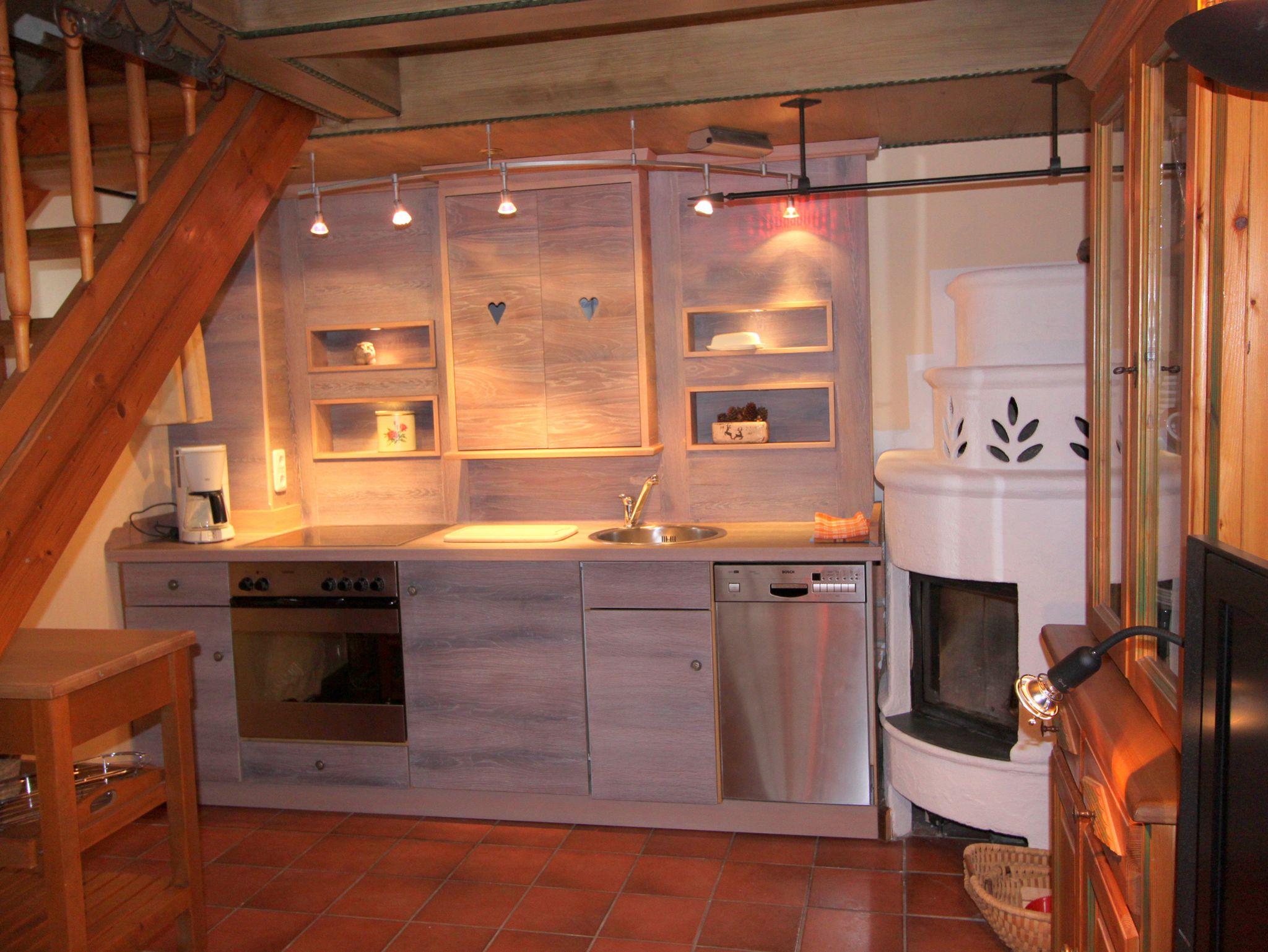 Vollausgestattete Küche. Der Kachelofen verbreitet wohlige Wärme in der kalten Jahreszeit.