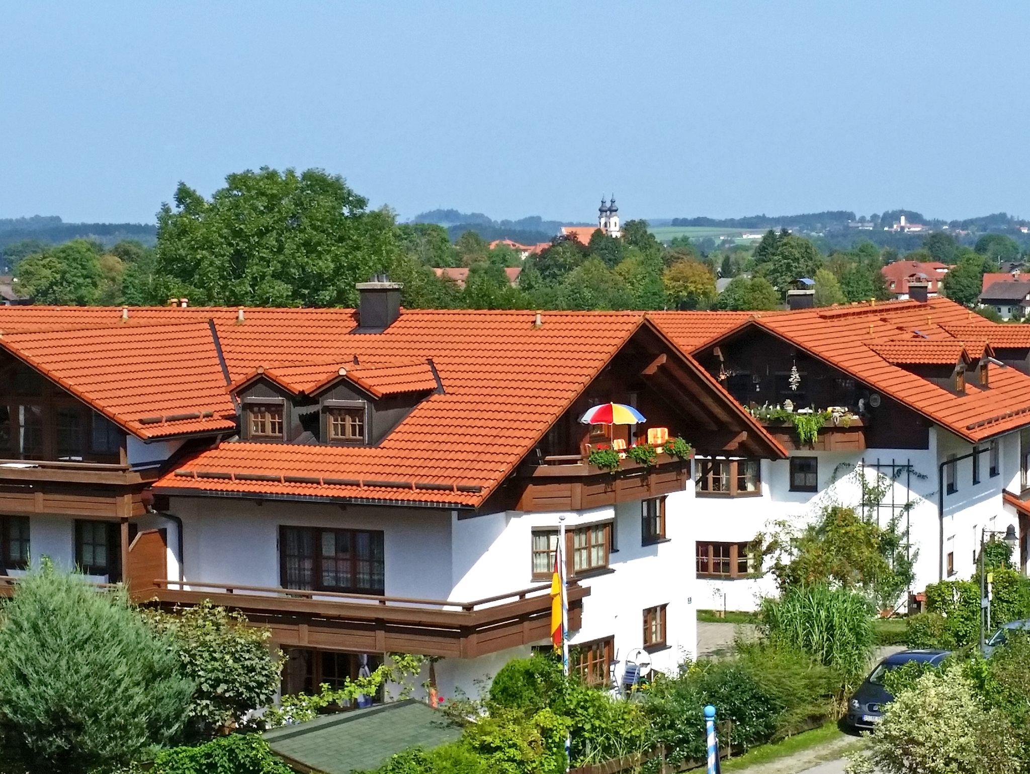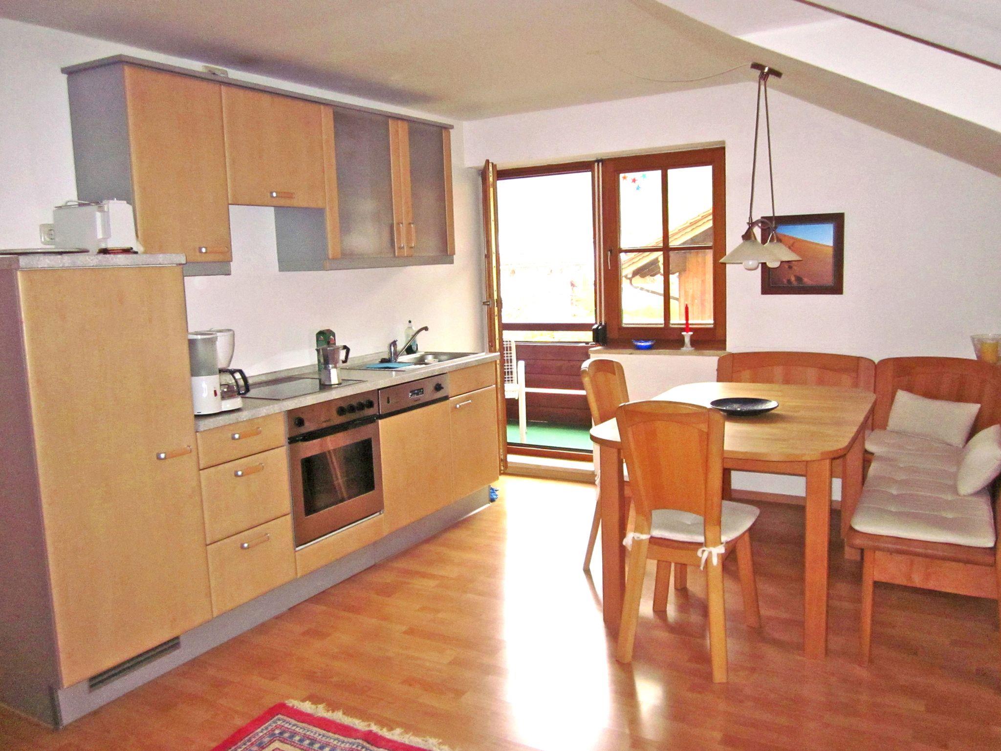 Sehr gemütlich eingerichtete, große, ruhige Nichtraucher Ferienwohnung, 75 qm im 2. Stock/Dachgeschoss. Wunderschöner Ost-Balkon mit Morgensonne und Blick auf Wald und Berge. Zwei getrennte helle Schlafzimmer, eines davon mit Balkonzugang. Ein Schlafzimmer verfügt über ein Doppelbett, das andere über zwei Betten, die wahlweise zum Doppelbett oder als zwei einzelne Betten gestellt werden können. Das helle Bad hat ein Fenster und sowohl Dusche als auch eine Badewanne und Föhn. Im Wohnzimmer befinden sich neben einem HD-Fernseher auch zwei Couchen, die ebenfalls ausgezogen und zum Schlafen genutzt werden können. Das großzügige Wohnzimmer lädt auch bei schlechtem Wetter zum Erholen ein, kostenloses WLAN. Die Fenster sorgen für sehr viel Licht. Spiele und Bücher sind ausreichend vorhanden. Vom Wohnzimmer aus gibt es ebenfalls einen Zugang zum Balkon, der mit gemütlichen Balkonmöbeln und einen Sonnenschirm ausgestattet ist. Daneben befindet sich eine geräumige Eckbank mit einem großen ausziehbaren Esstisch, an dem bequem 6 - 8 Personen Platz haben. Die offene Küche ist sehr gut ausgestattet mit Ceran-Herd, Backofen, Mikrowelle, Geschirrspüler, großem Kühlschrank mit Tiefkühlfach, Kaffeemaschine, Toaster usw. Im großen Waschkeller steht außerdem eine eigene Waschmaschine zur Verfügung. Babybett und Kinderbett kann auf Wunsch aufgestellt werden.